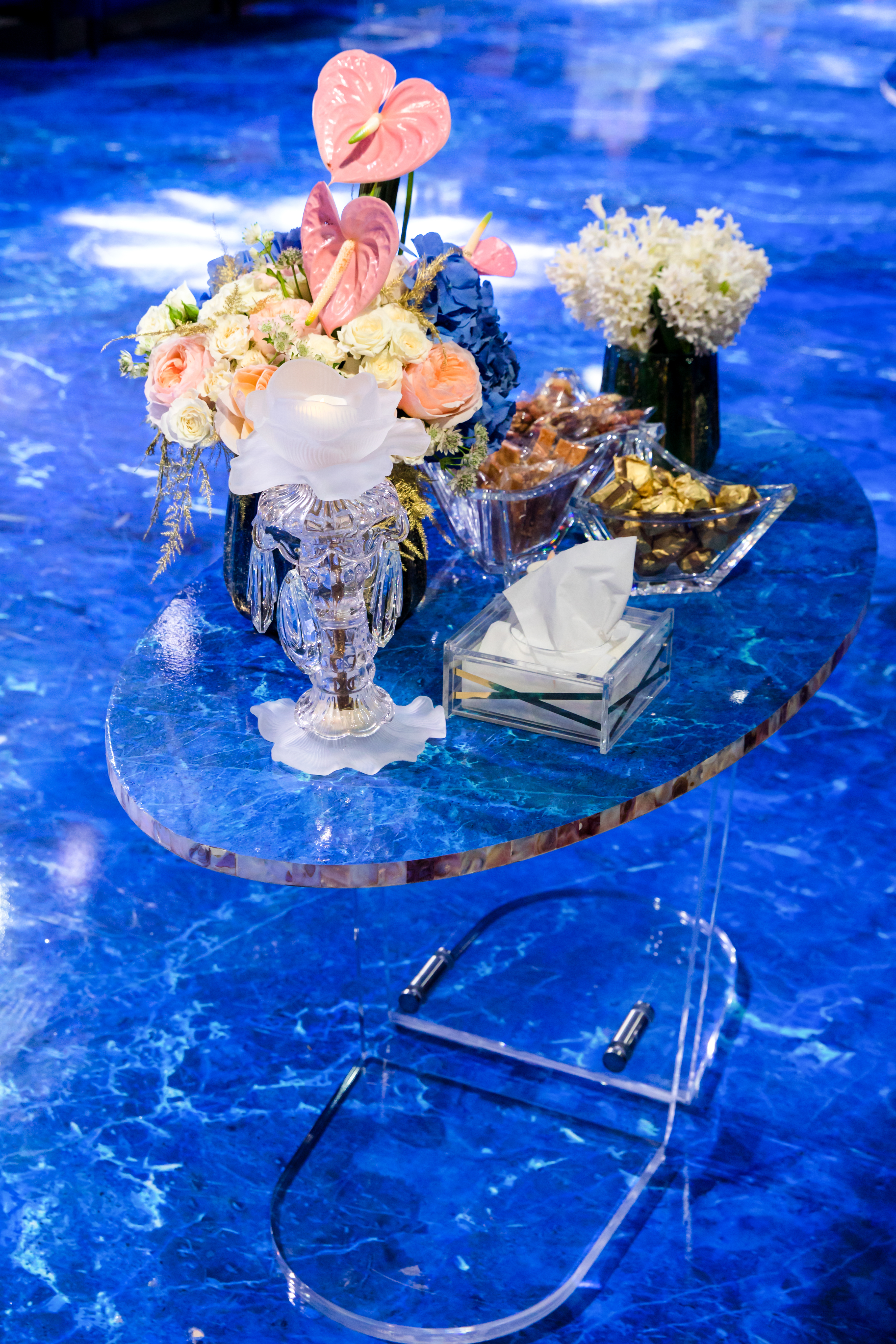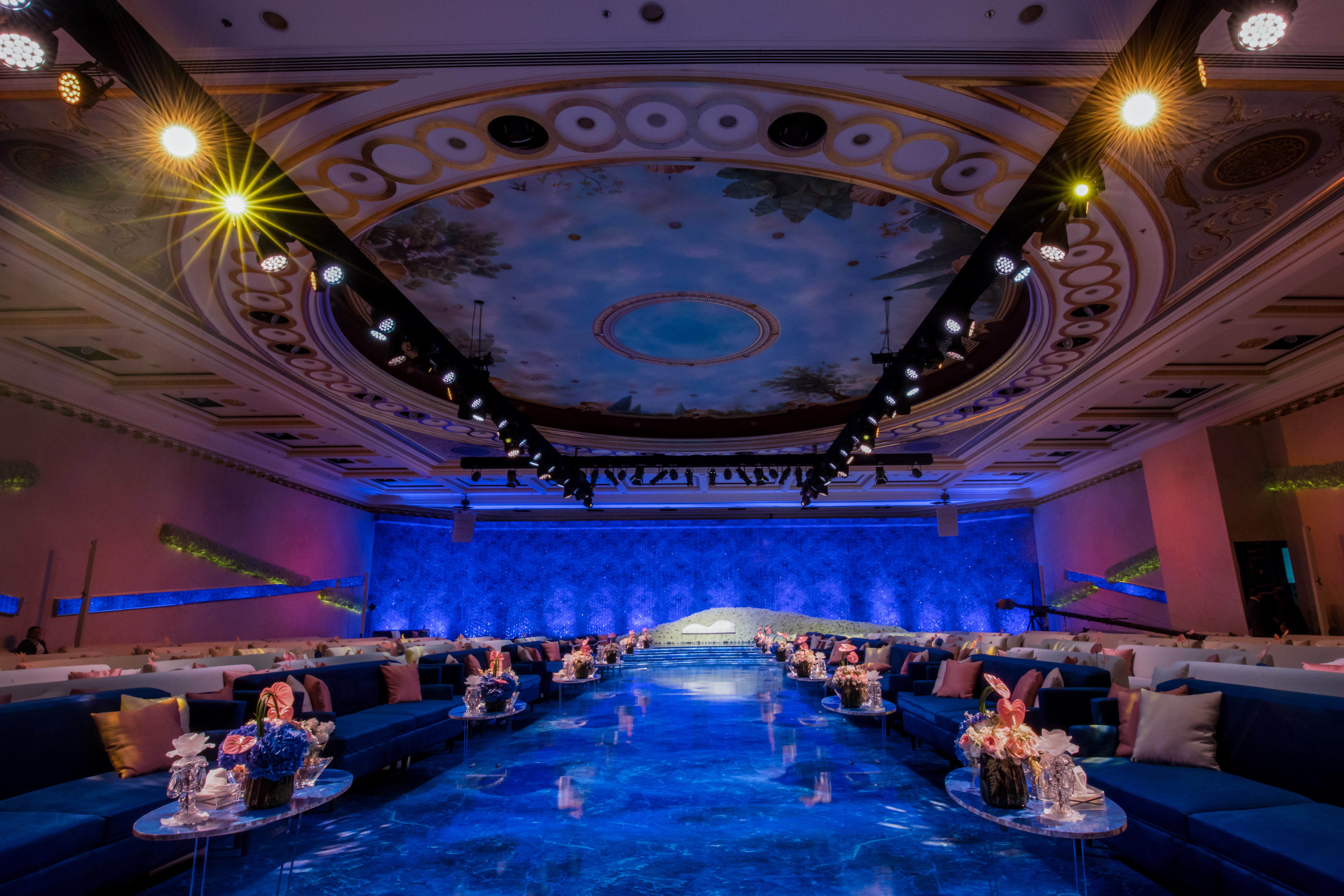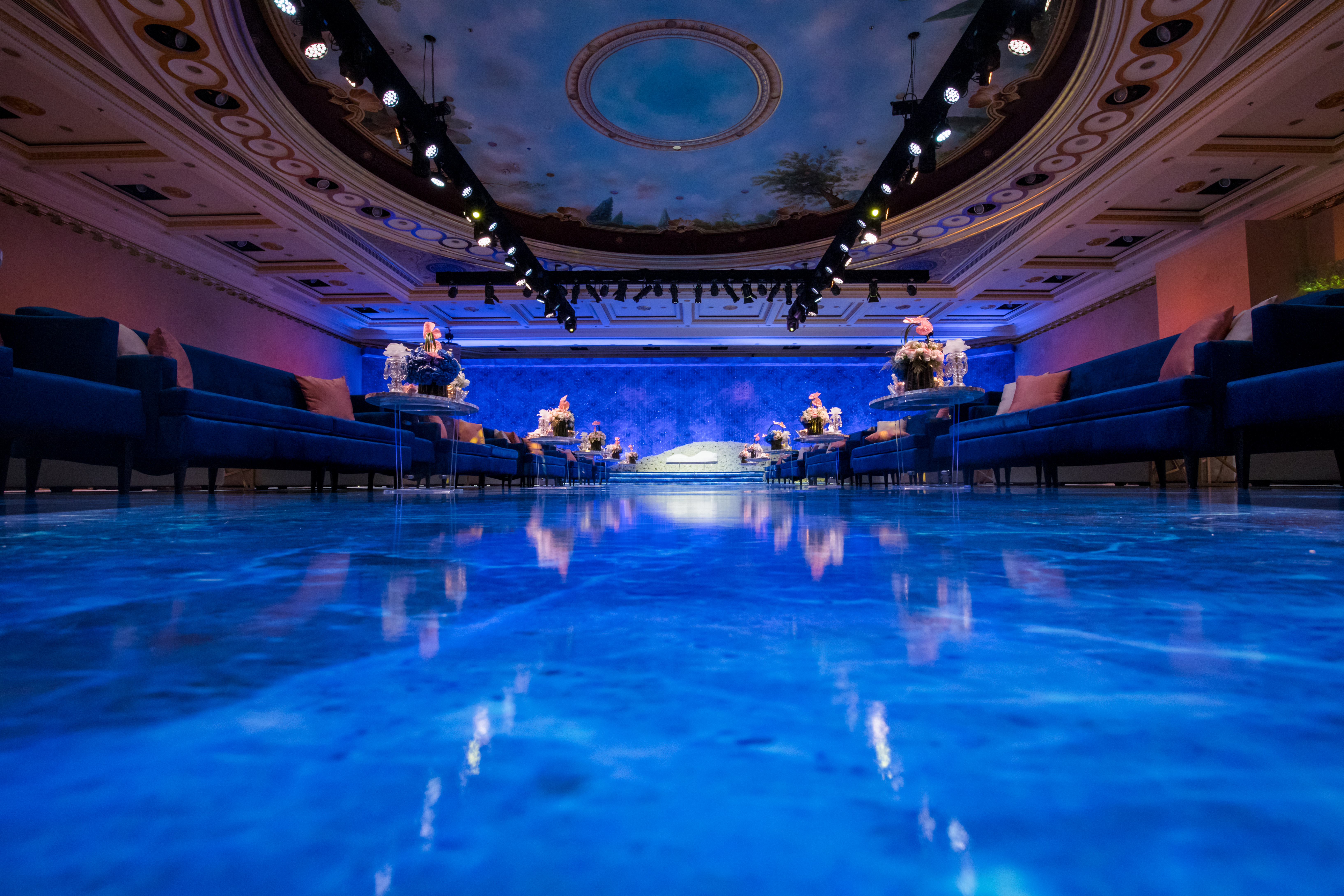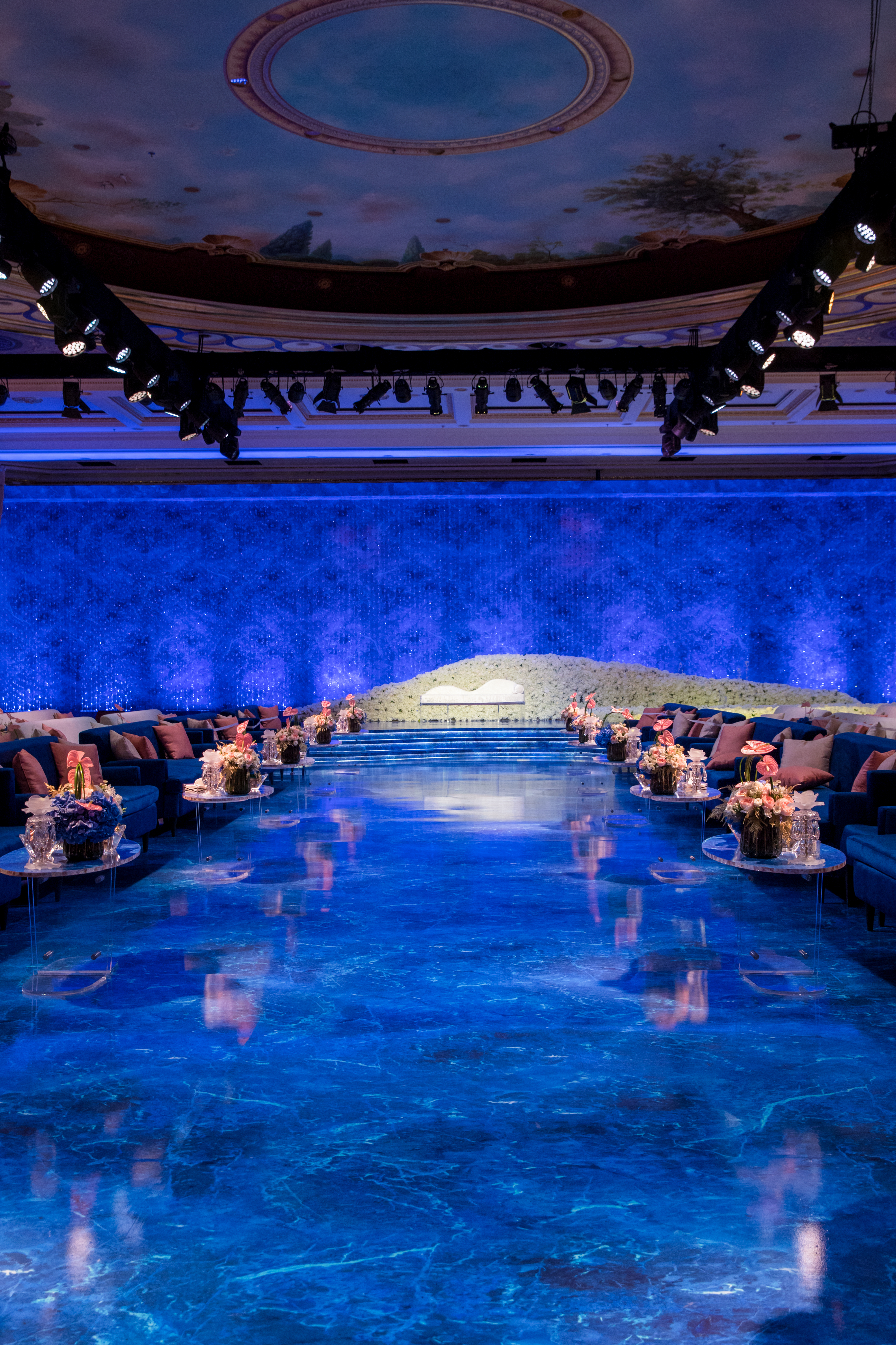 Abyss of Light is a breathtaking wedding reception design that immerses guests in a dreamlike setting, where a vast blue marble-effect slab and an expansive, glass-like walkway create the illusion of floating over an endless ocean.