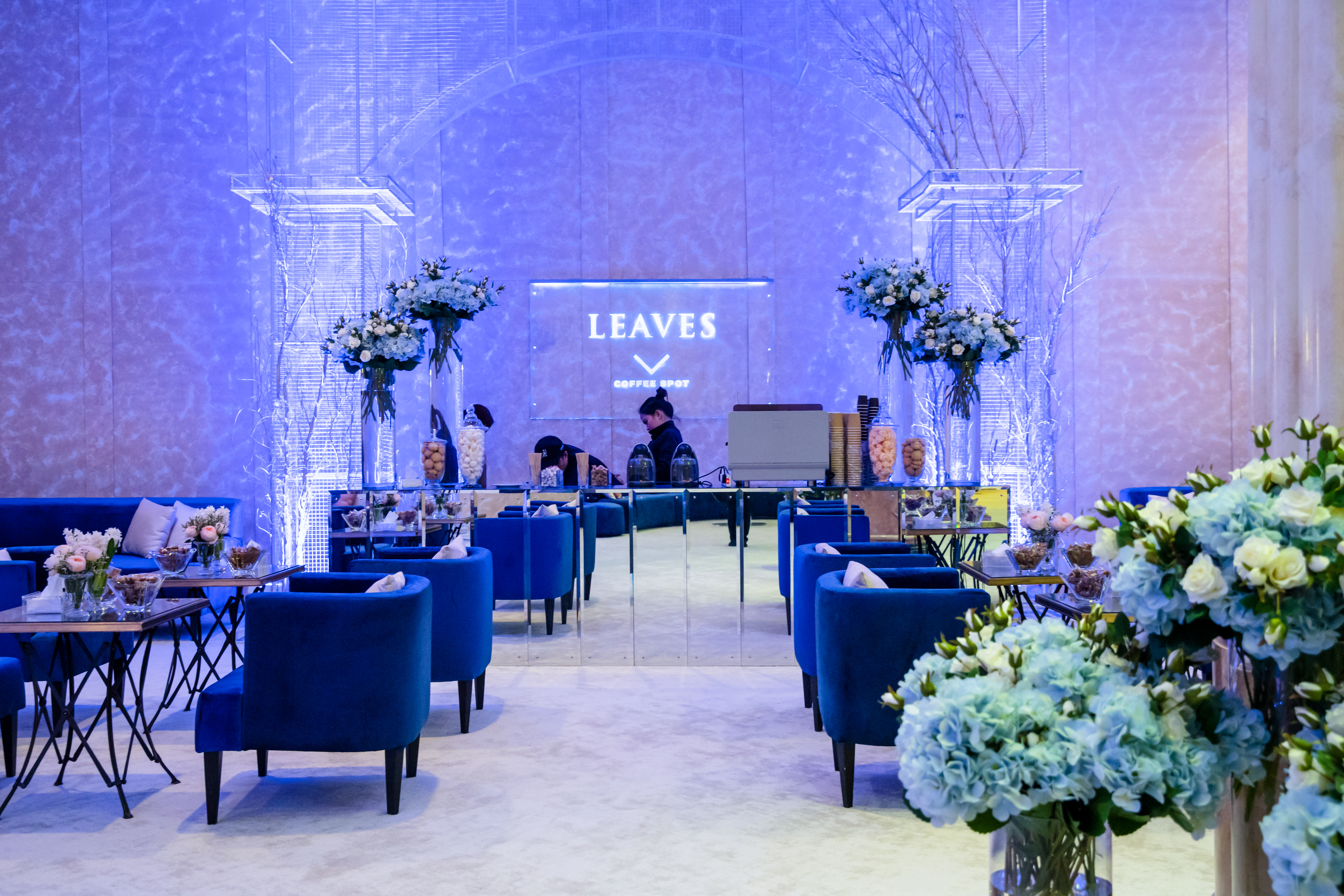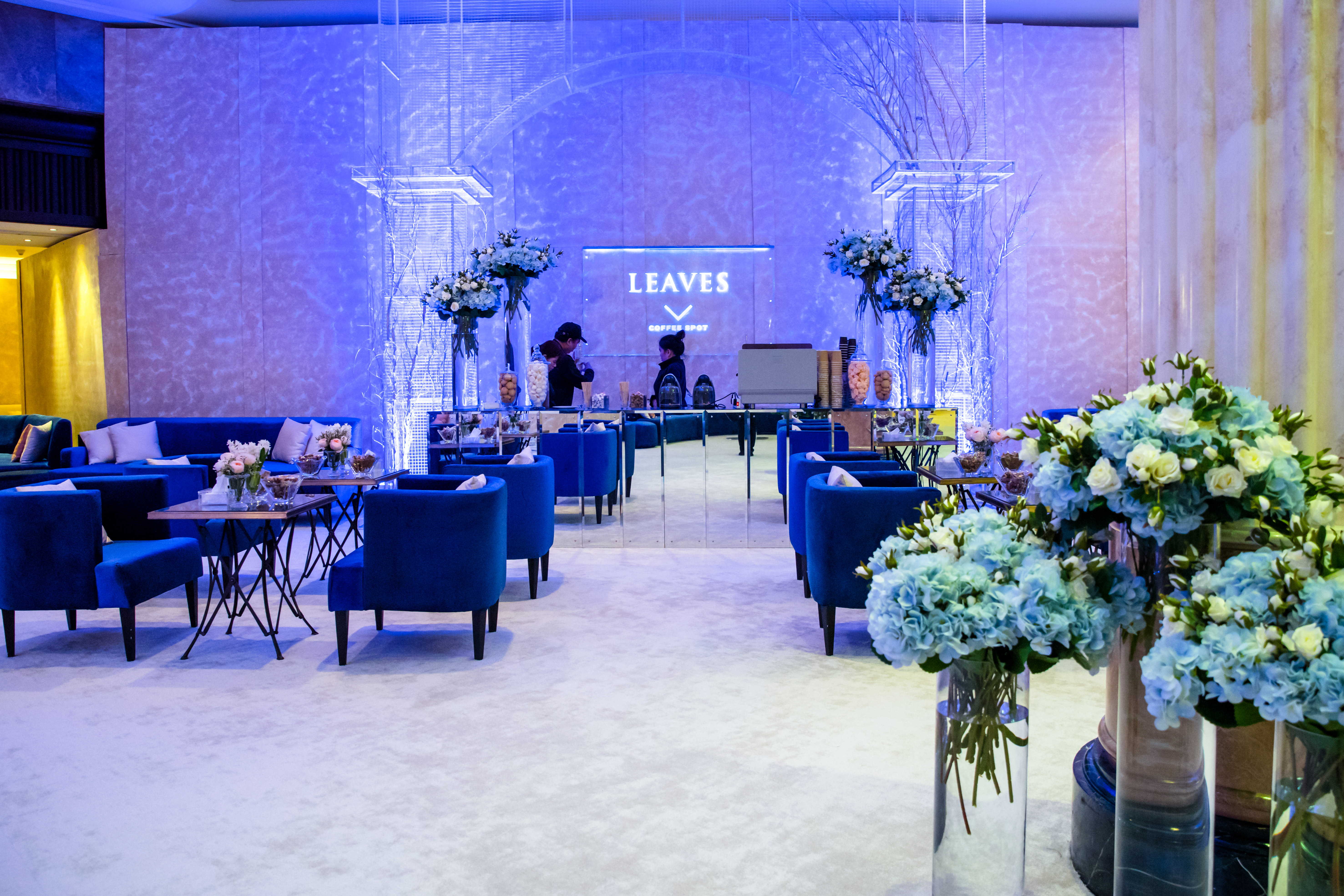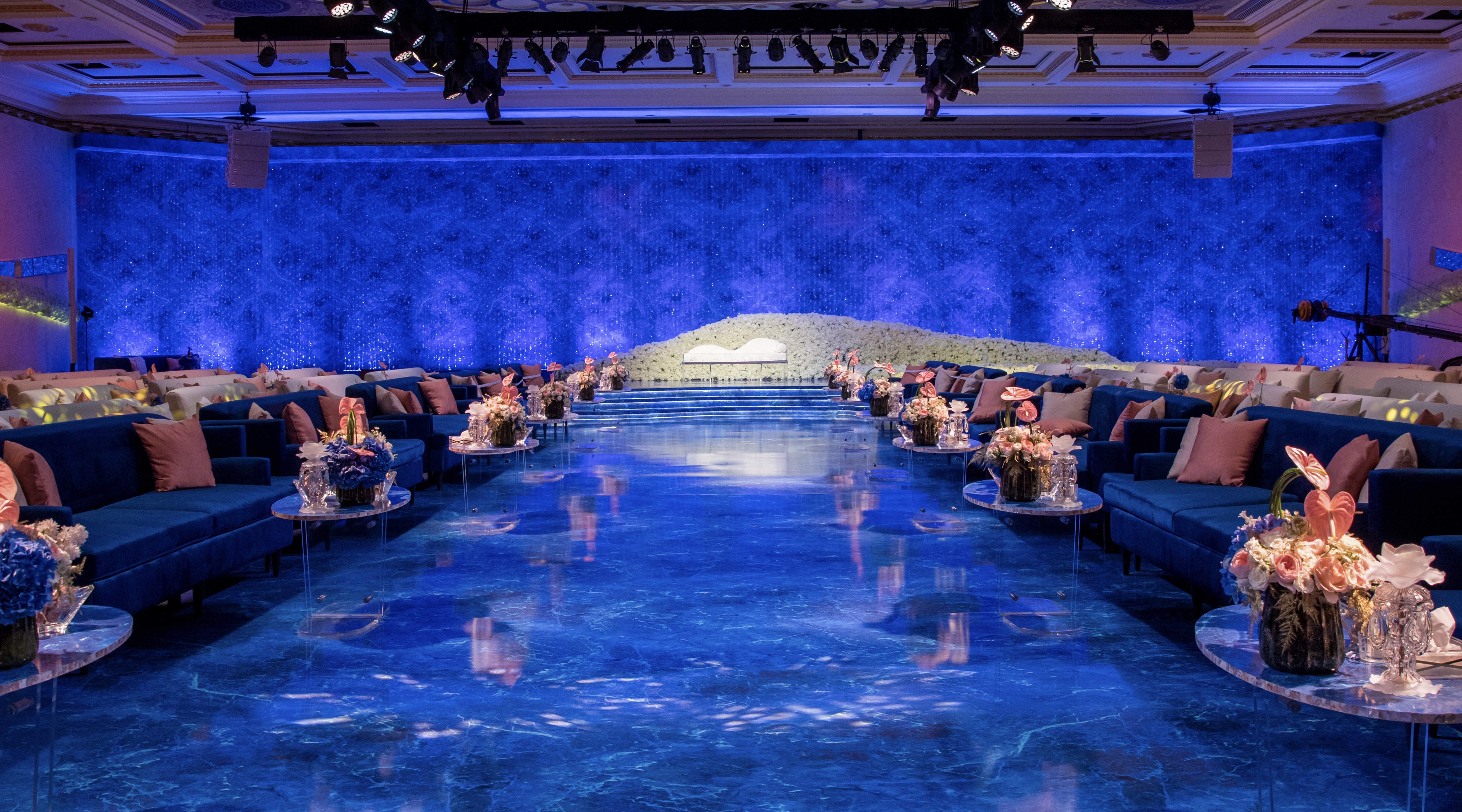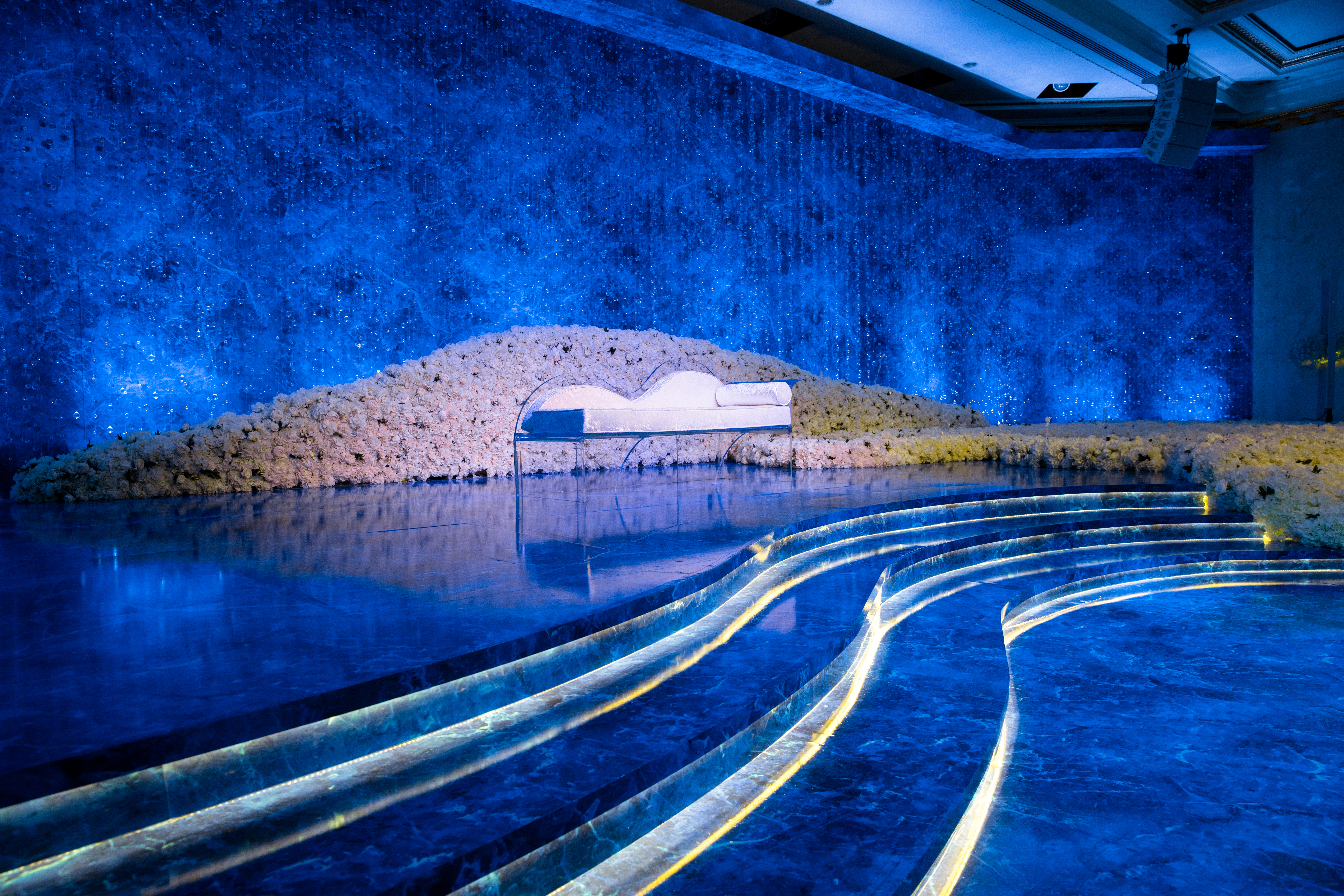 Abyss of Light is an immersive wedding reception design that transcends conventional aesthetics, transporting guests into a boundless dreamscape where light, water, and structure converge in contemporary harmony. The space is anchored by an expansive deep blue marble-effect slab—reminiscent of polished onyx—crafting the illusion of a reflective ocean stretching infinitely beneath a luminous horizon. The wide, glass-like walkway, gleaming with fluidity, mimics the movement of water, evoking the serene sensation of floating through a tranquil abyss.