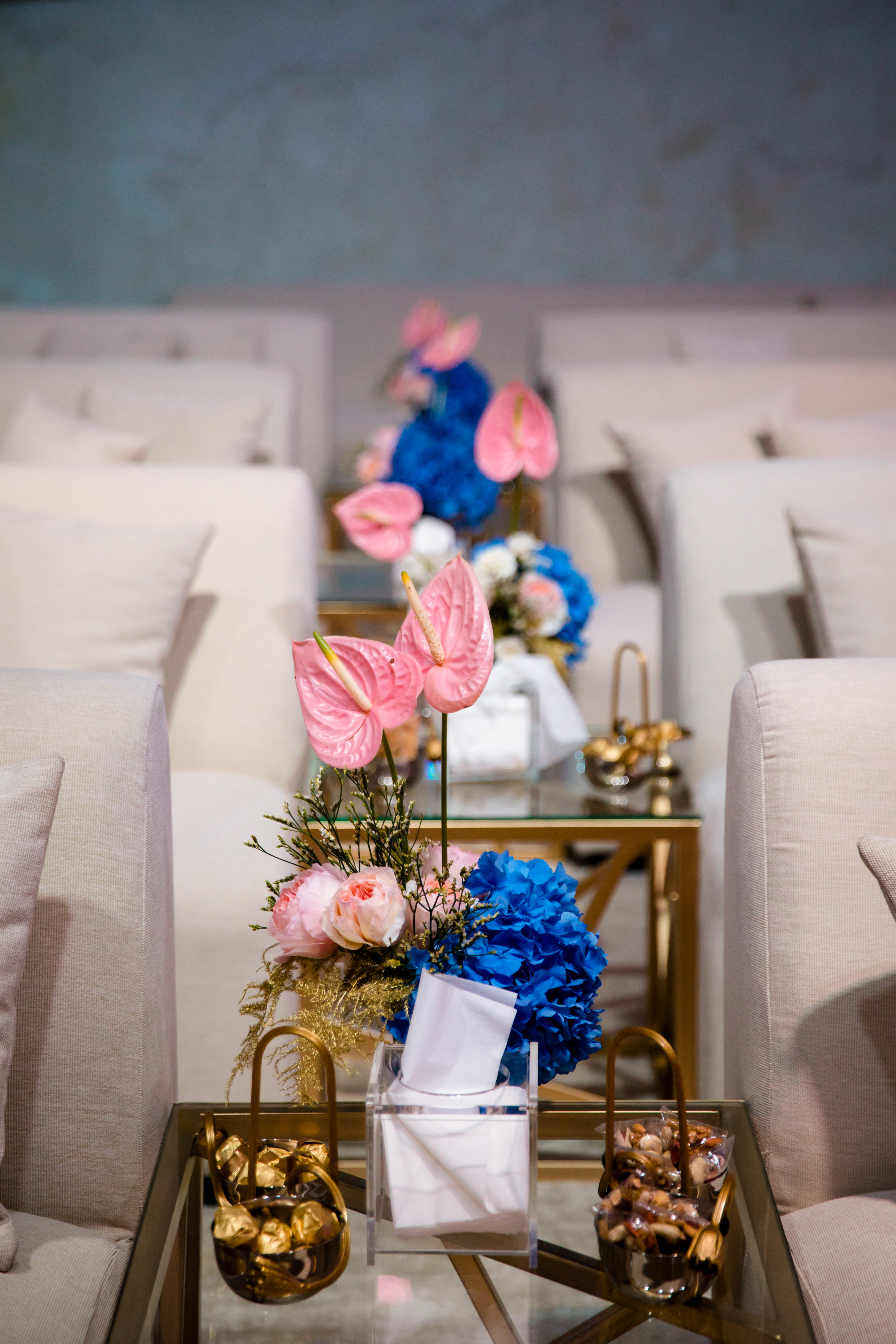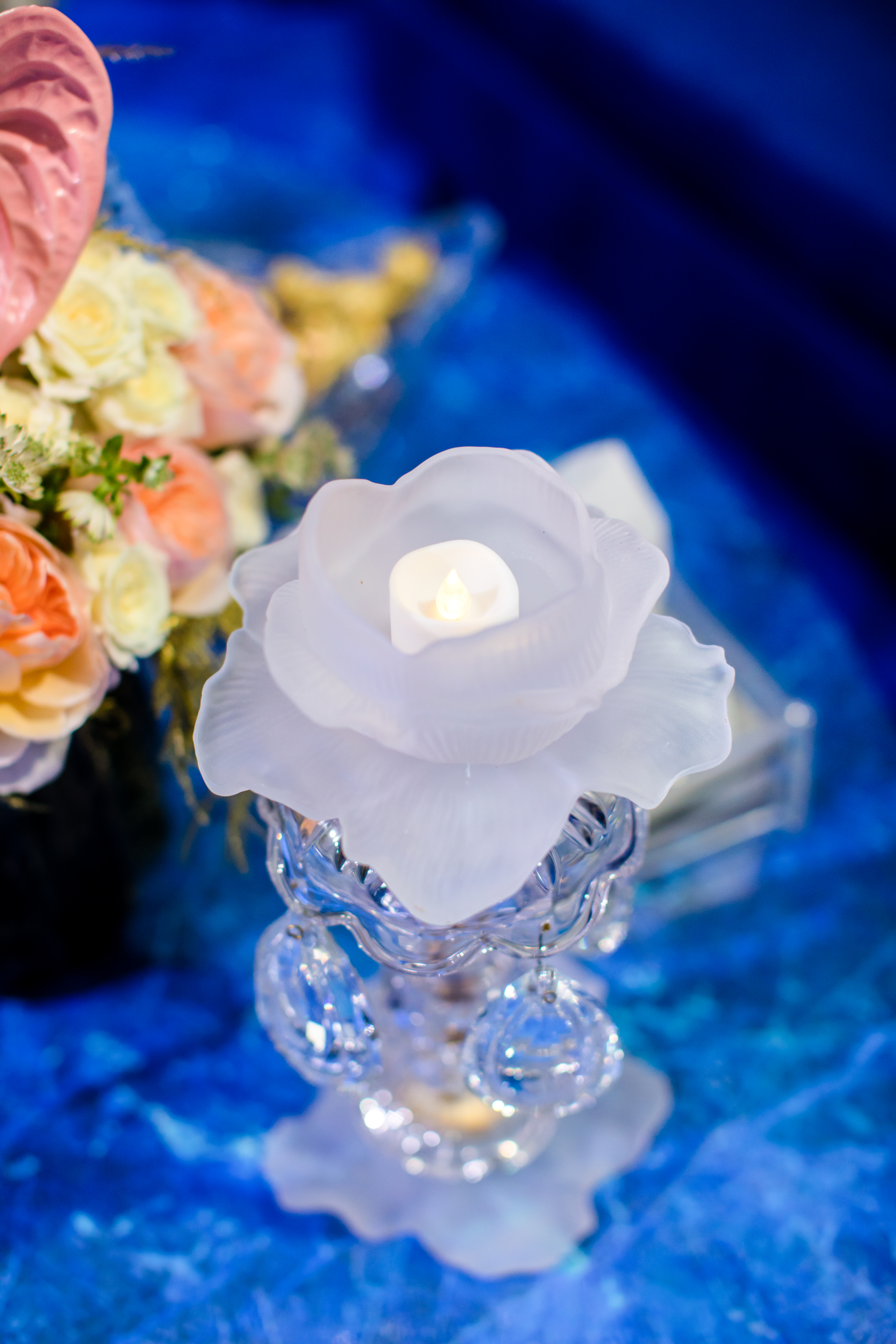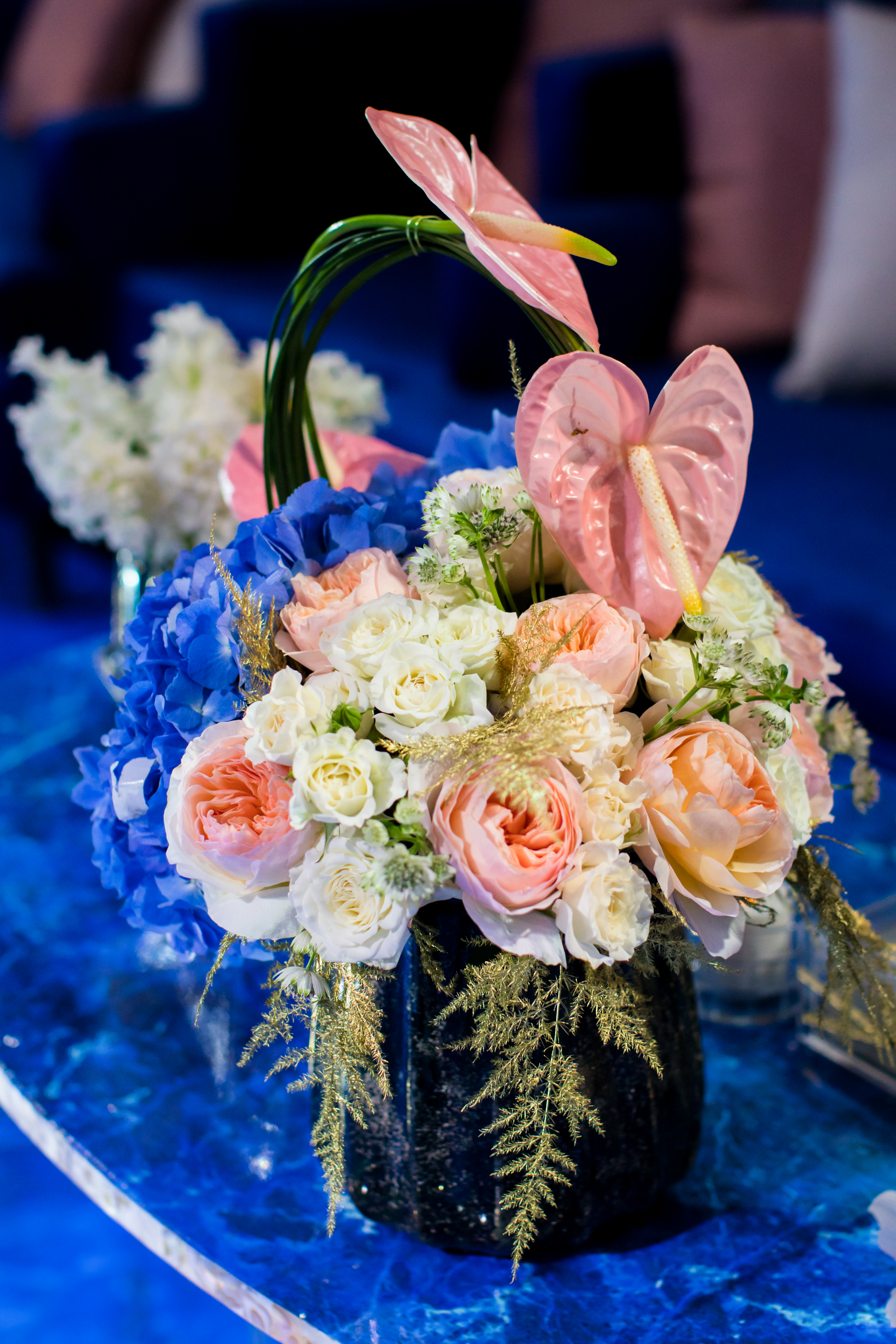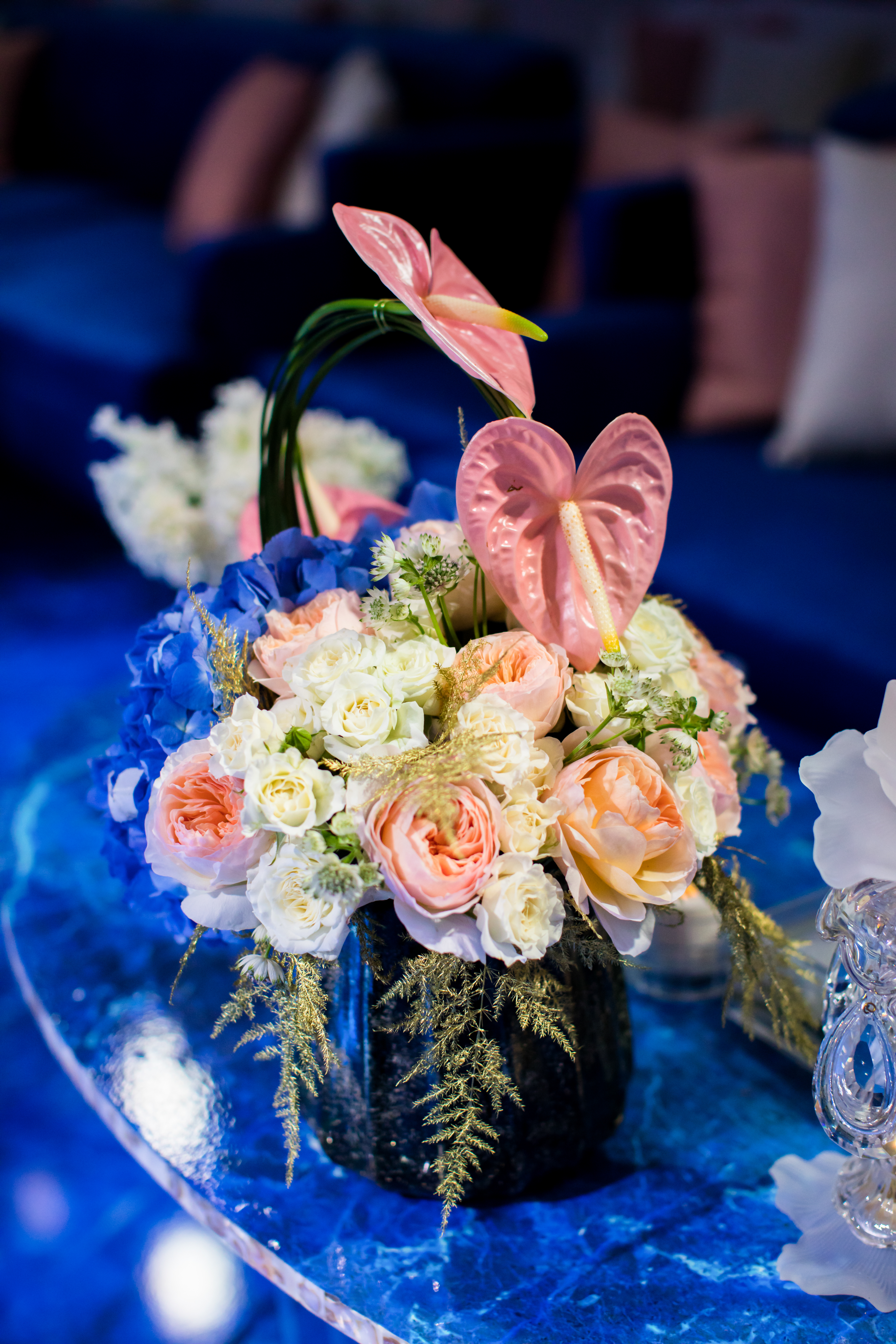 Abyss of Light is an immersive wedding reception design that transcends conventional aesthetics, transporting guests into a boundless dreamscape where light, water, and structure converge in contemporary harmony. The space is anchored by an expansive deep blue marble-effect slab—reminiscent of polished onyx—crafting the illusion of a reflective ocean stretching infinitely beneath a luminous horizon. The wide, glass-like walkway, gleaming with fluidity, mimics the movement of water, evoking the serene sensation of floating through a tranquil abyss.