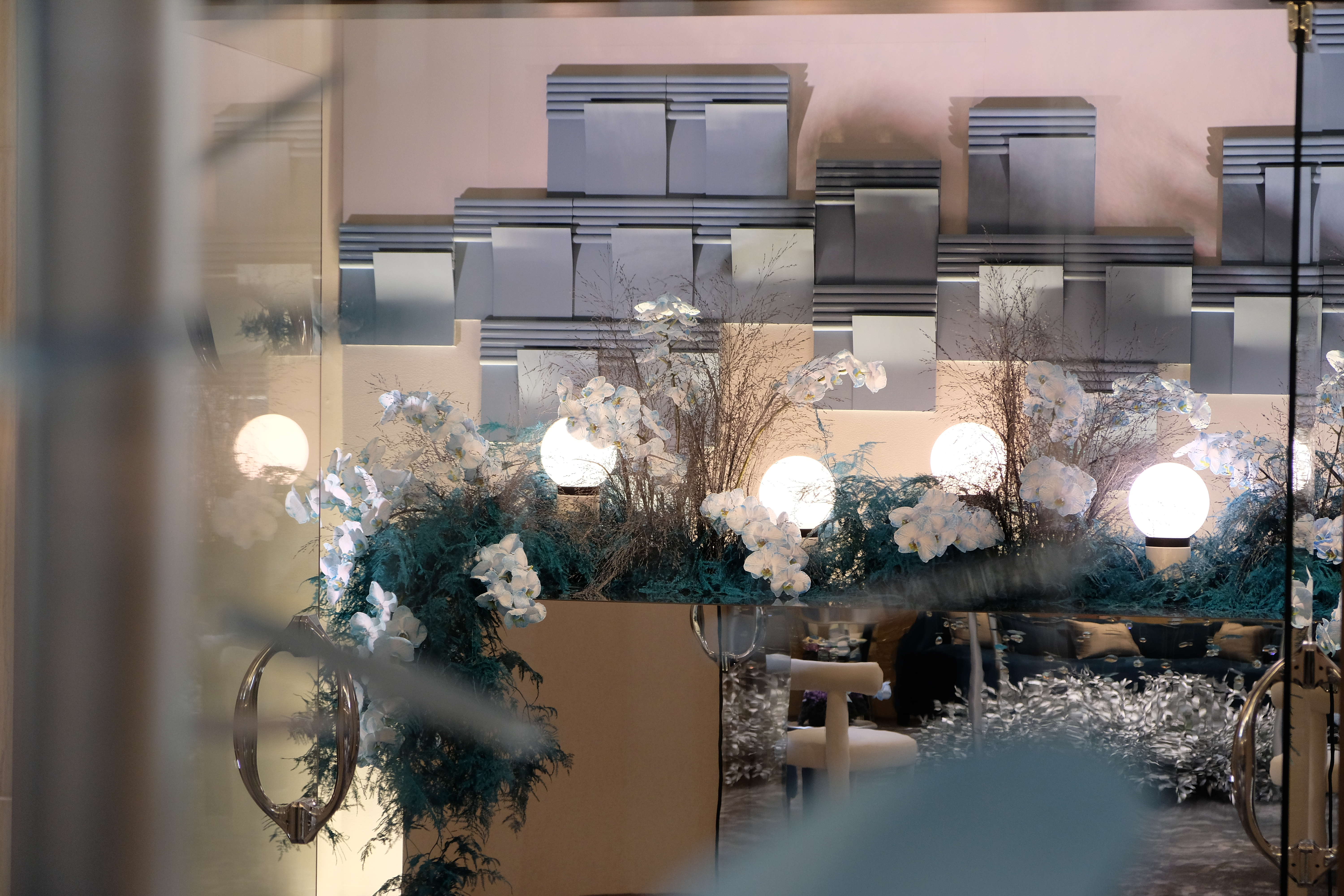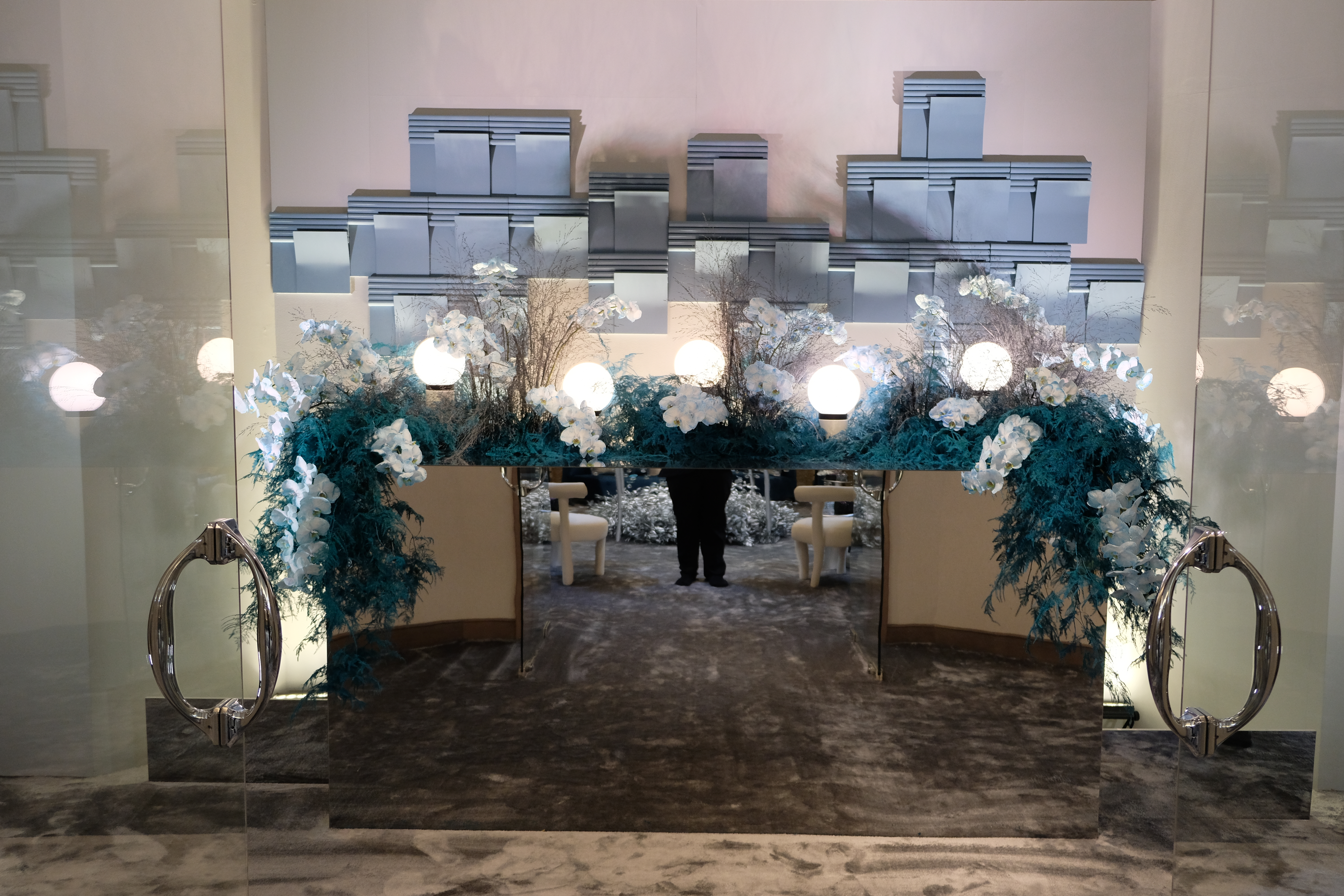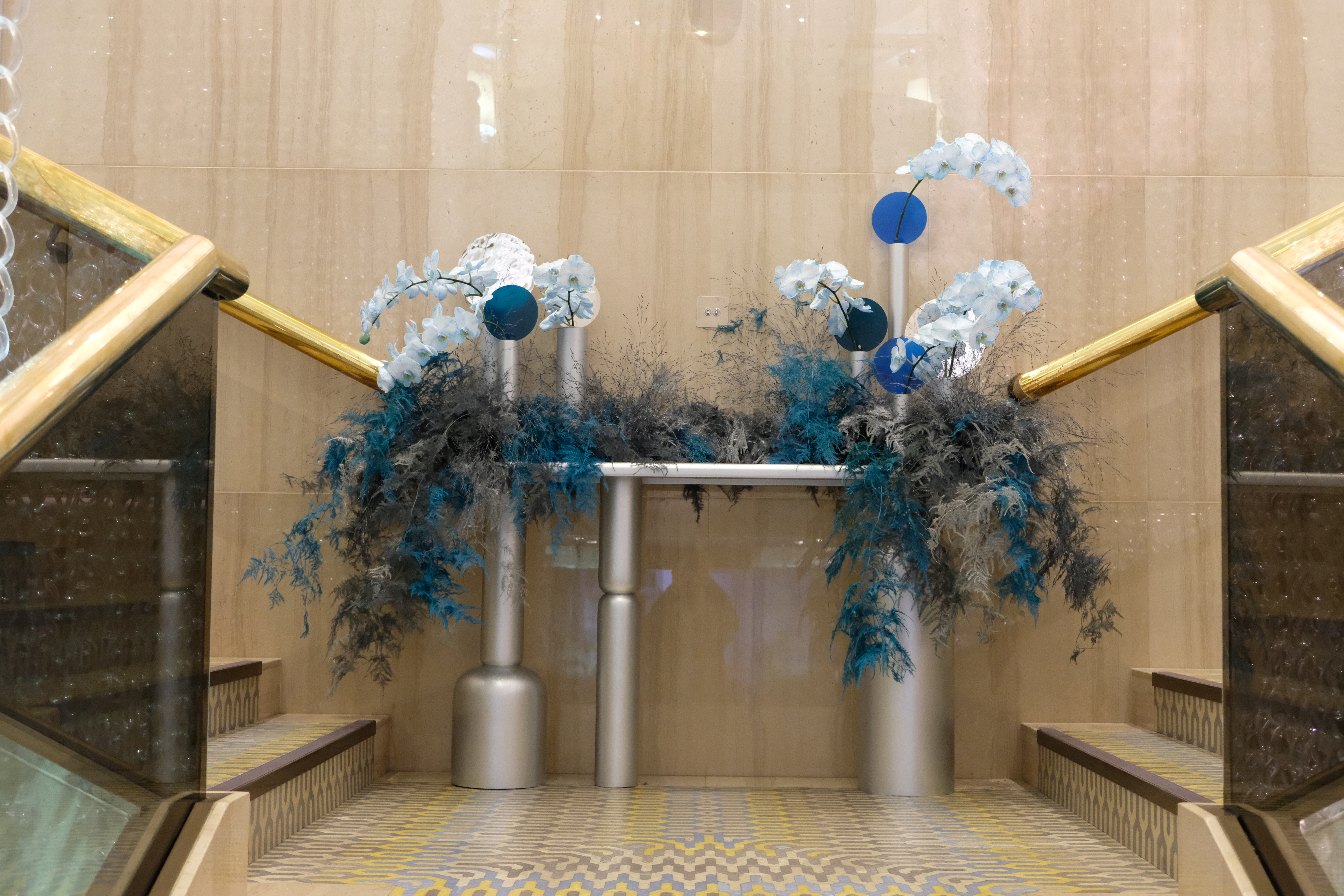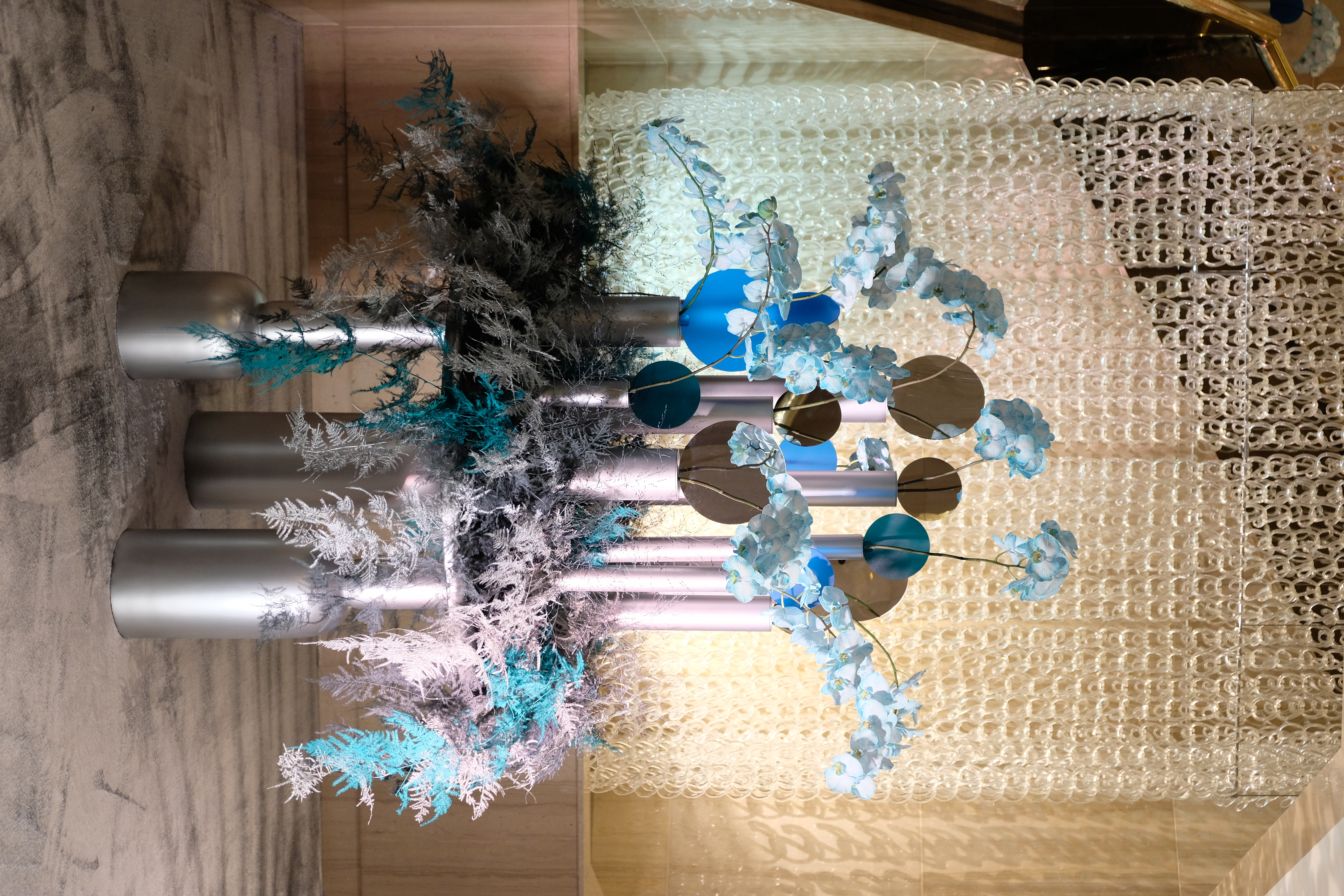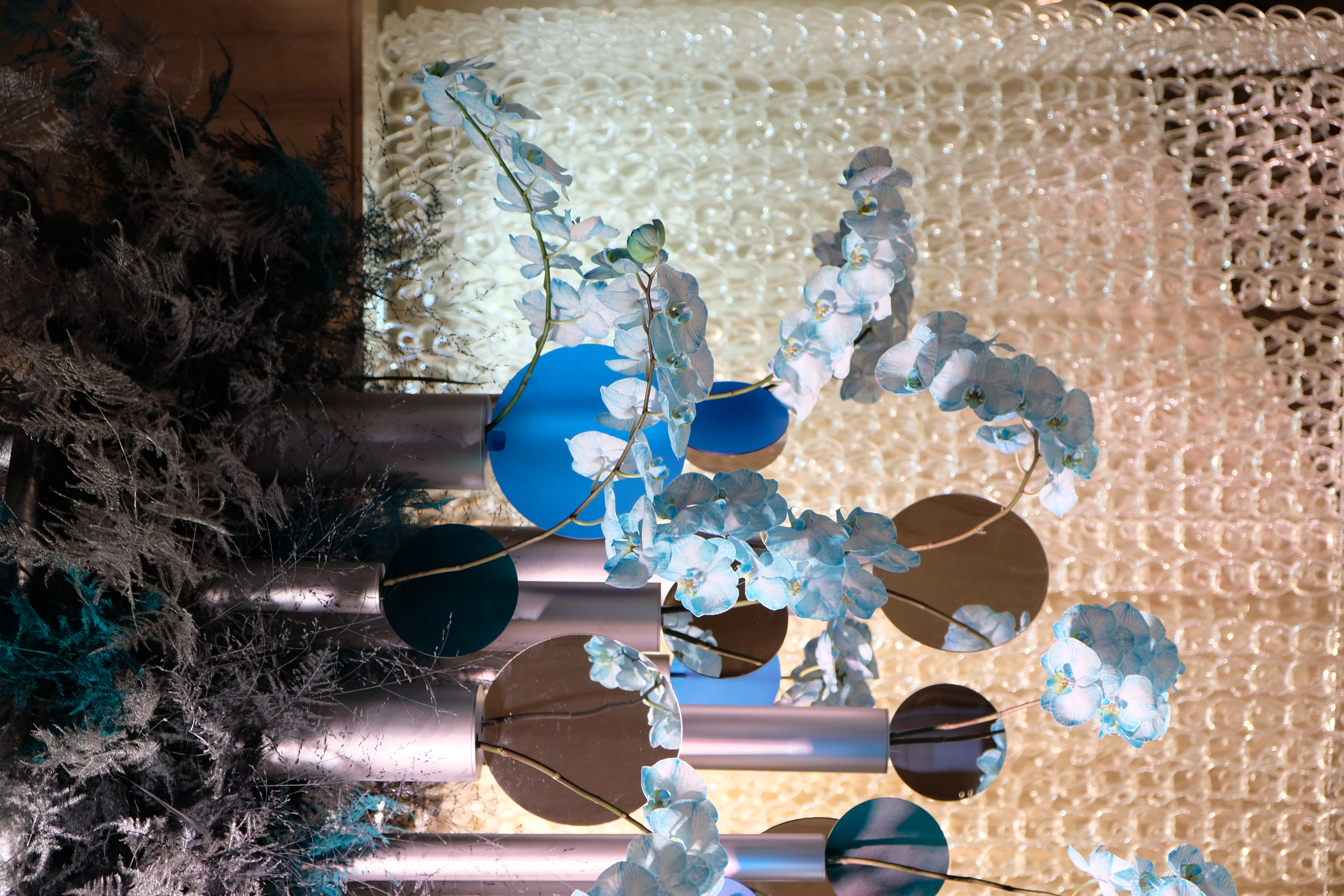 The floral arrangements, too, are an extension of this aesthetic—deliberate, sculptural, and ethereal. Orchids, tinted in icy blues, emerge from a landscape of silver and steel-toned foliage, softening the architectural language yet maintaining its strength. Floral compositions defy the expected, seamlessly integrating with the metallic framework, growing through refined industrial forms rather than around them.