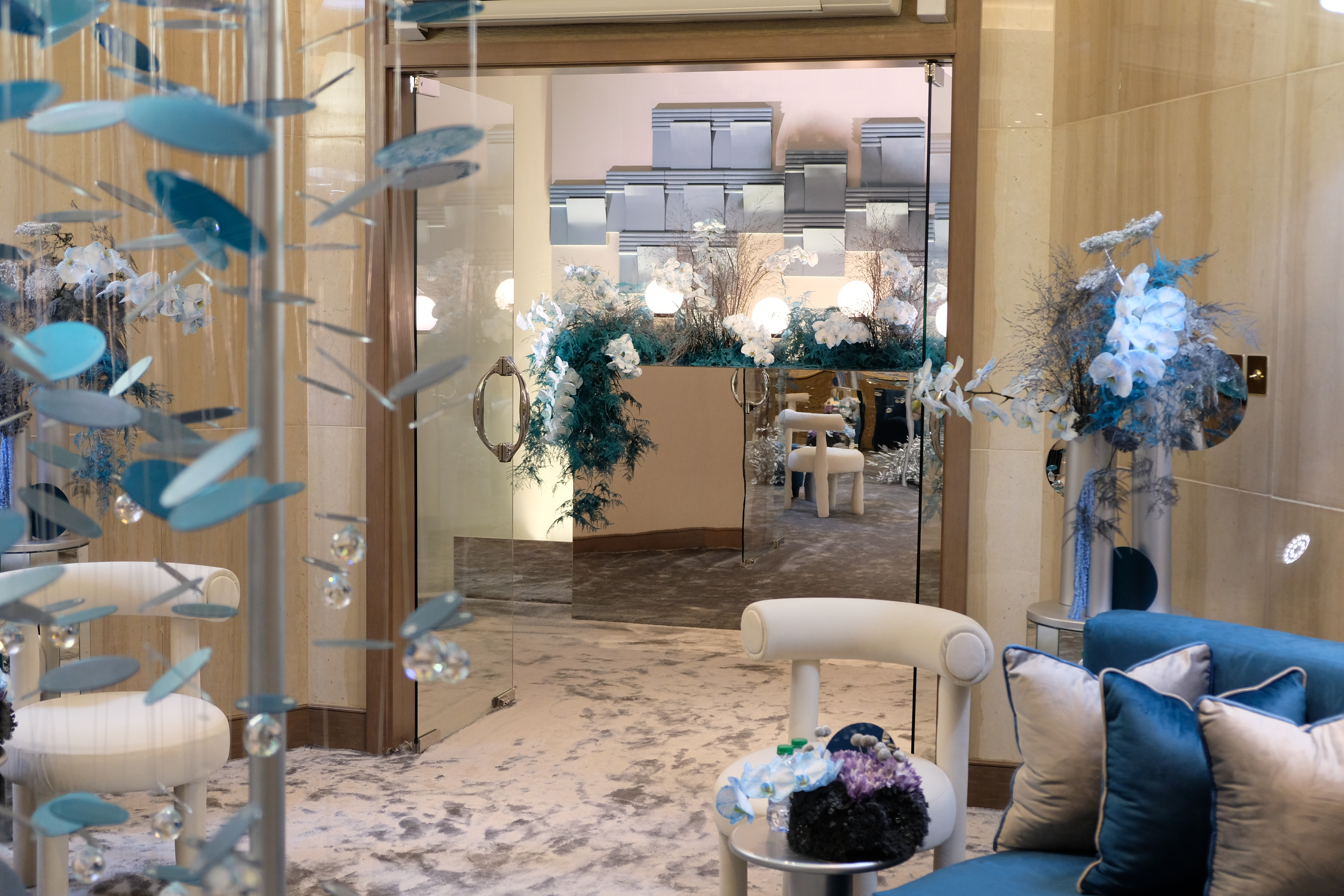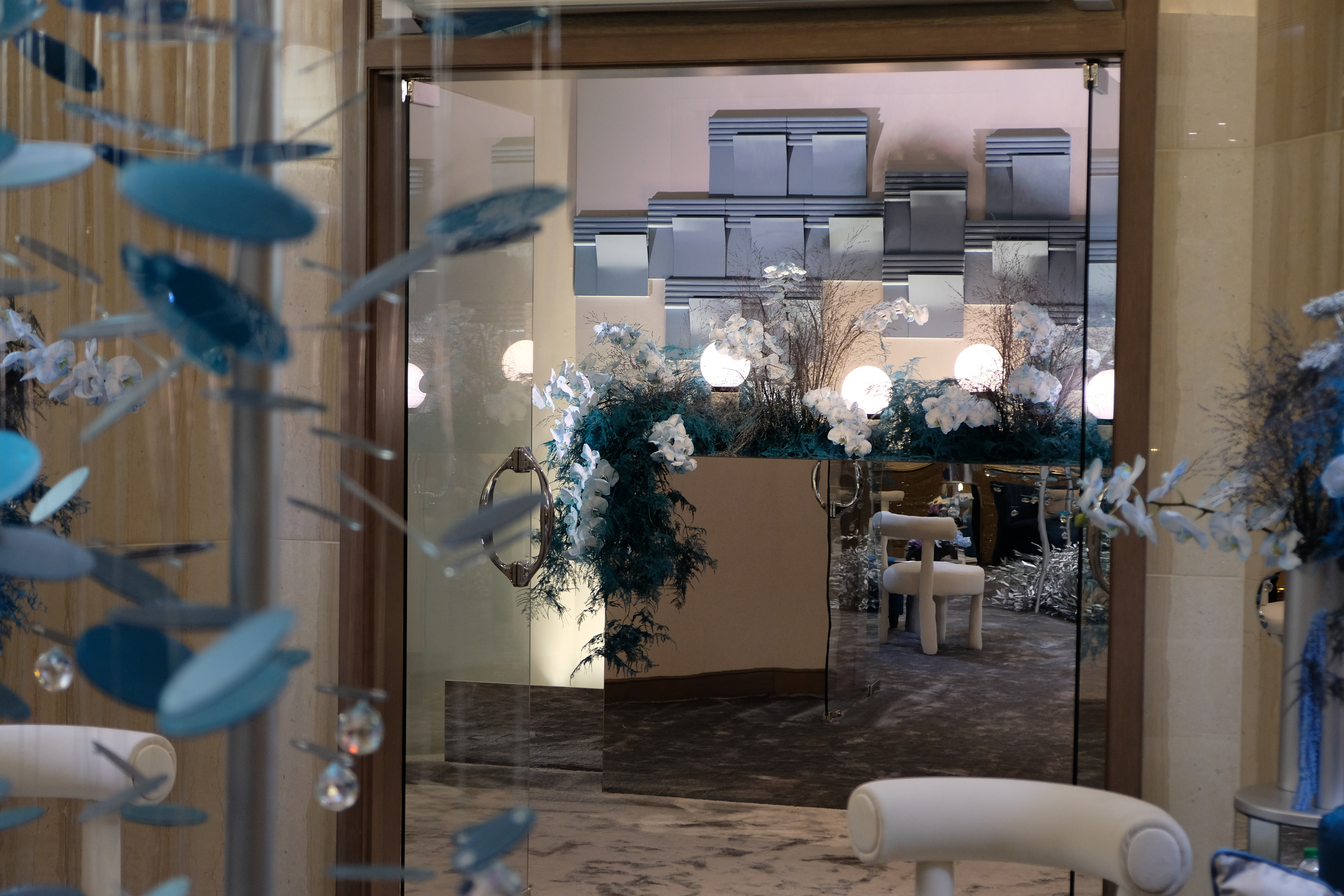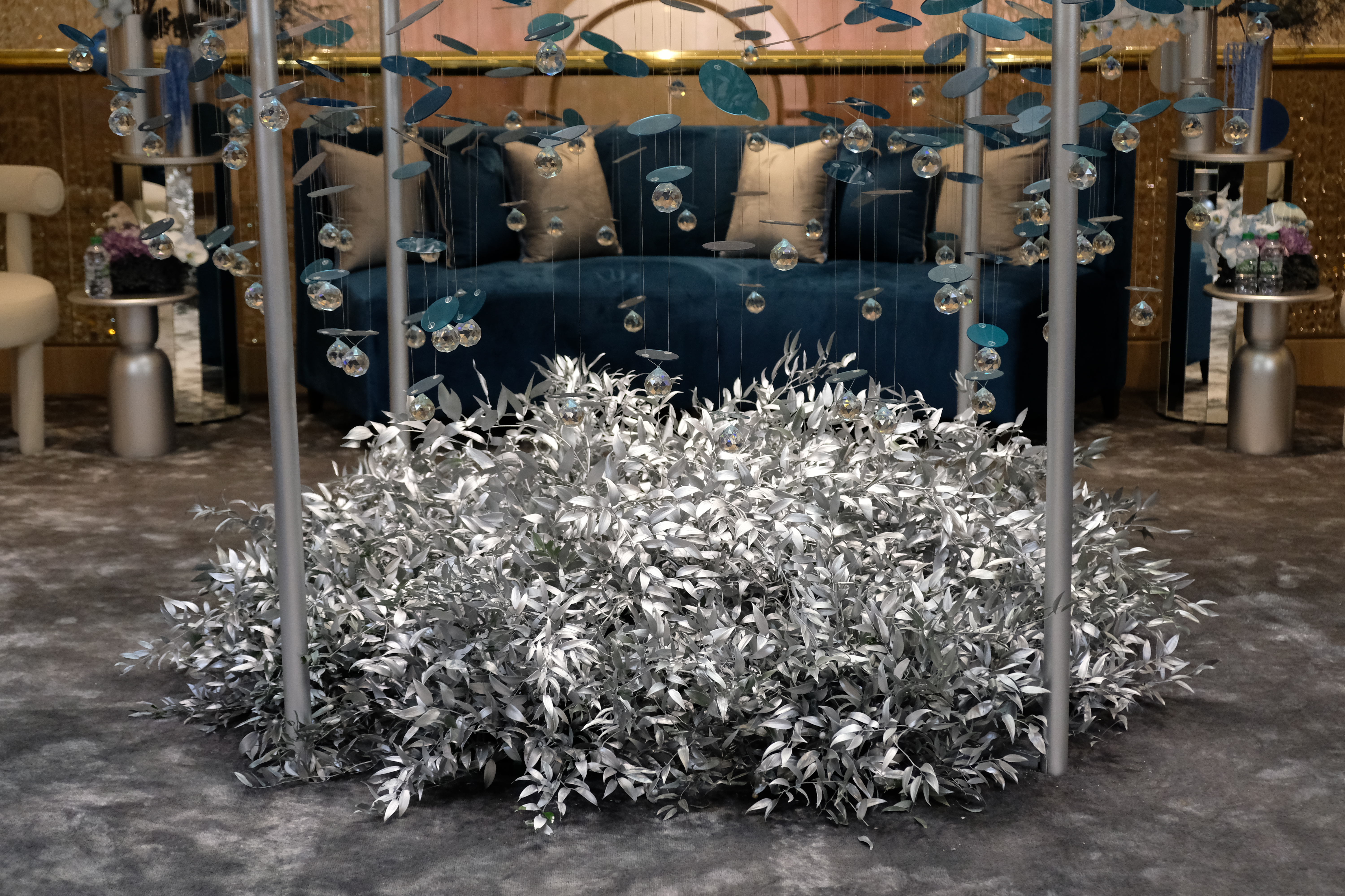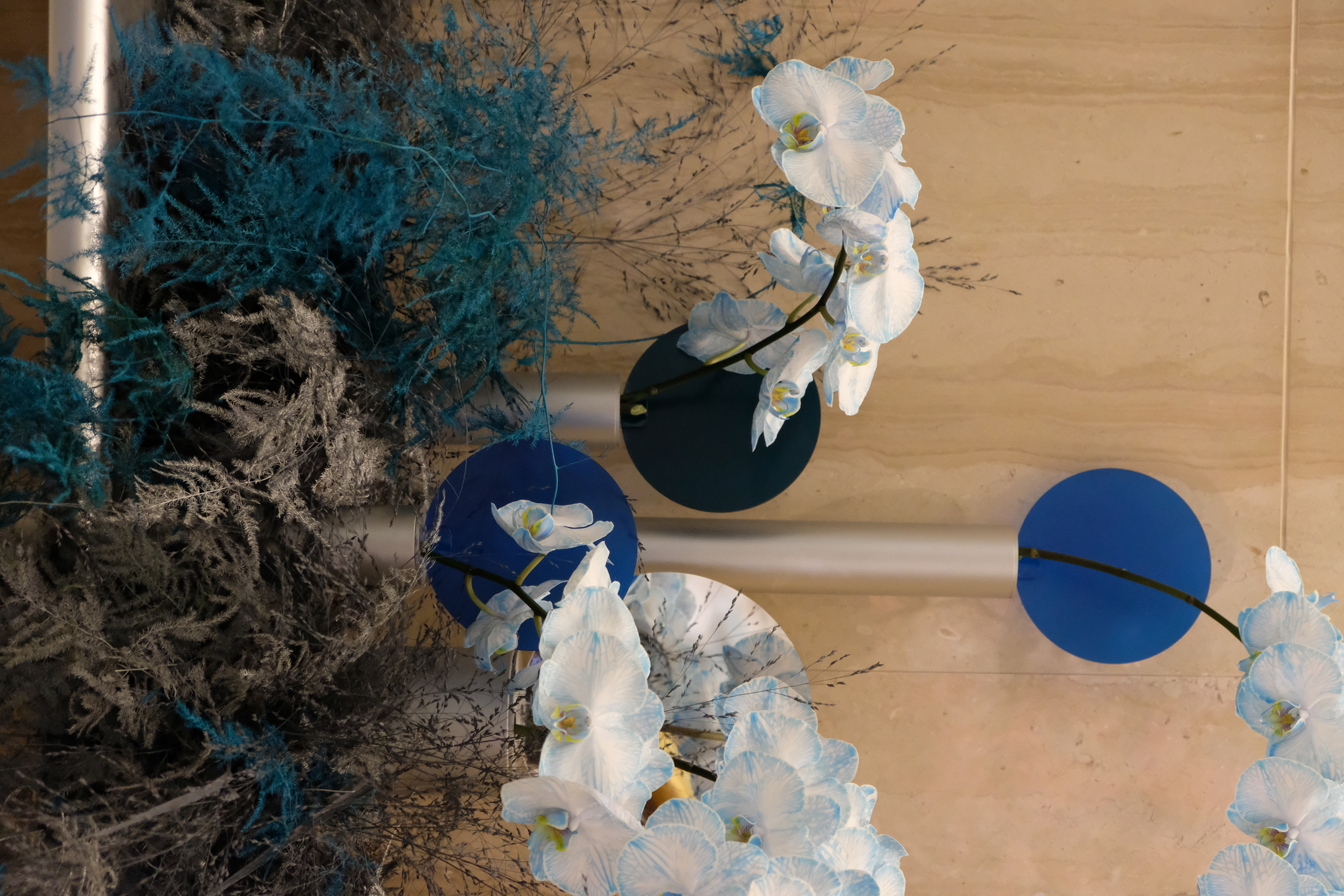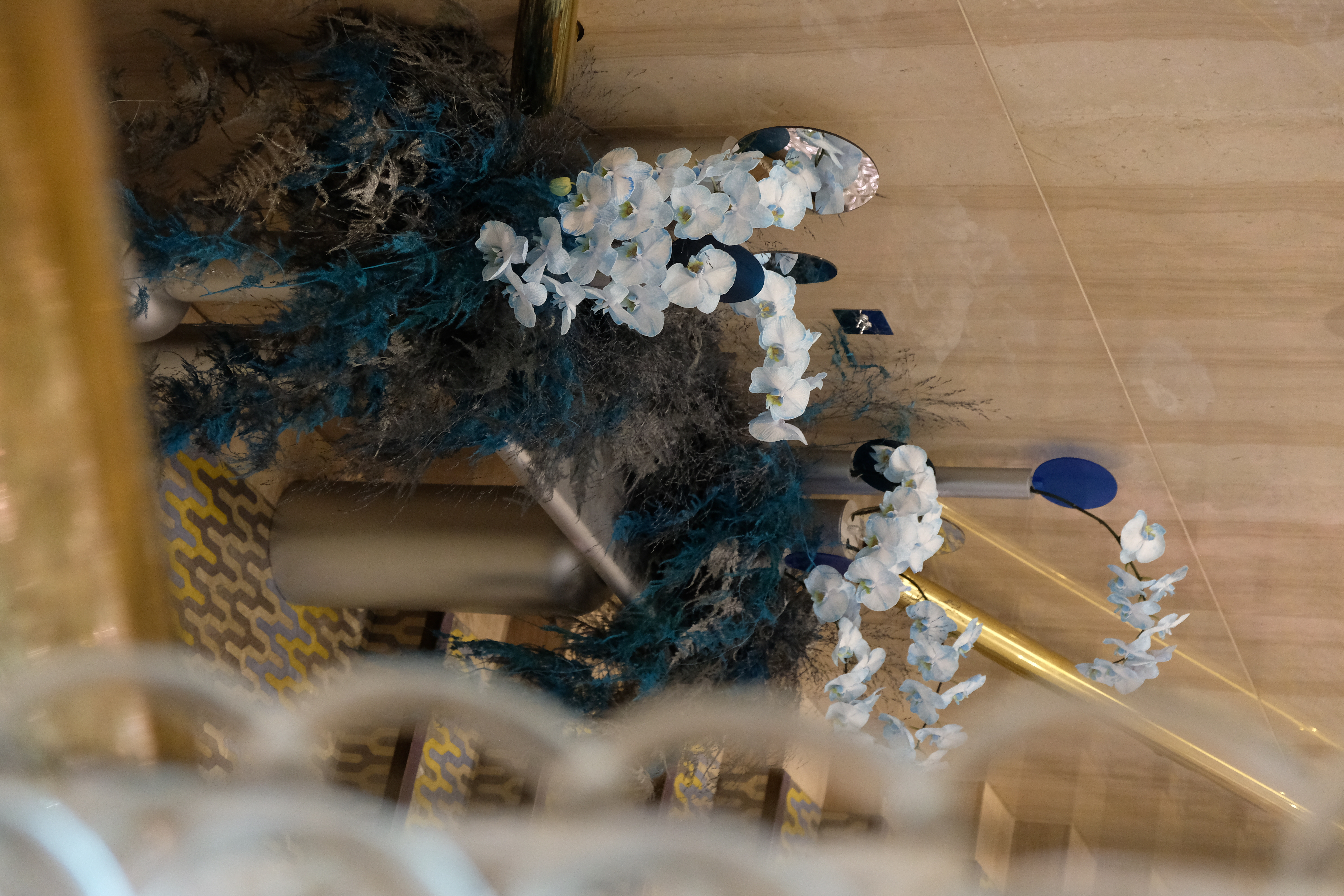 The floral arrangements, too, are an extension of this aesthetic—deliberate, sculptural, and ethereal. Orchids, tinted in icy blues, emerge from a landscape of silver and steel-toned foliage, softening the architectural language yet maintaining its strength. Floral compositions defy the expected, seamlessly integrating with the metallic framework, growing through refined industrial forms rather than around them.