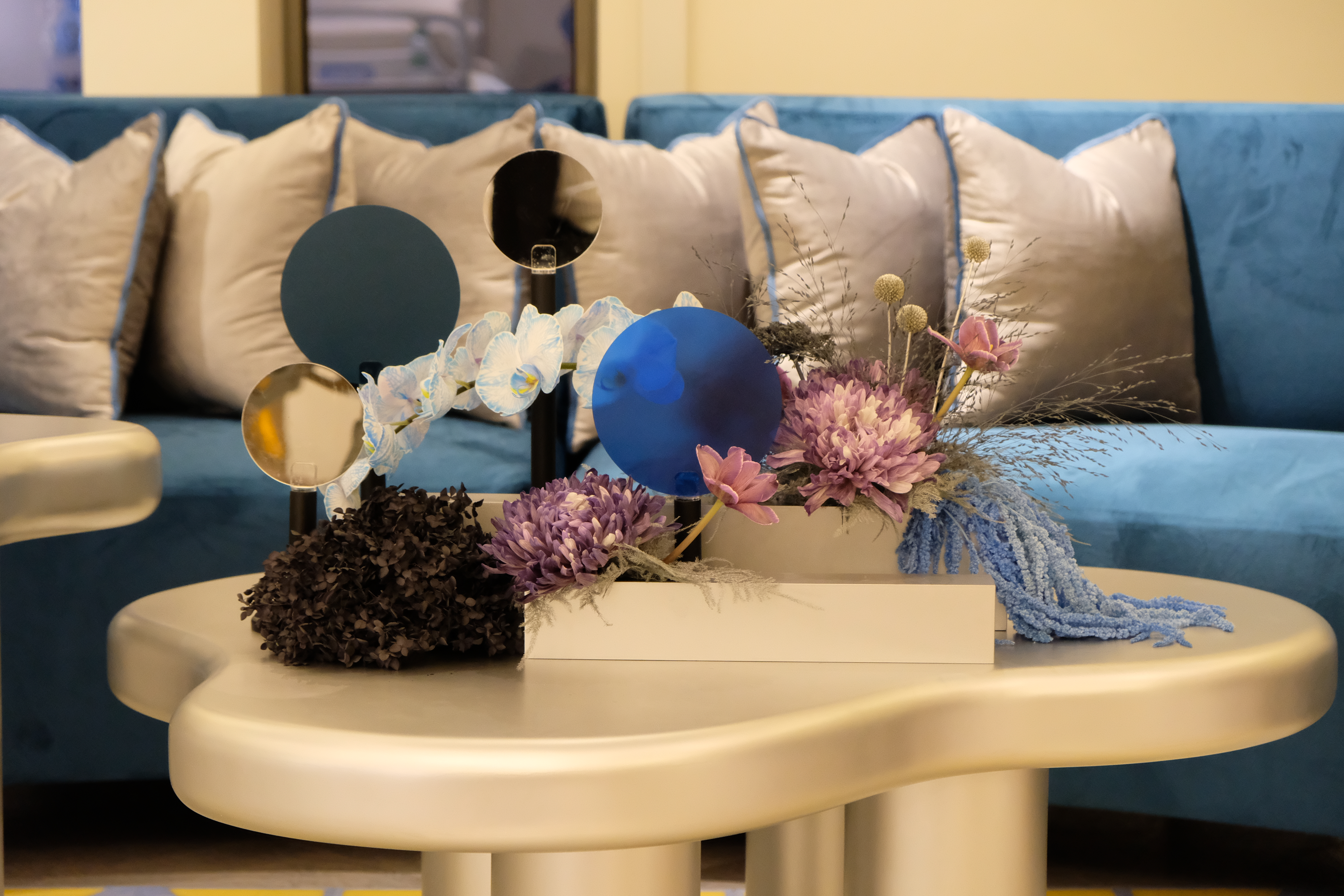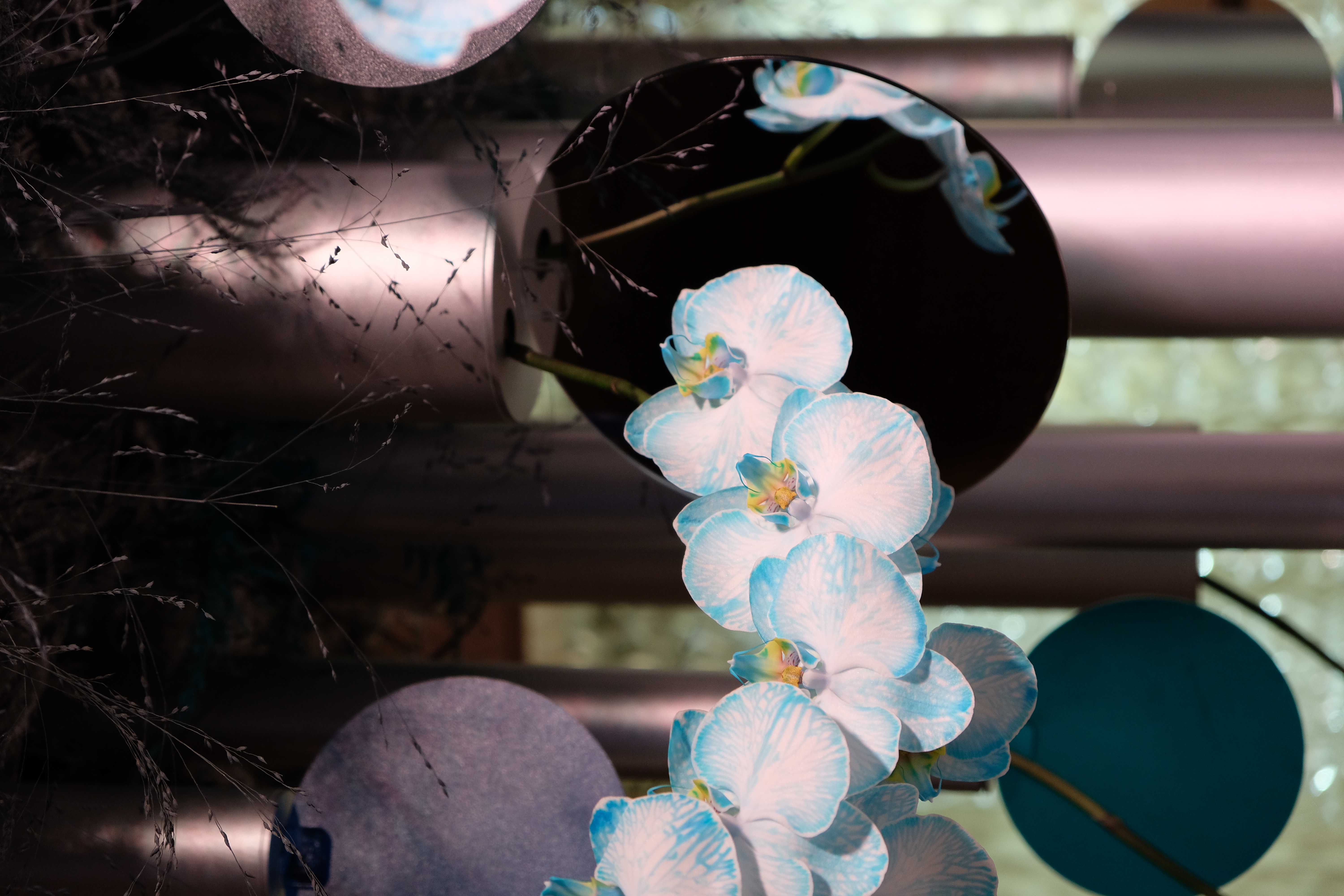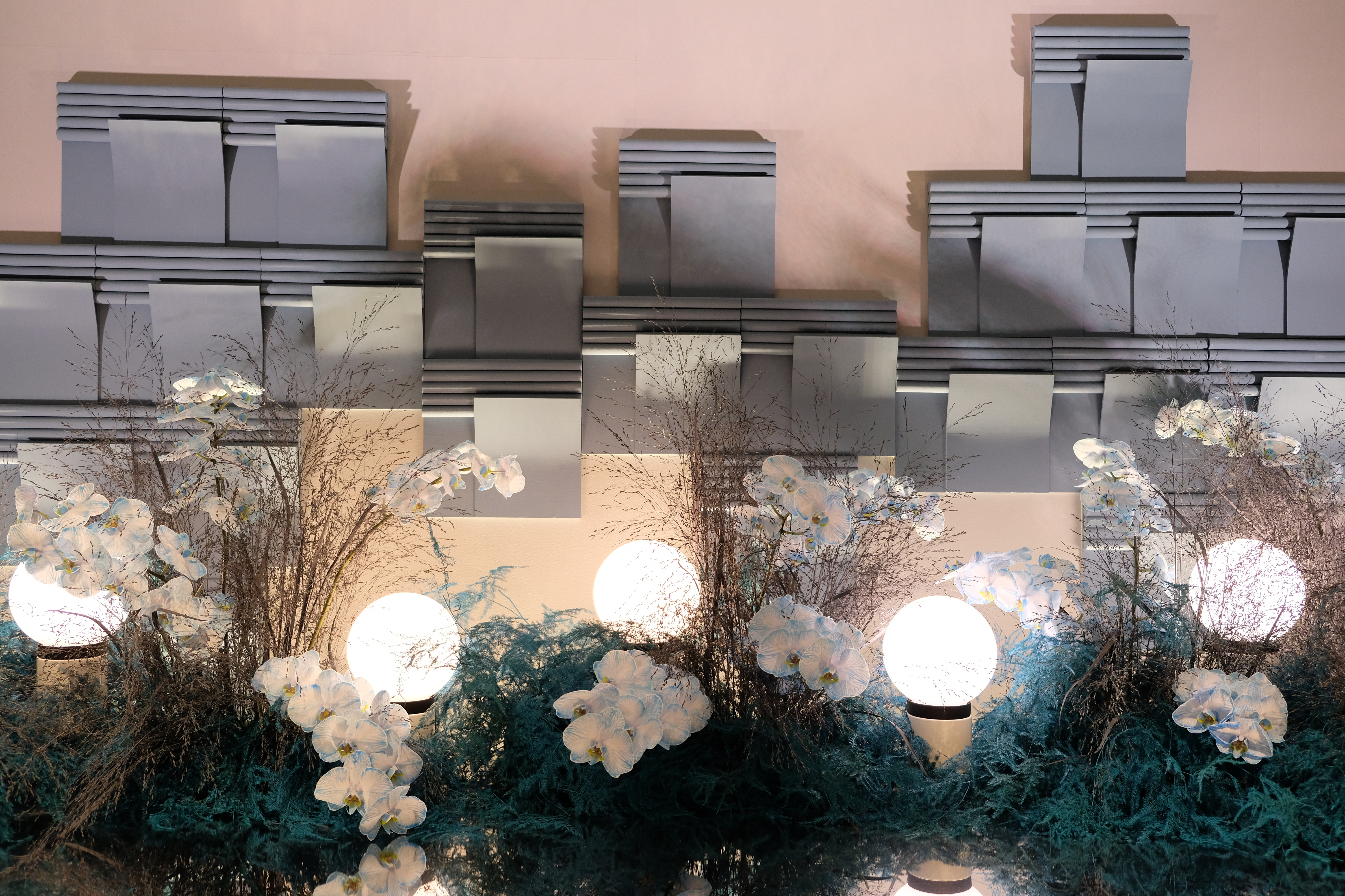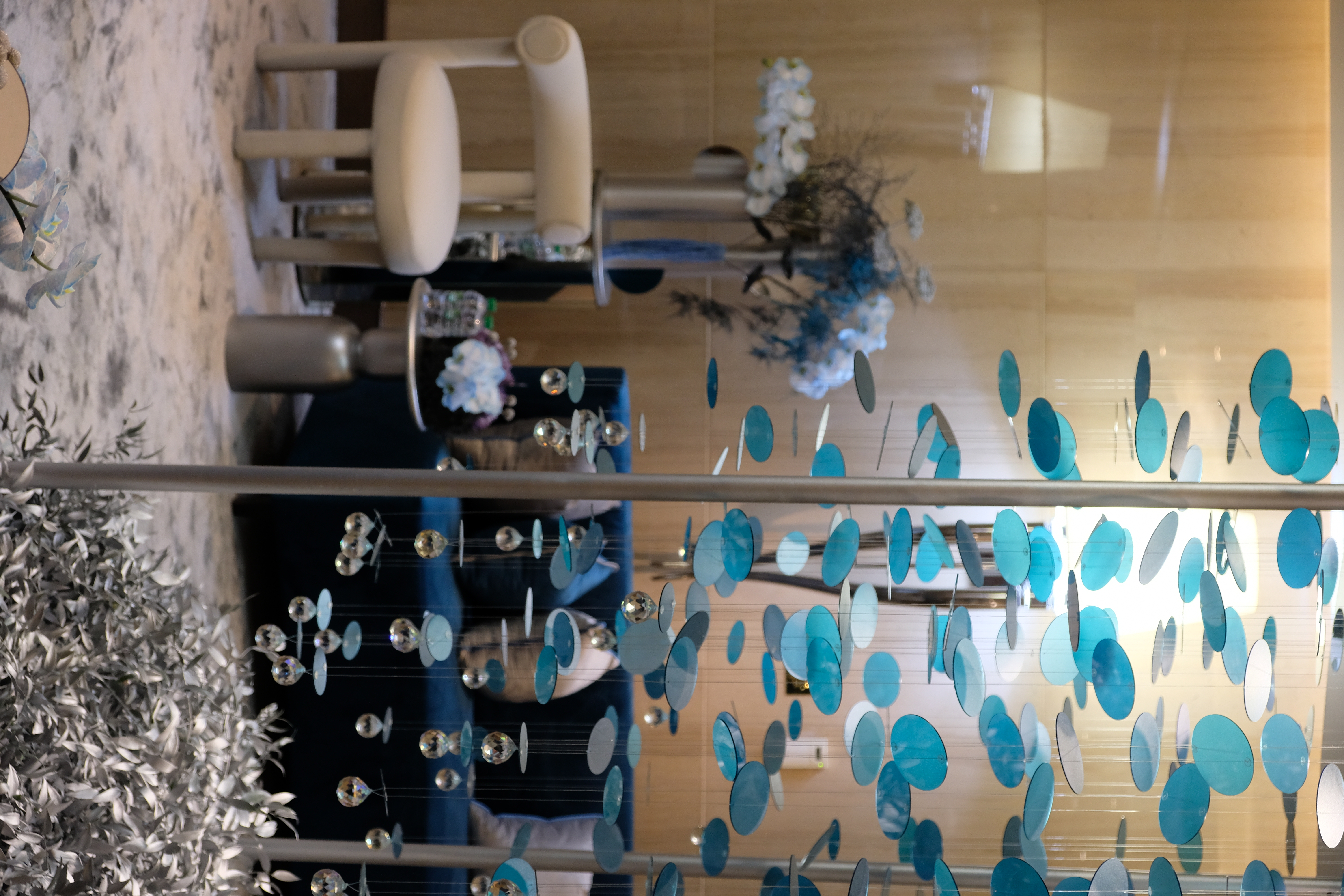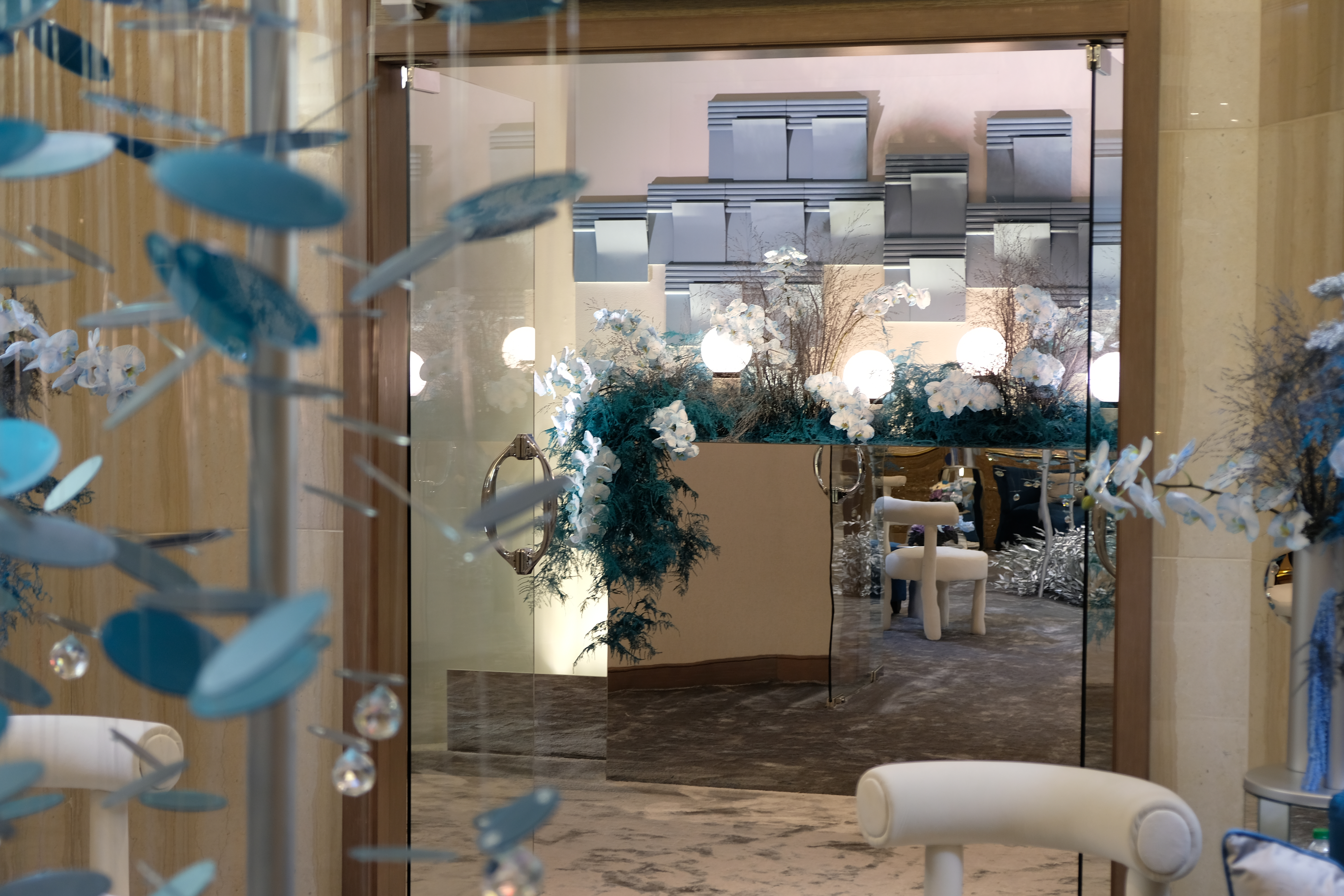The floral arrangements, too, are an extension of this aesthetic—deliberate, sculptural, and ethereal. Orchids, tinted in icy blues, emerge from a landscape of silver and steel-toned foliage, softening the architectural language yet maintaining its strength. Floral compositions defy the expected, seamlessly integrating with the metallic framework, growing through refined industrial forms rather than around them.