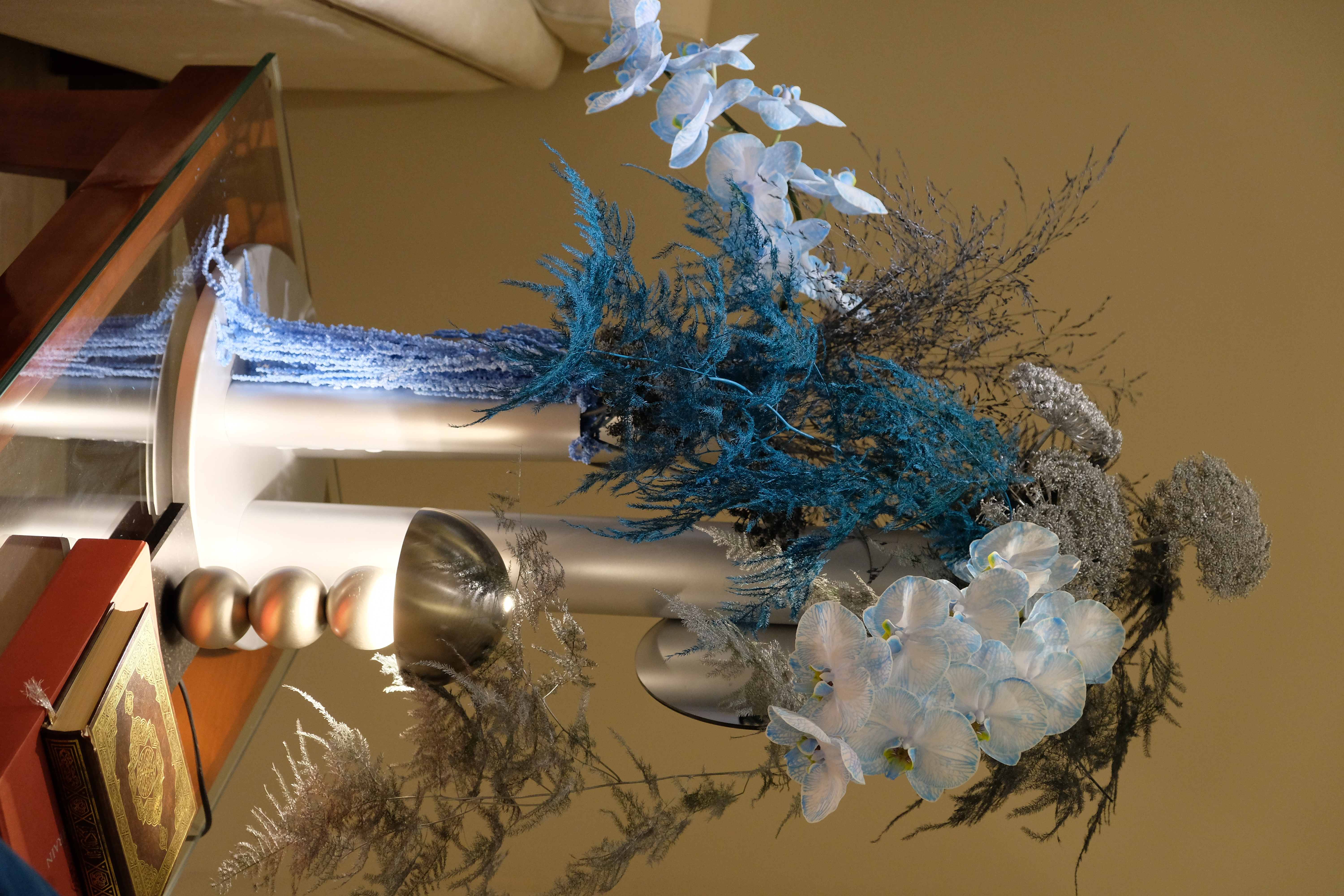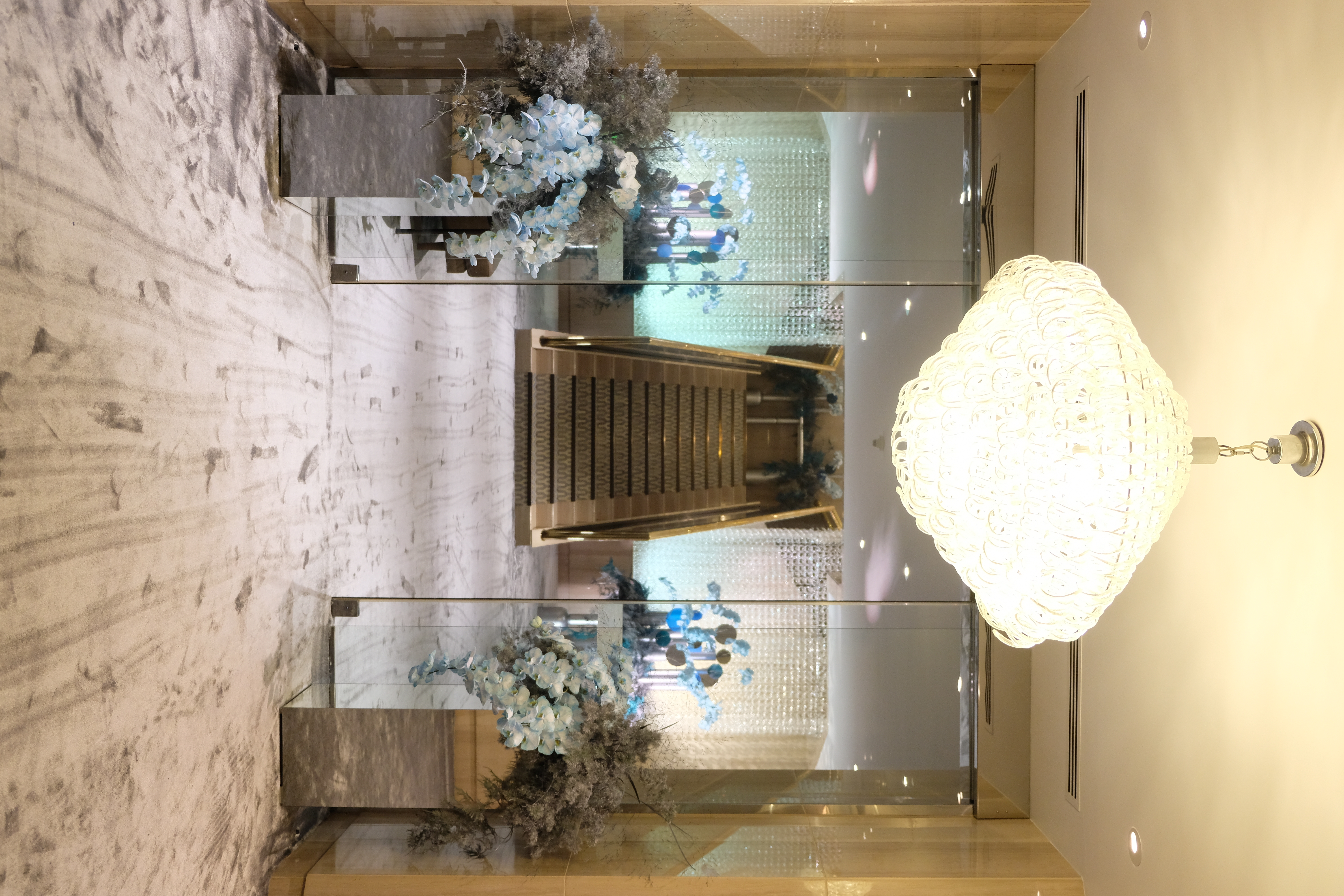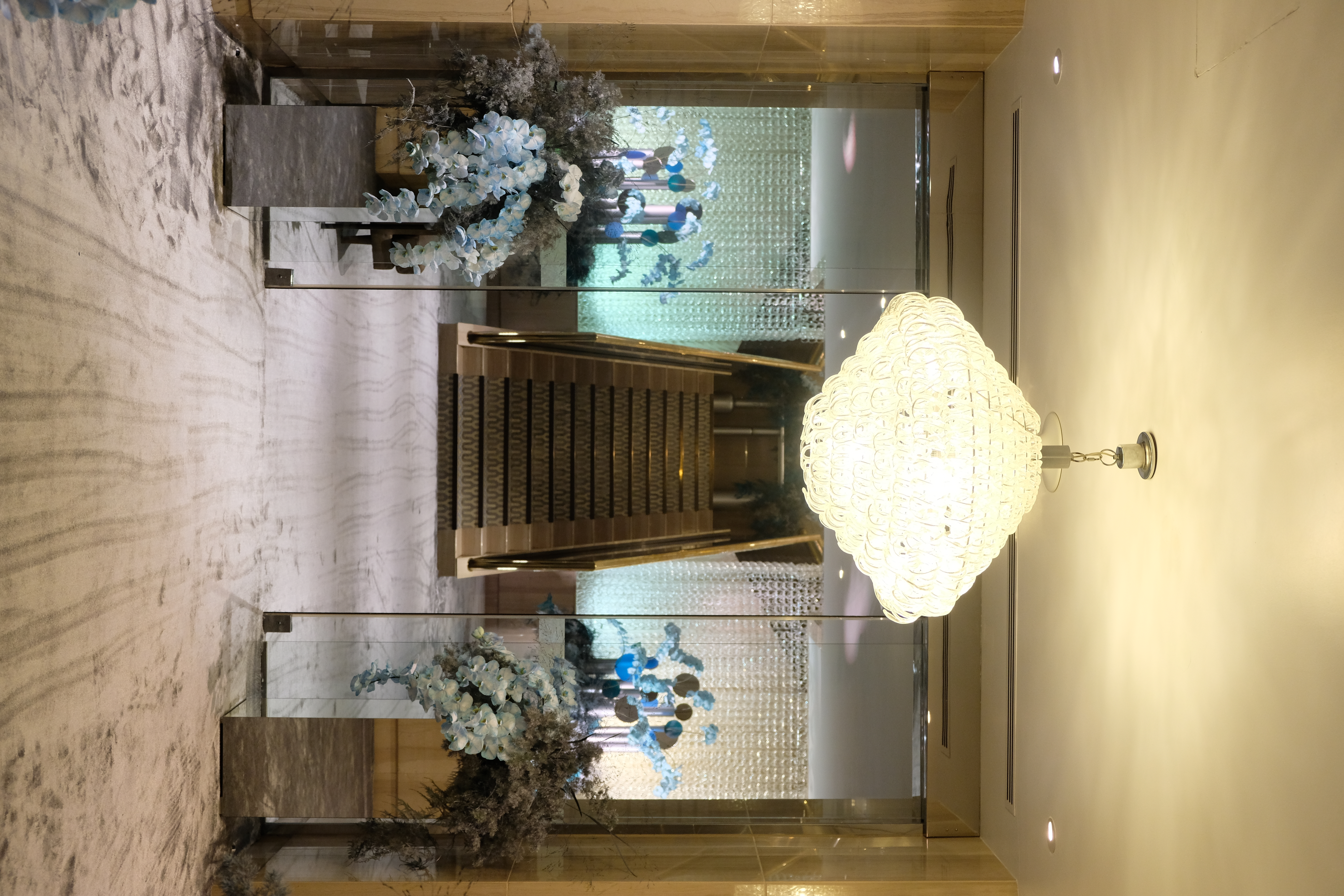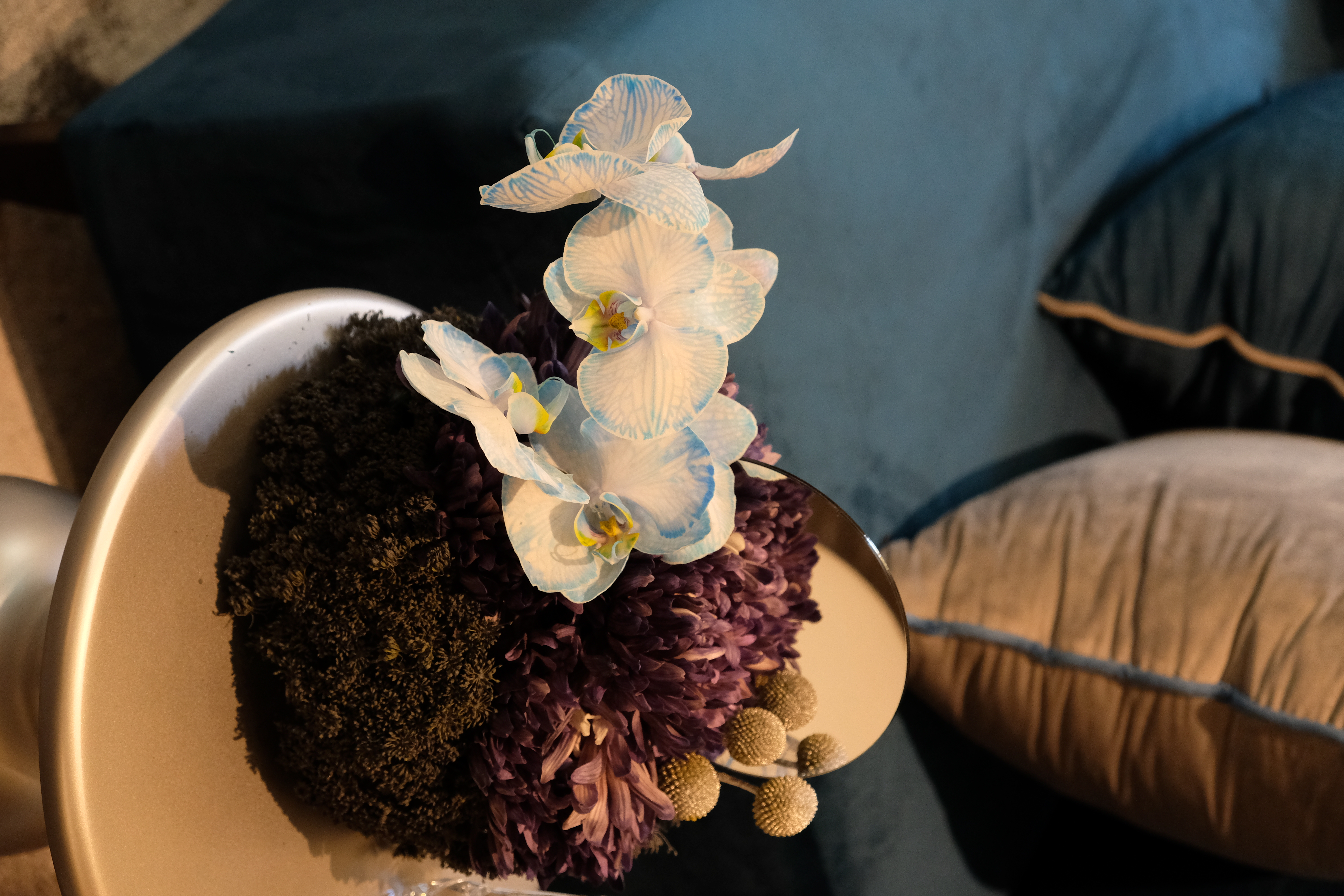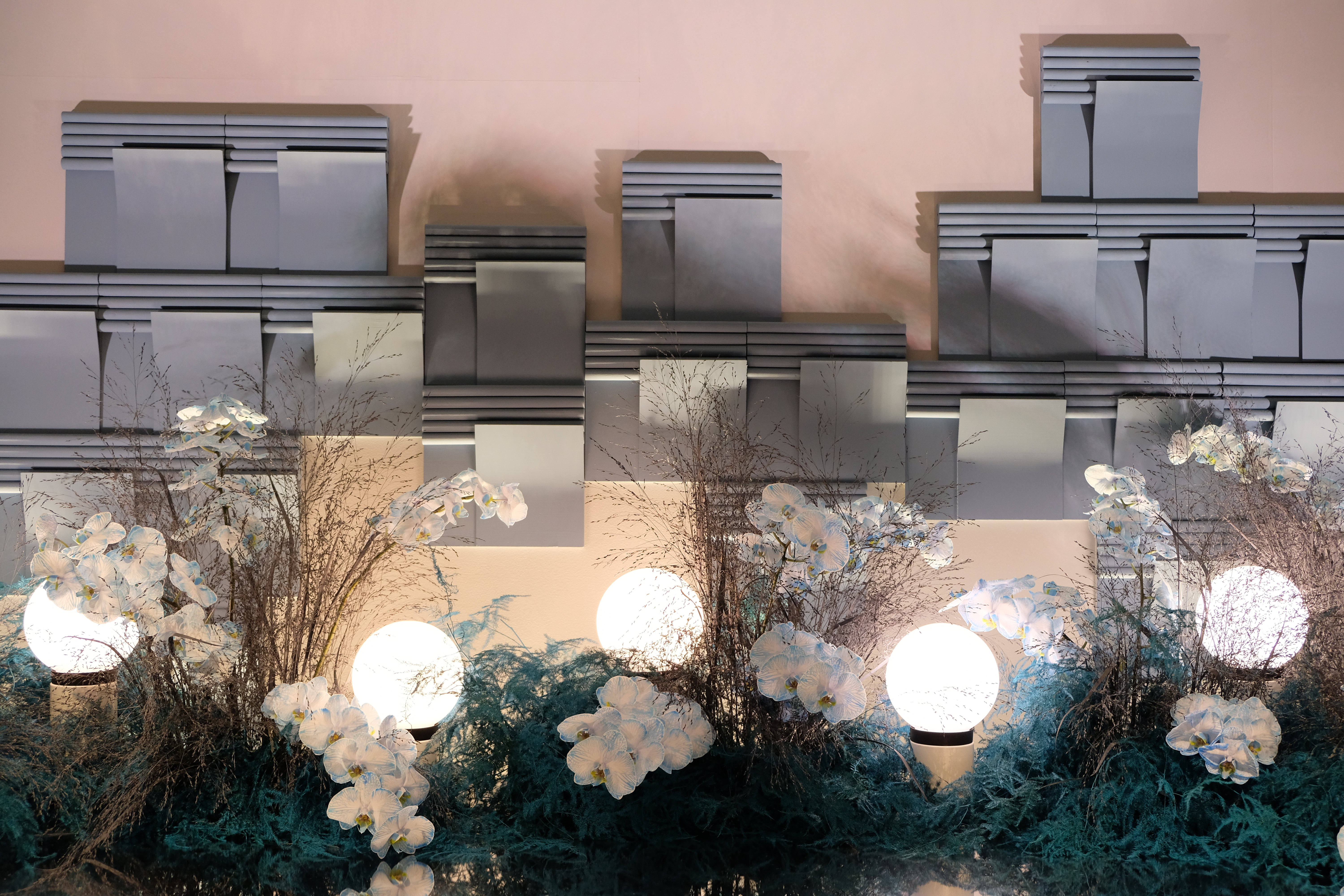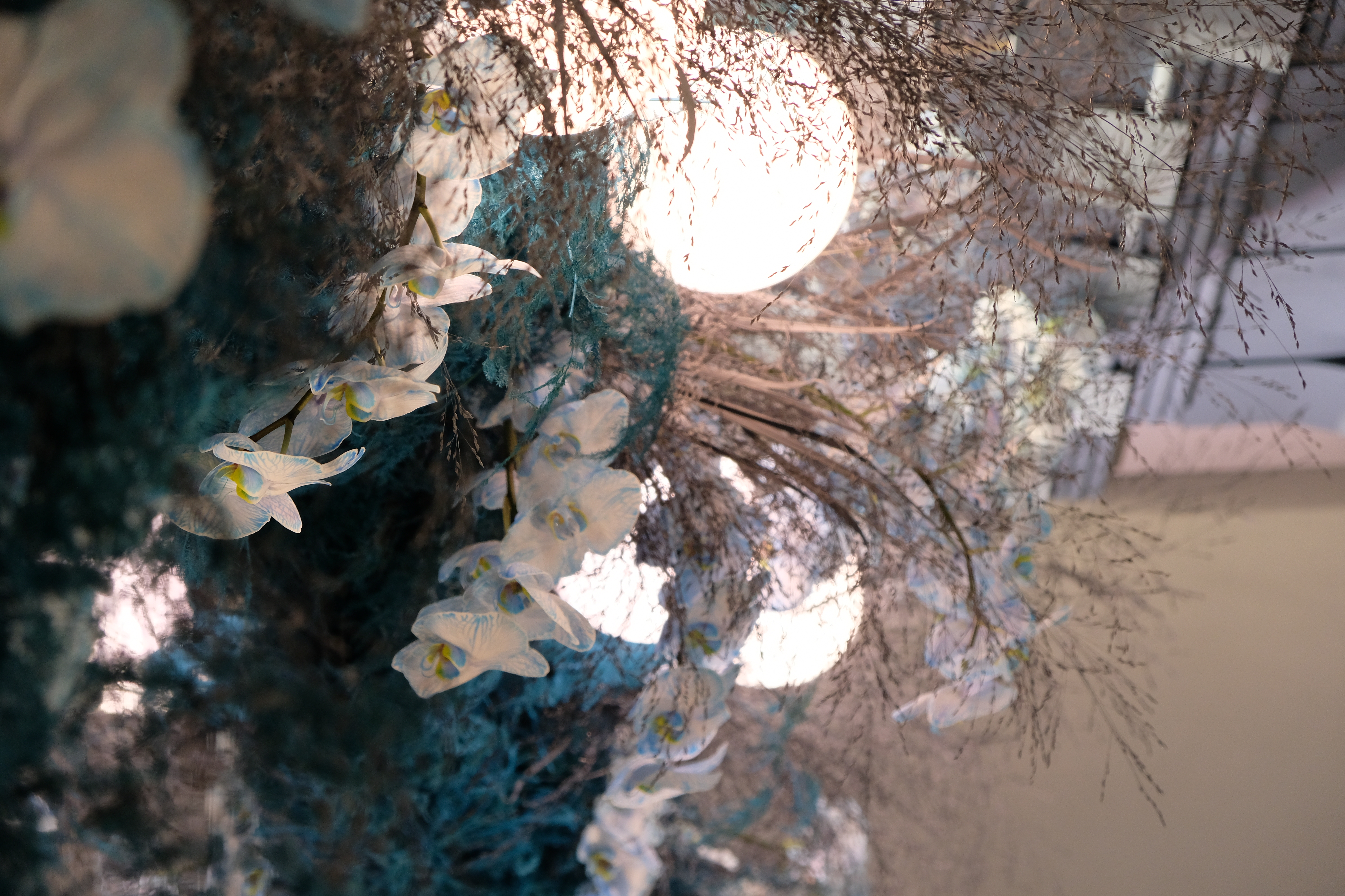 The floral arrangements, too, are an extension of this aesthetic—deliberate, sculptural, and ethereal. Orchids, tinted in icy blues, emerge from a landscape of silver and steel-toned foliage, softening the architectural language yet maintaining its strength. Floral compositions defy the expected, seamlessly integrating with the metallic framework, growing through refined industrial forms rather than around them.