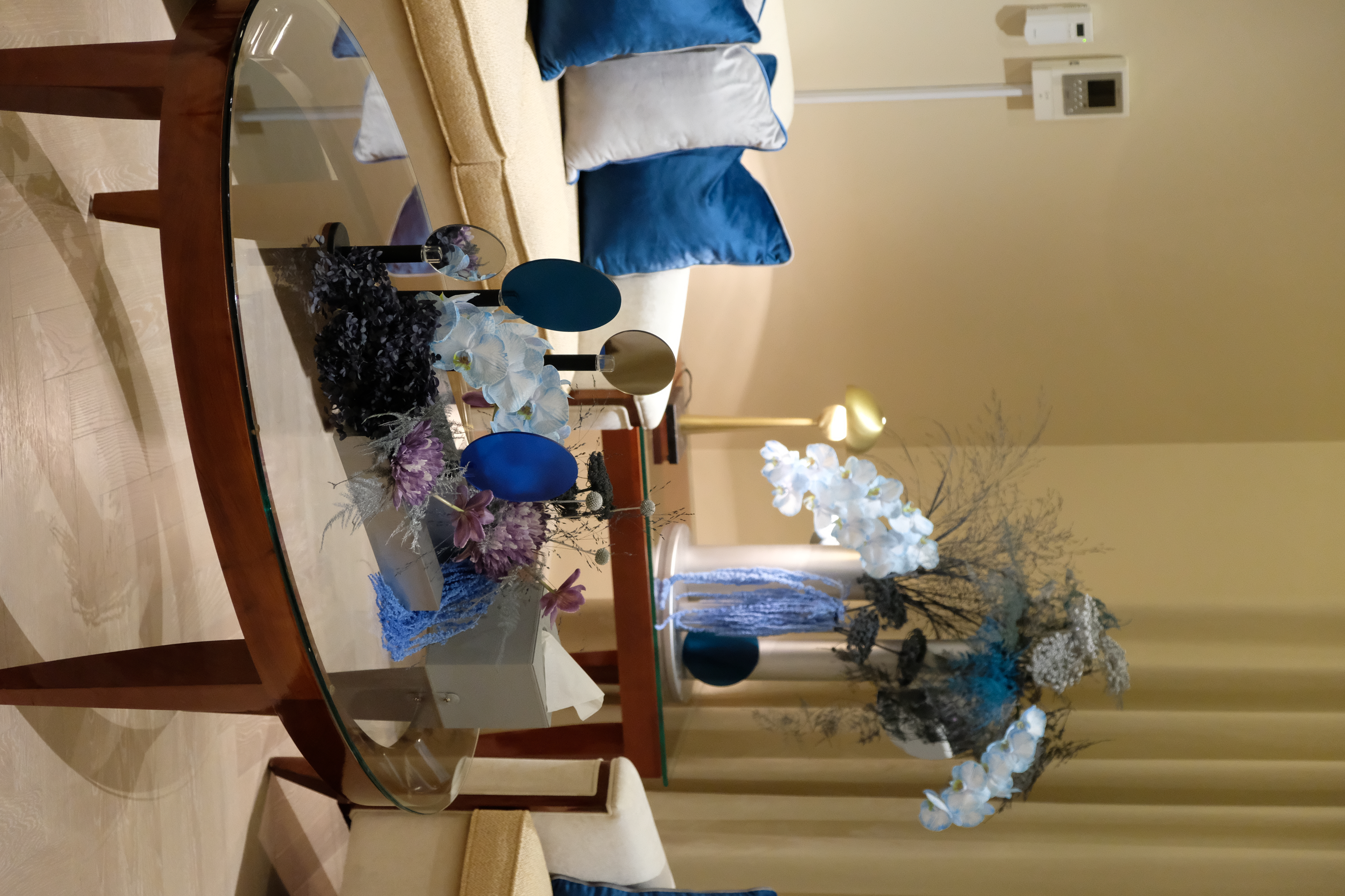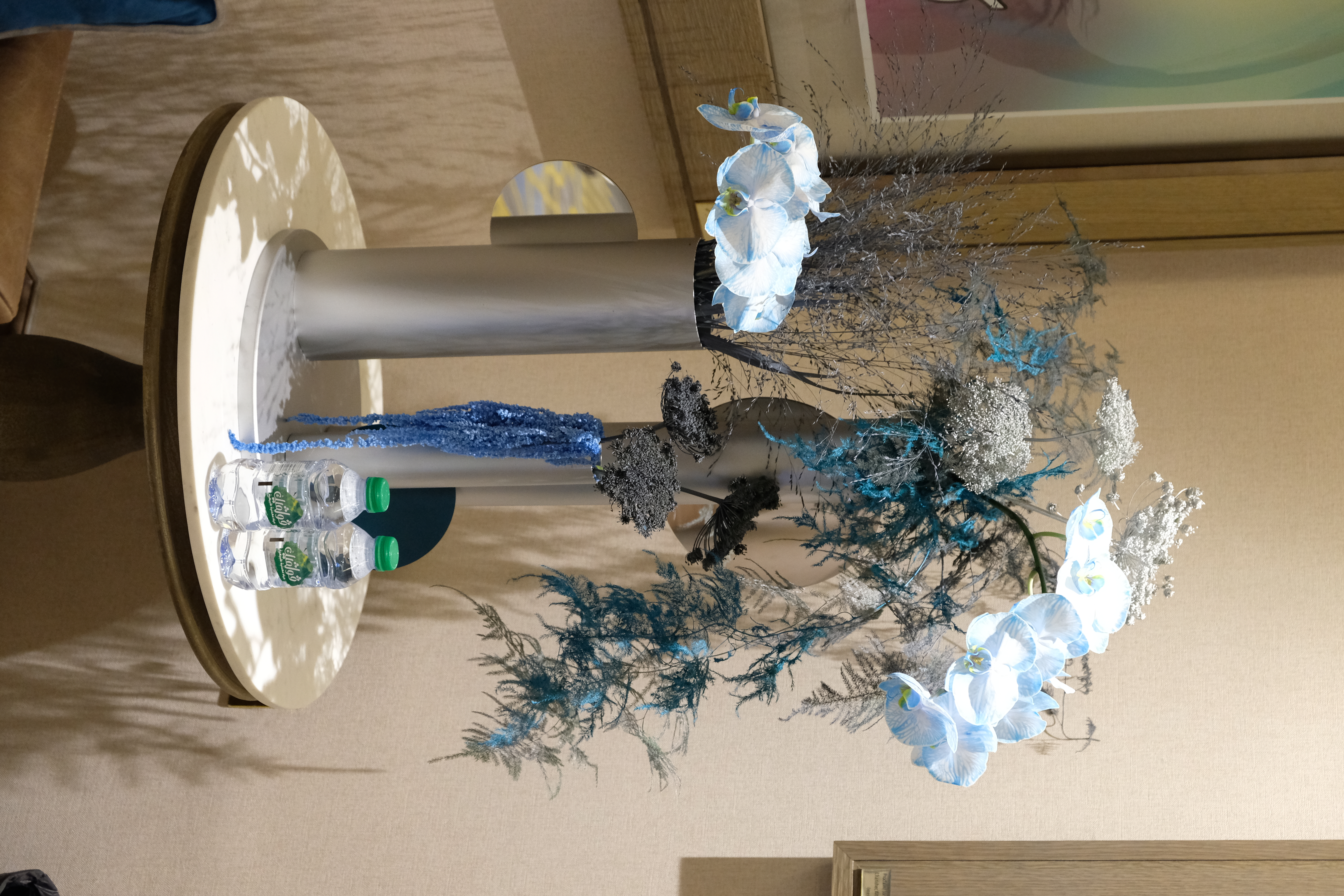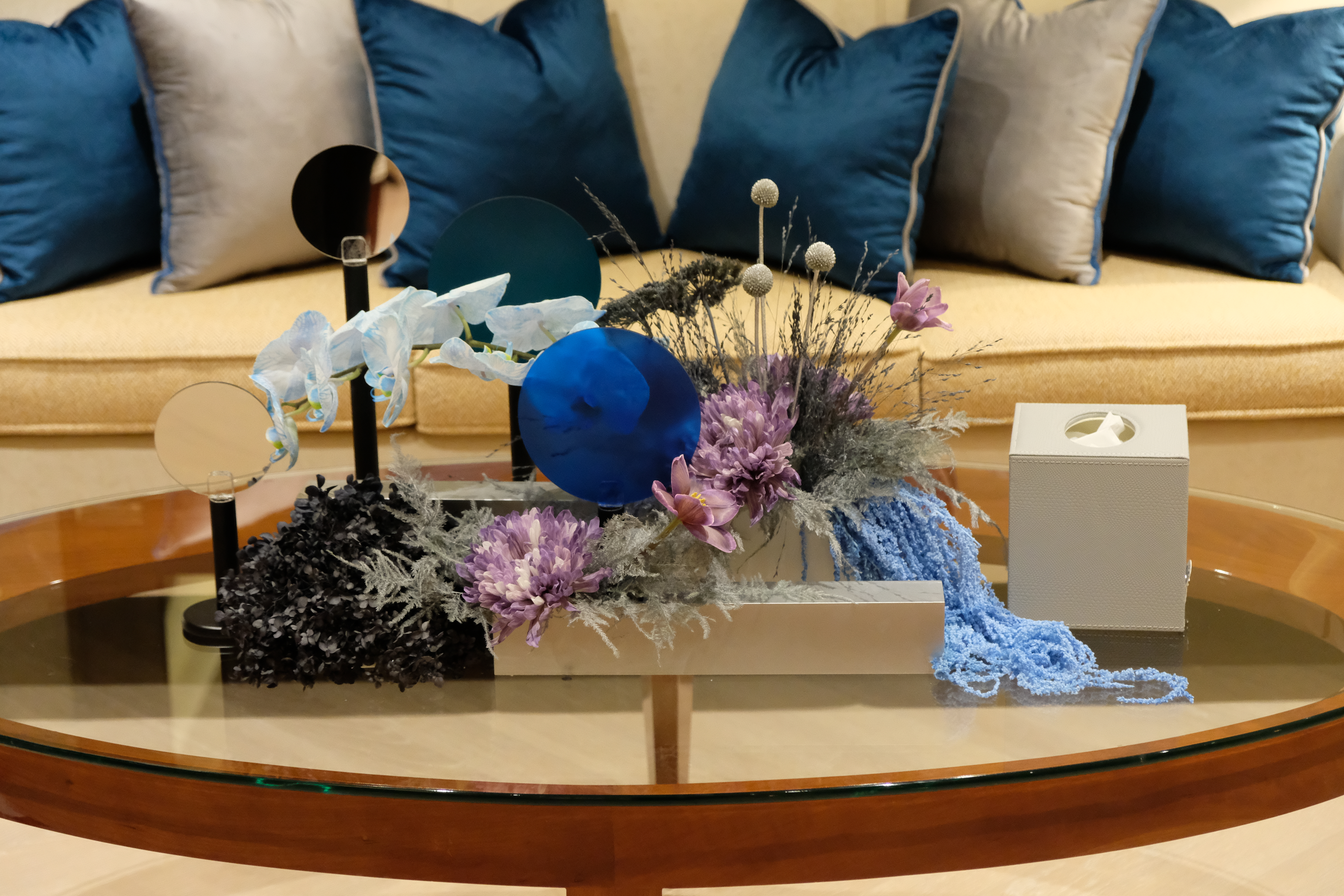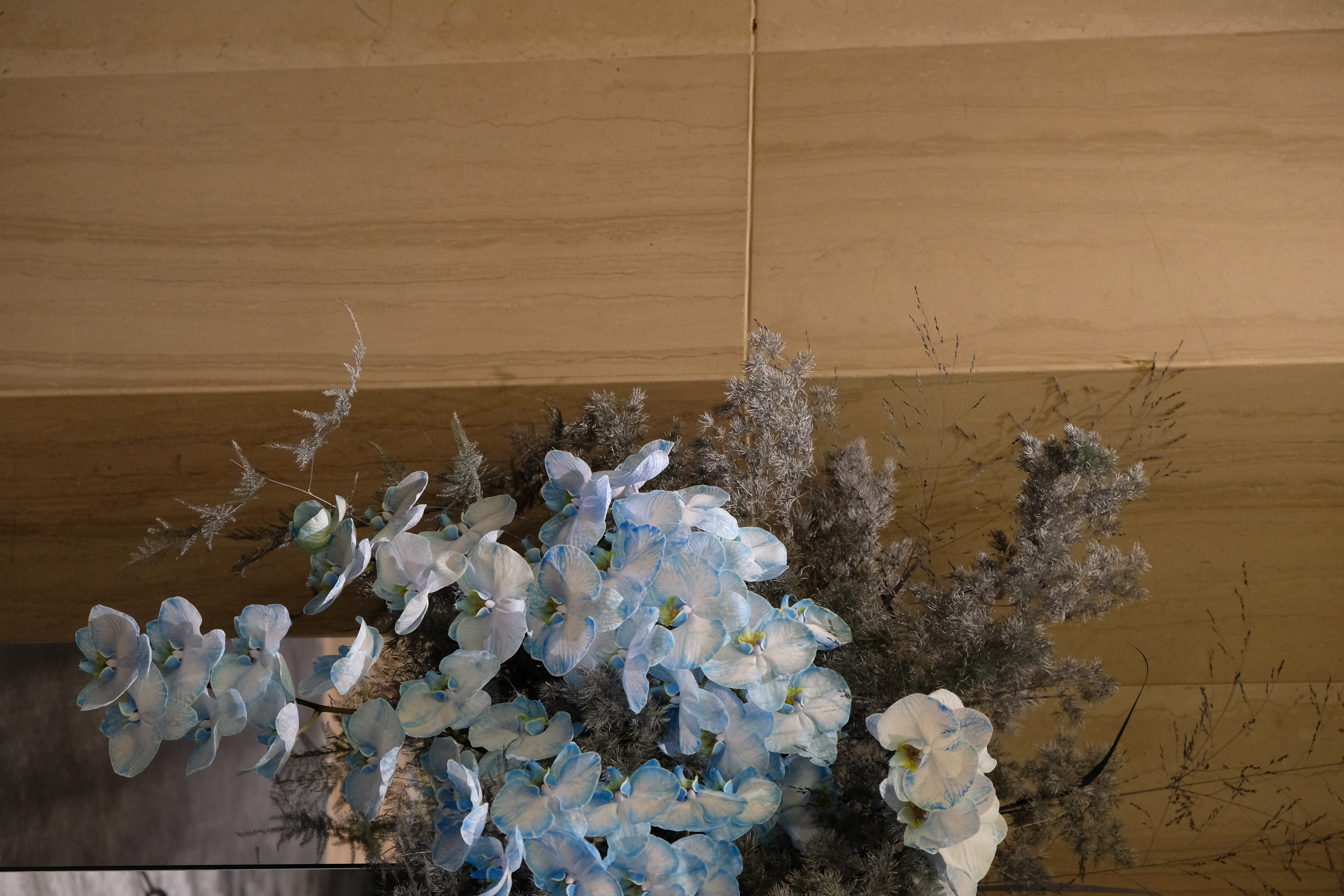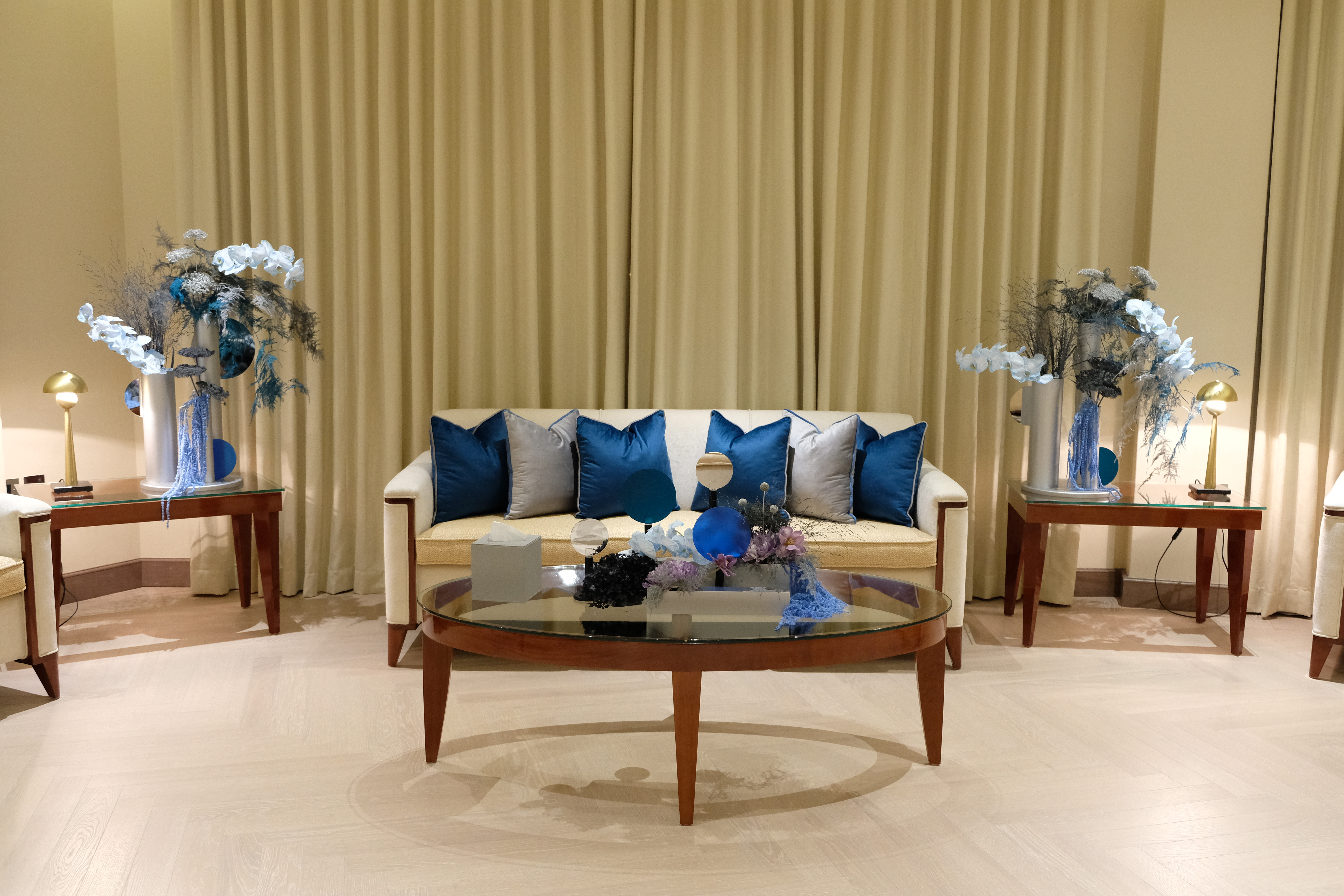 The floral arrangements, too, are an extension of this aesthetic—deliberate, sculptural, and ethereal. Orchids, tinted in icy blues, emerge from a landscape of silver and steel-toned foliage, softening the architectural language yet maintaining its strength. Floral compositions defy the expected, seamlessly integrating with the metallic framework, growing through refined industrial forms rather than around them.