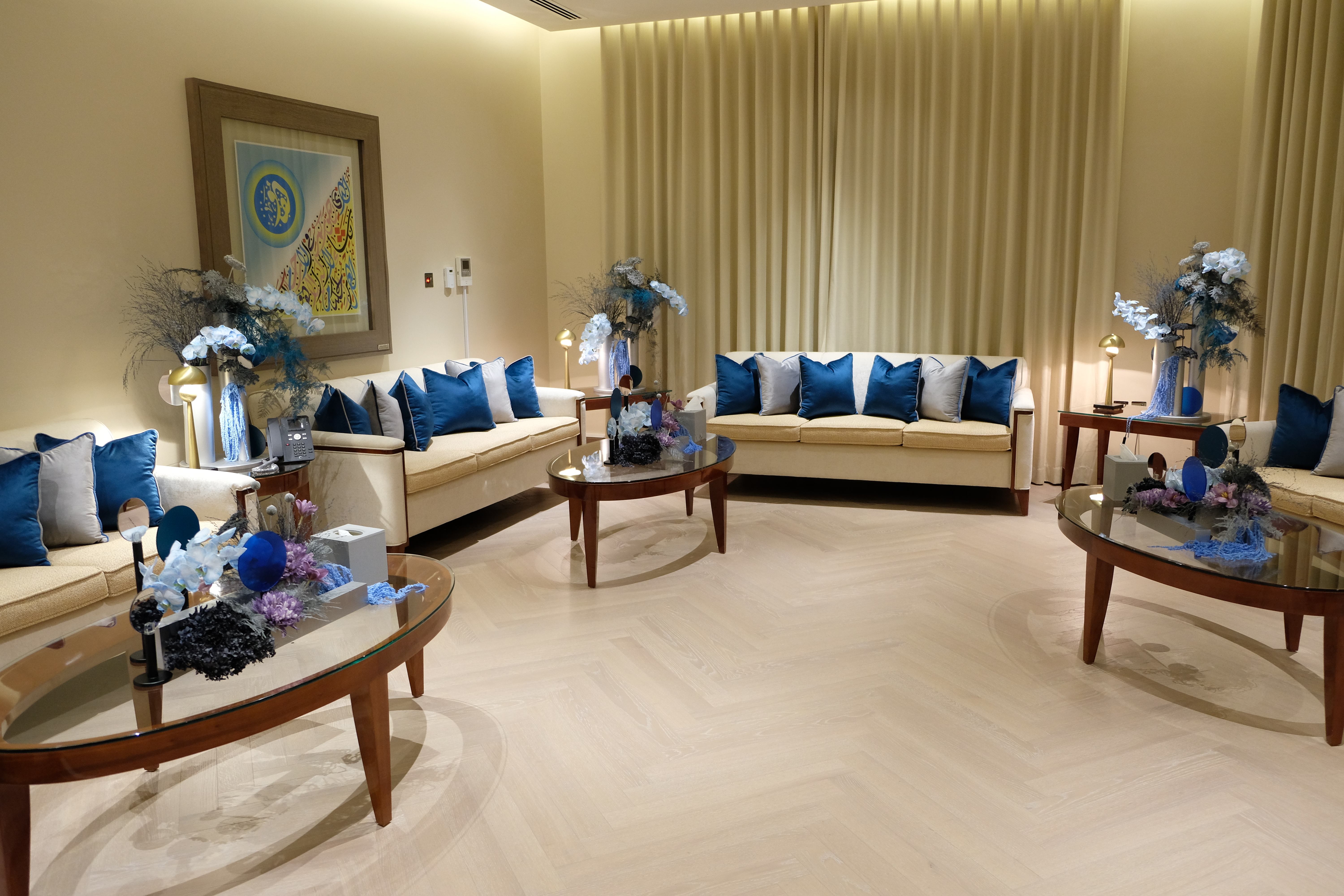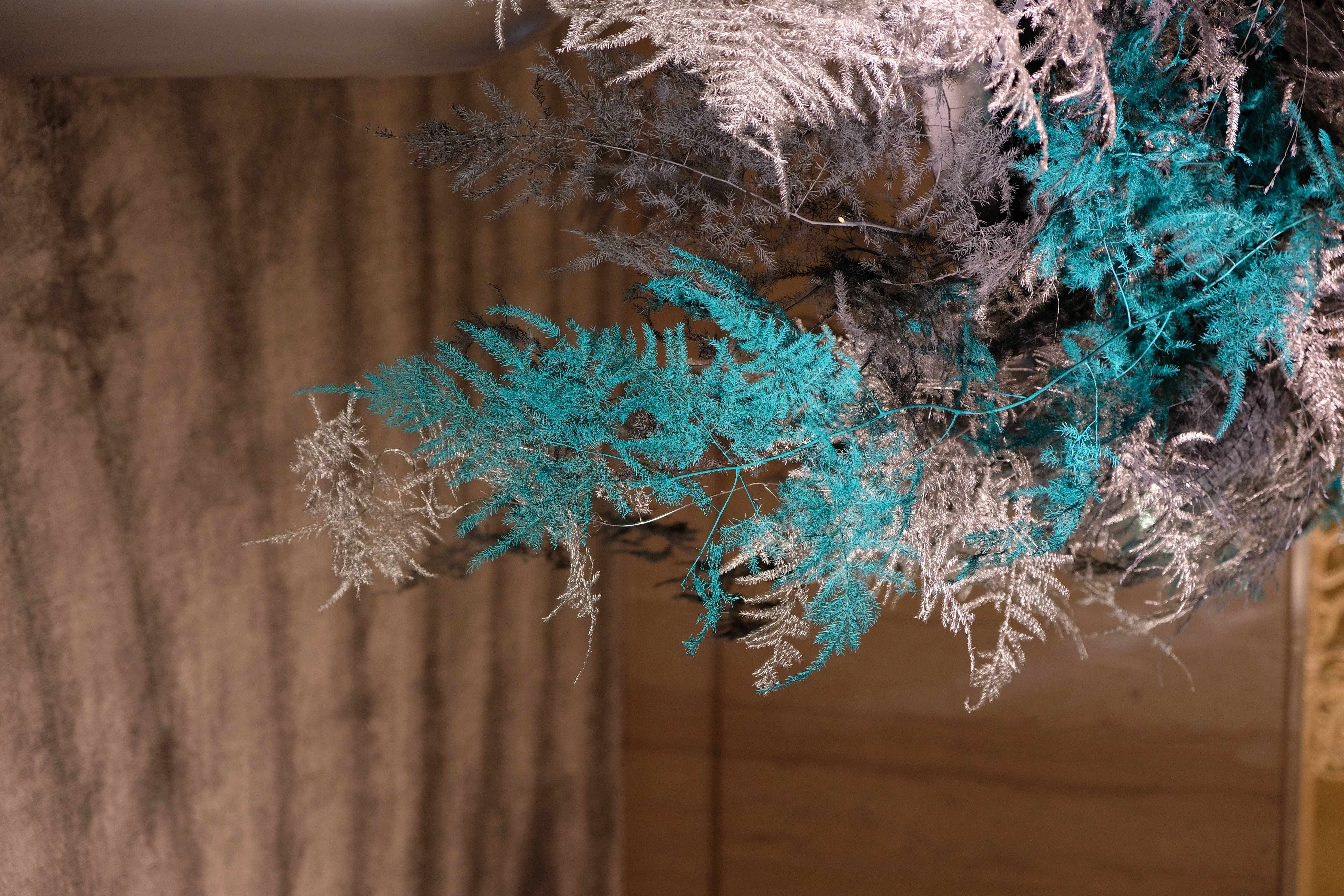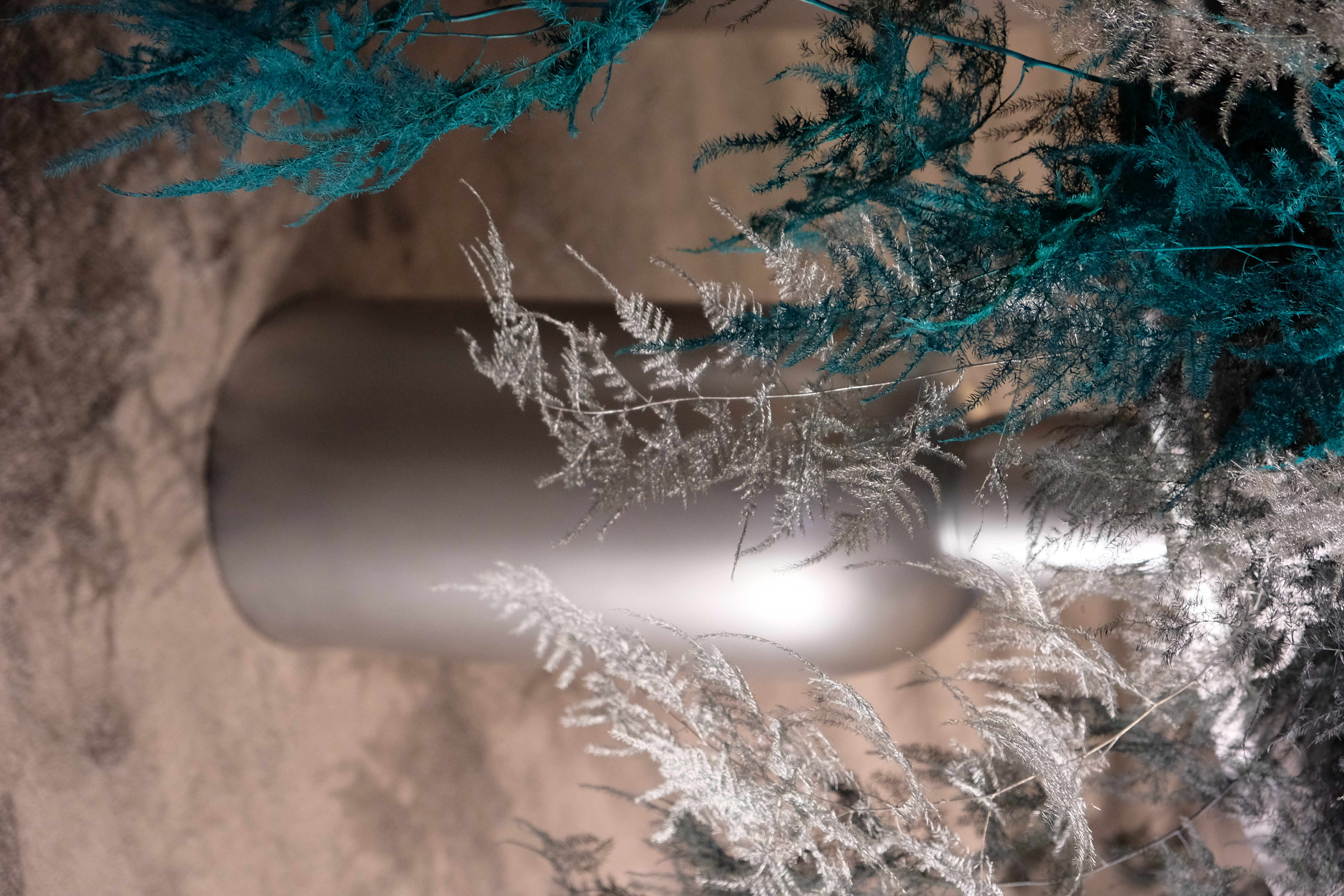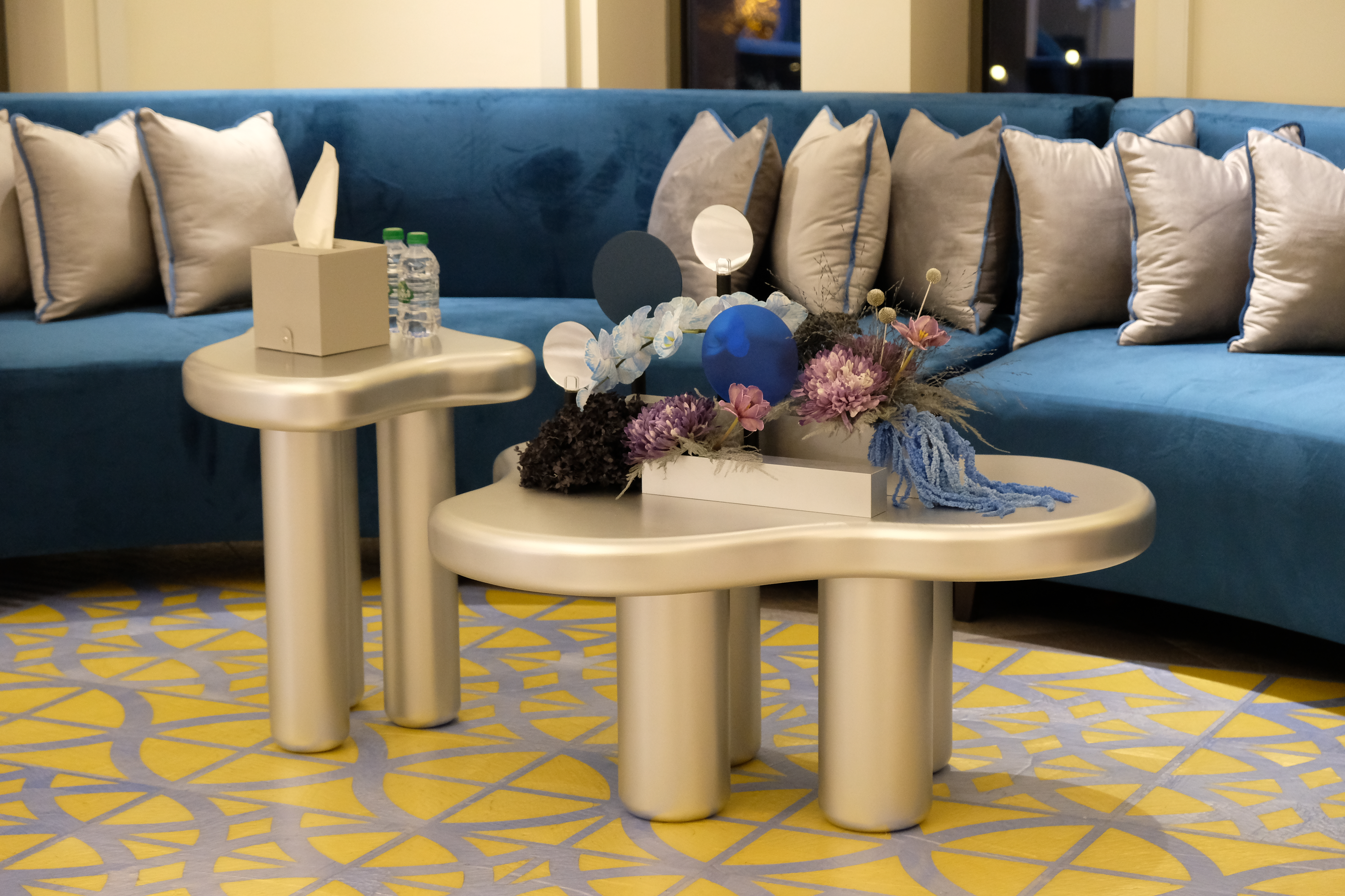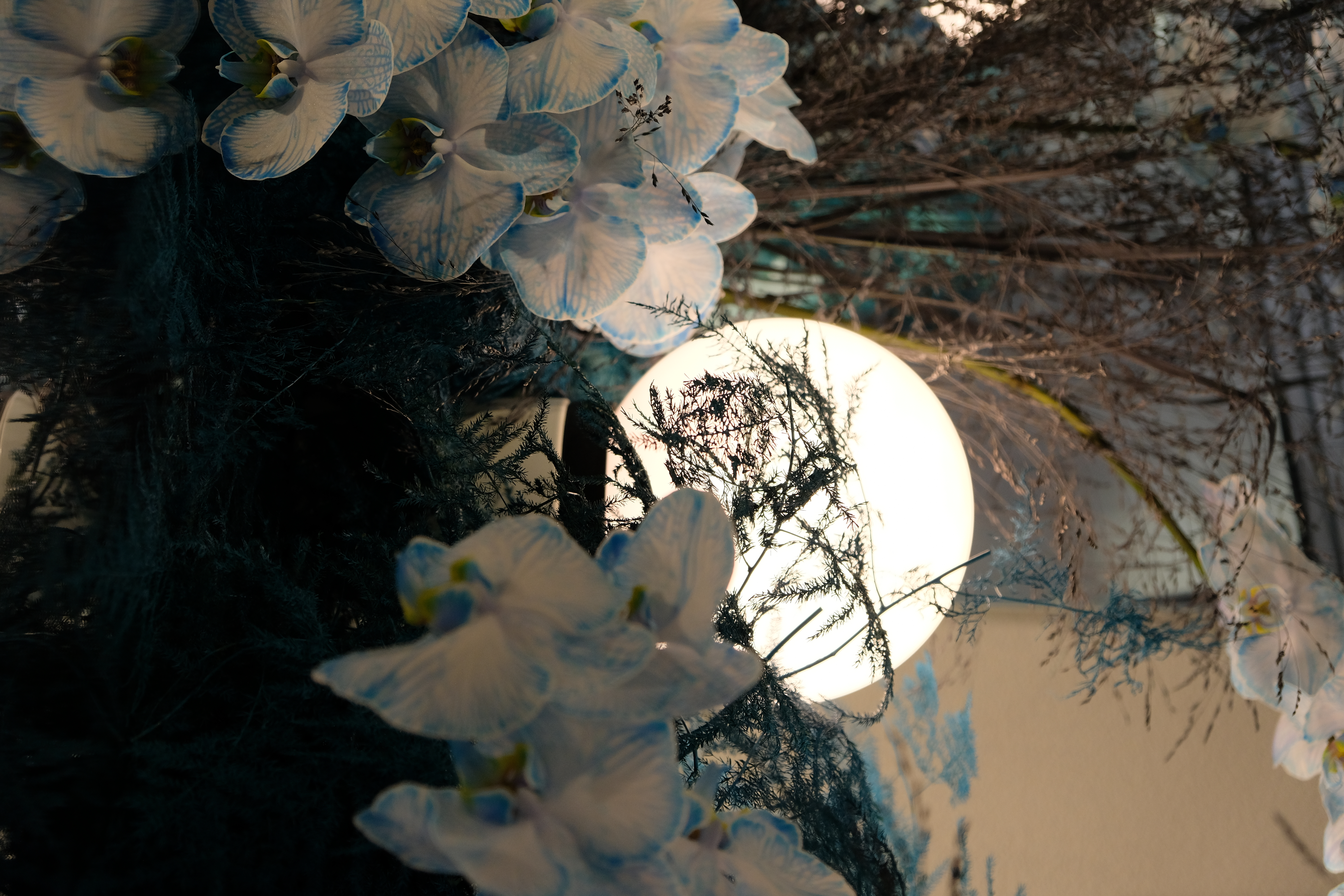 The floral arrangements, too, are an extension of this aesthetic—deliberate, sculptural, and ethereal. Orchids, tinted in icy blues, emerge from a landscape of silver and steel-toned foliage, softening the architectural language yet maintaining its strength. Floral compositions defy the expected, seamlessly integrating with the metallic framework, growing through refined industrial forms rather than around them.