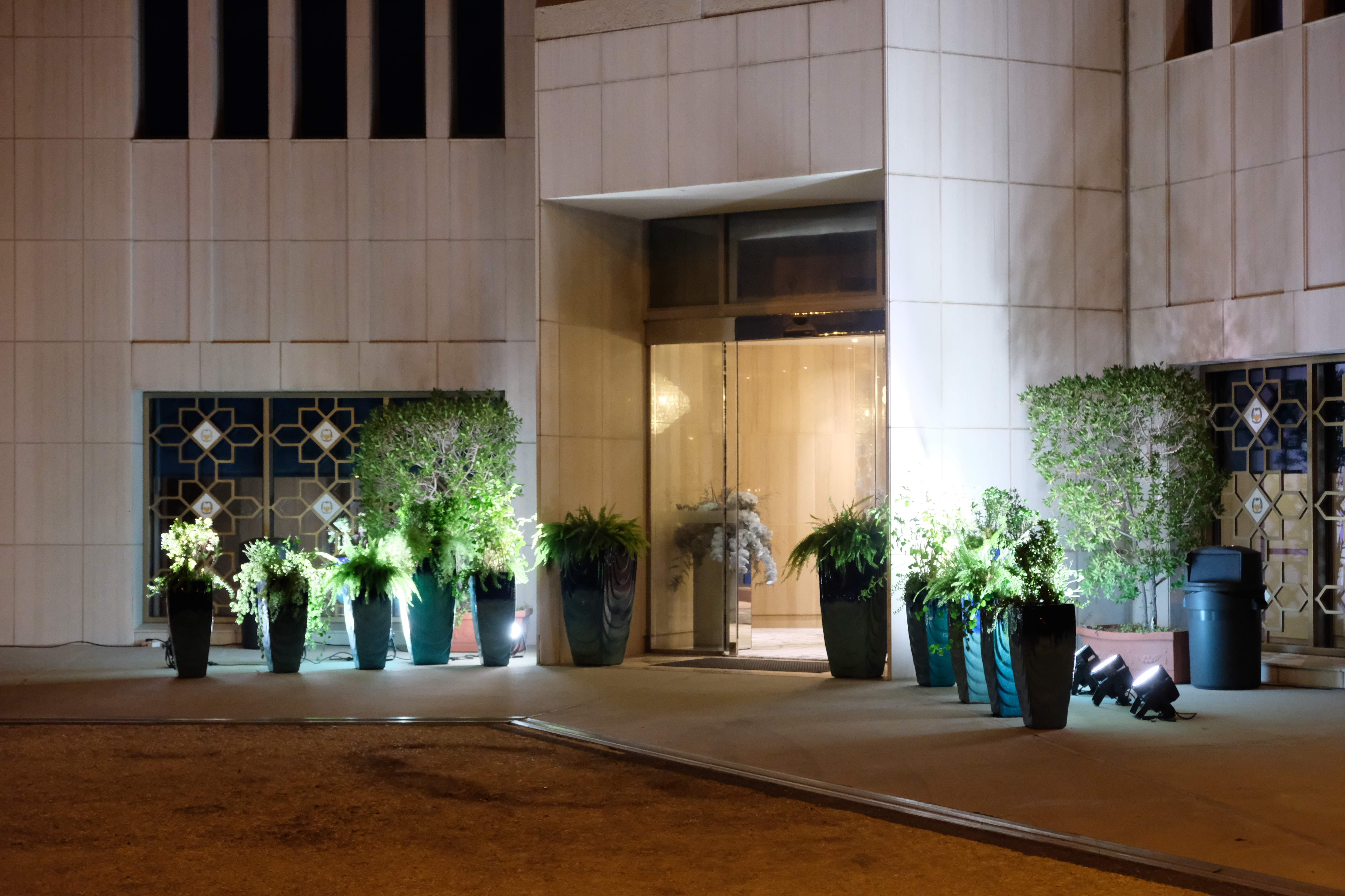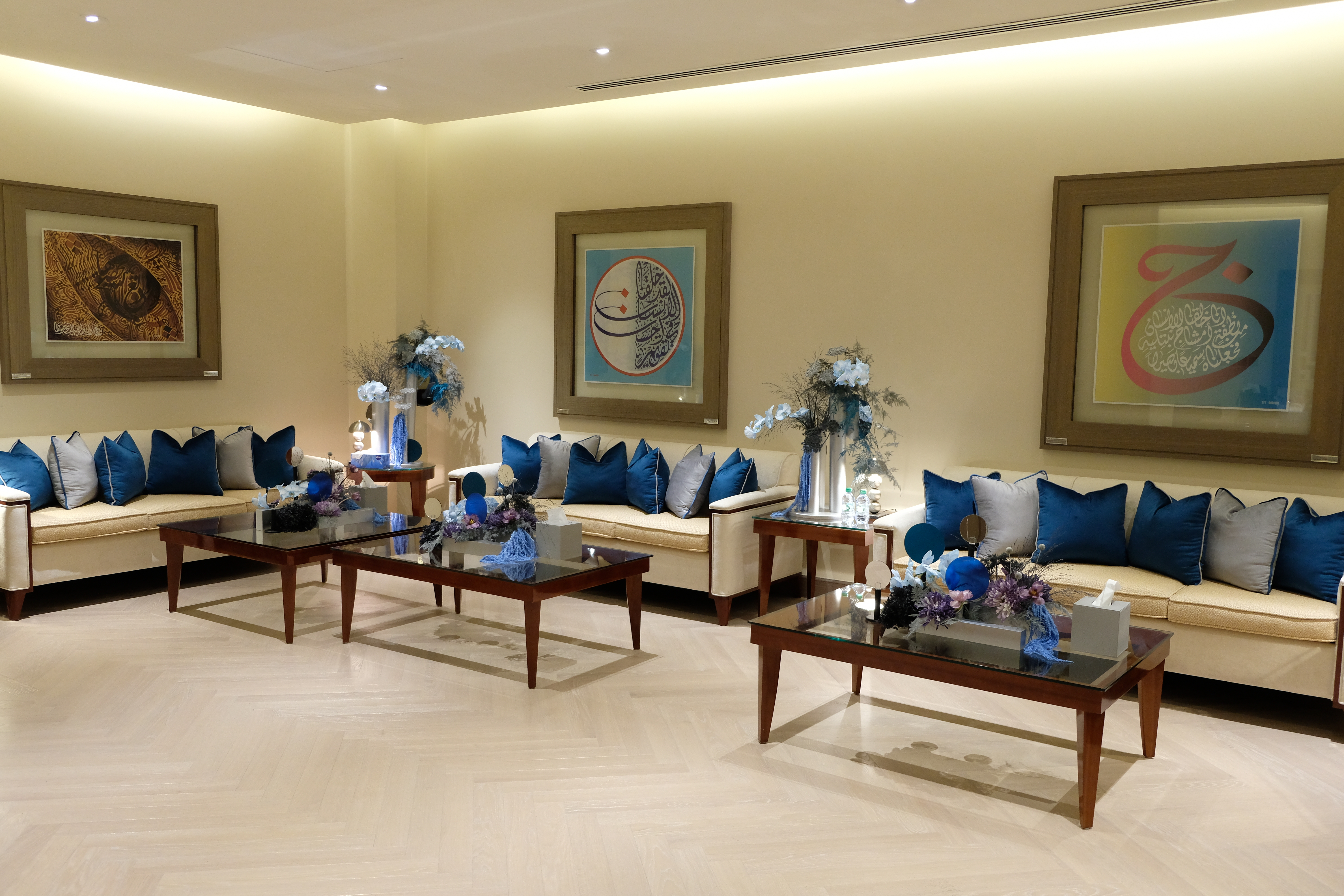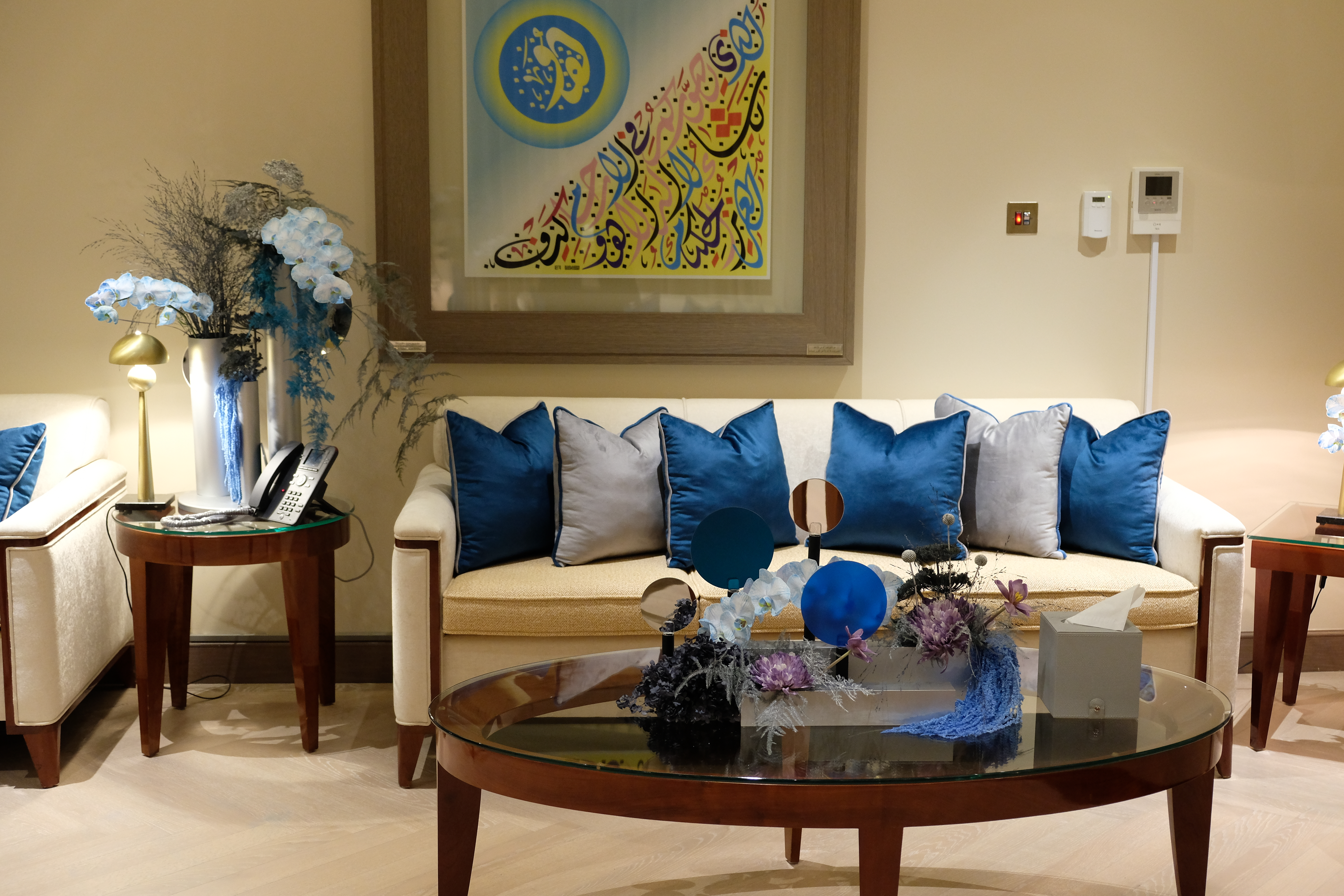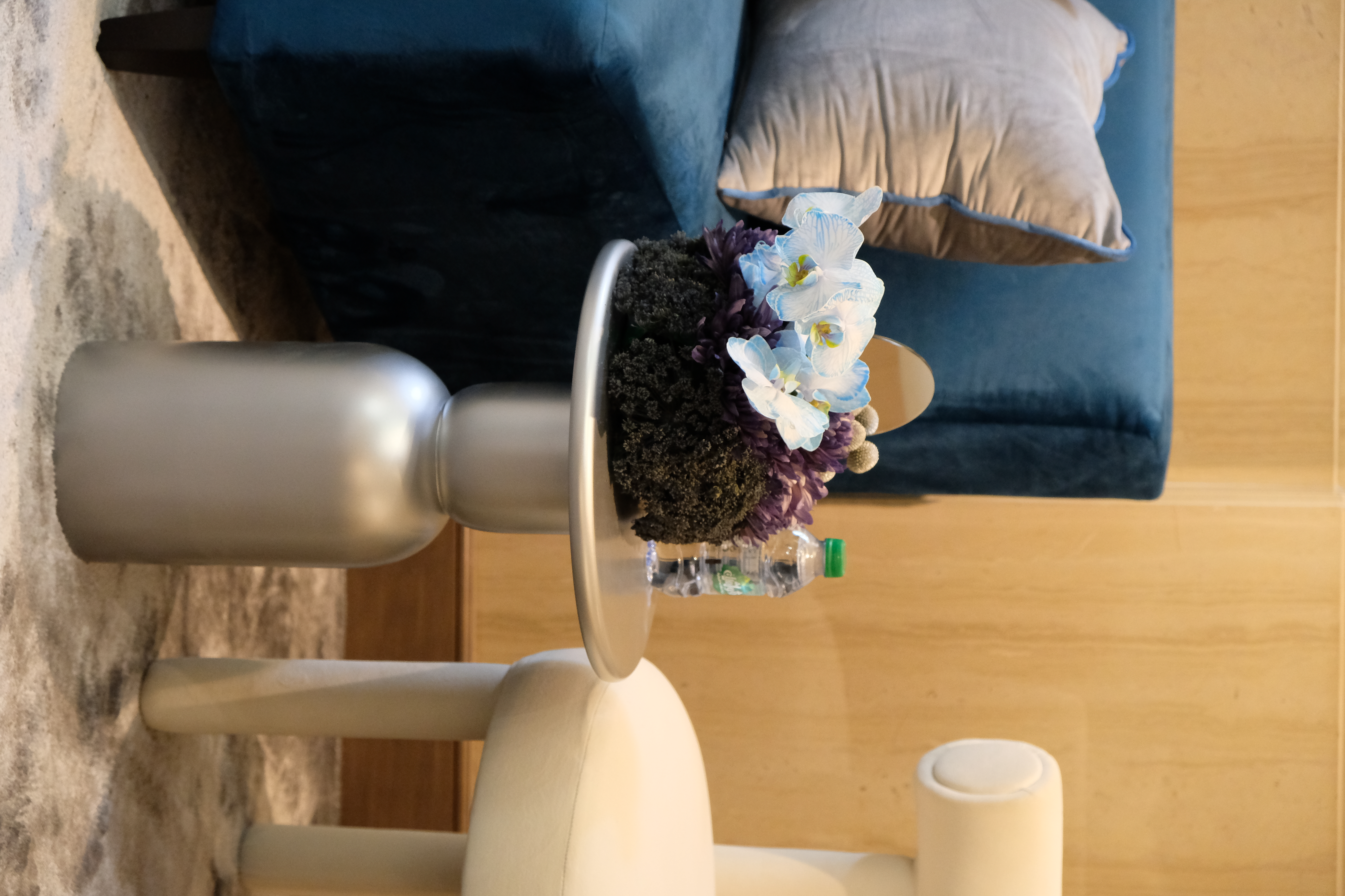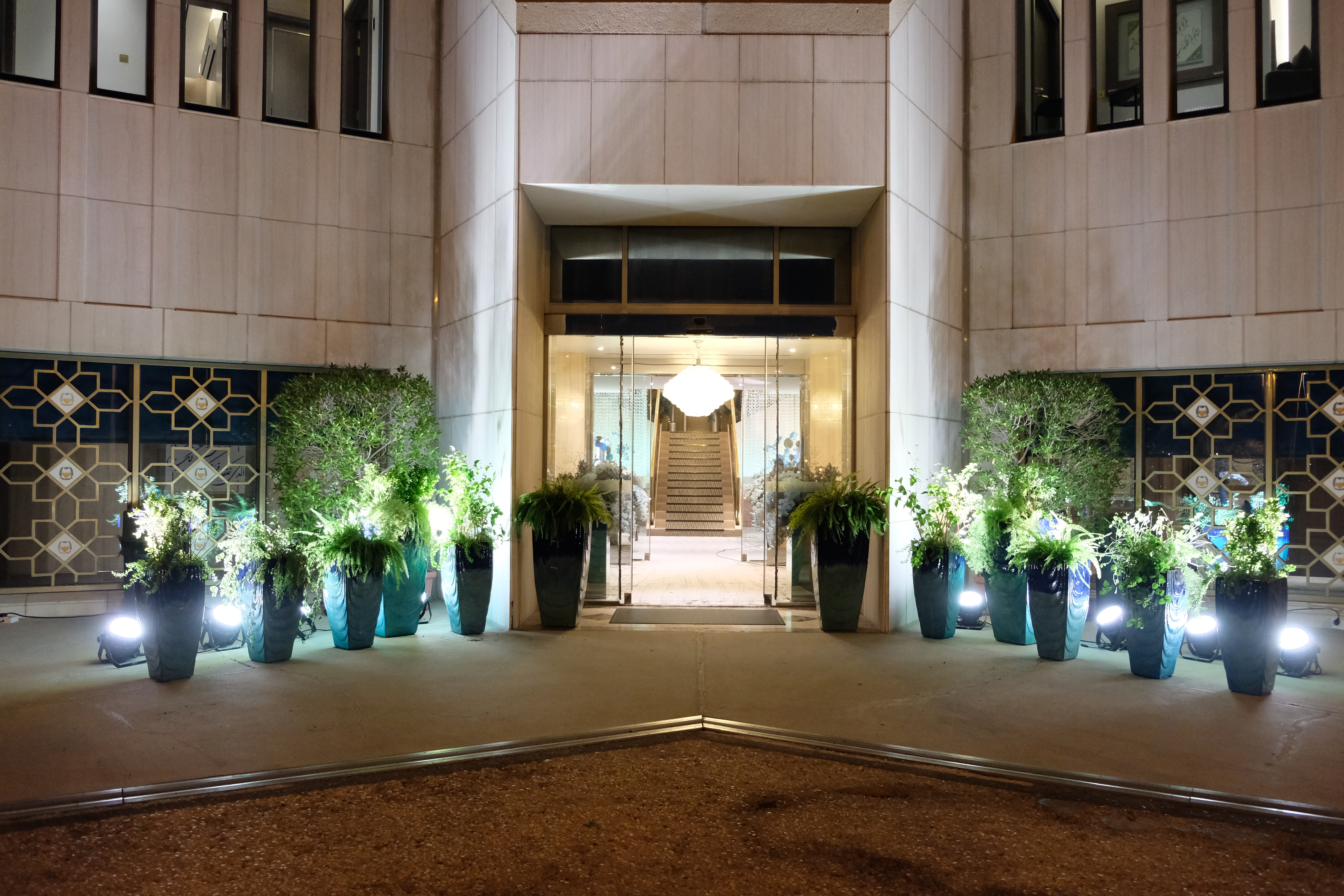 The floral arrangements, too, are an extension of this aesthetic—deliberate, sculptural, and ethereal. Orchids, tinted in icy blues, emerge from a landscape of silver and steel-toned foliage, softening the architectural language yet maintaining its strength. Floral compositions defy the expected, seamlessly integrating with the metallic framework, growing through refined industrial forms rather than around them.