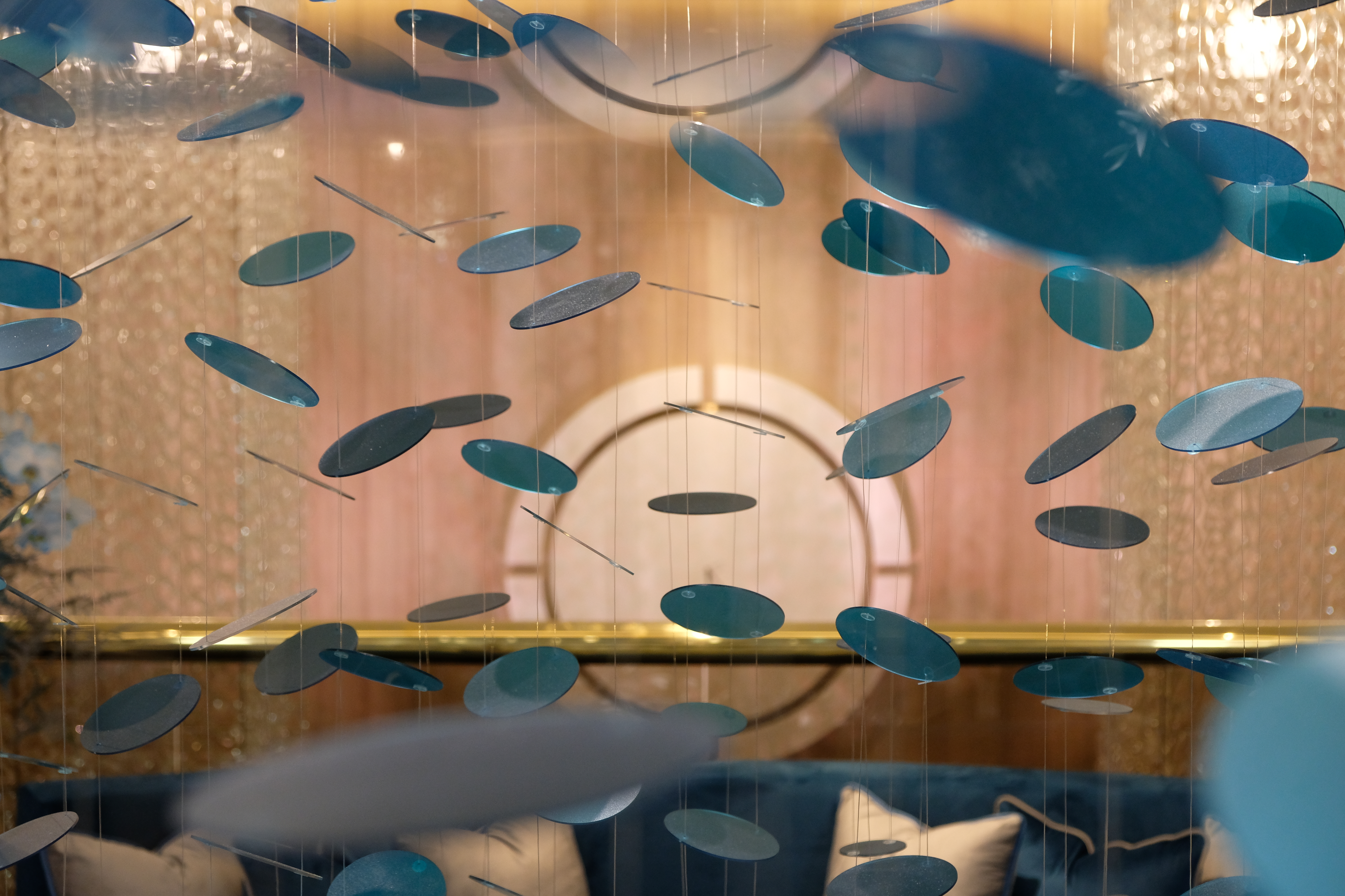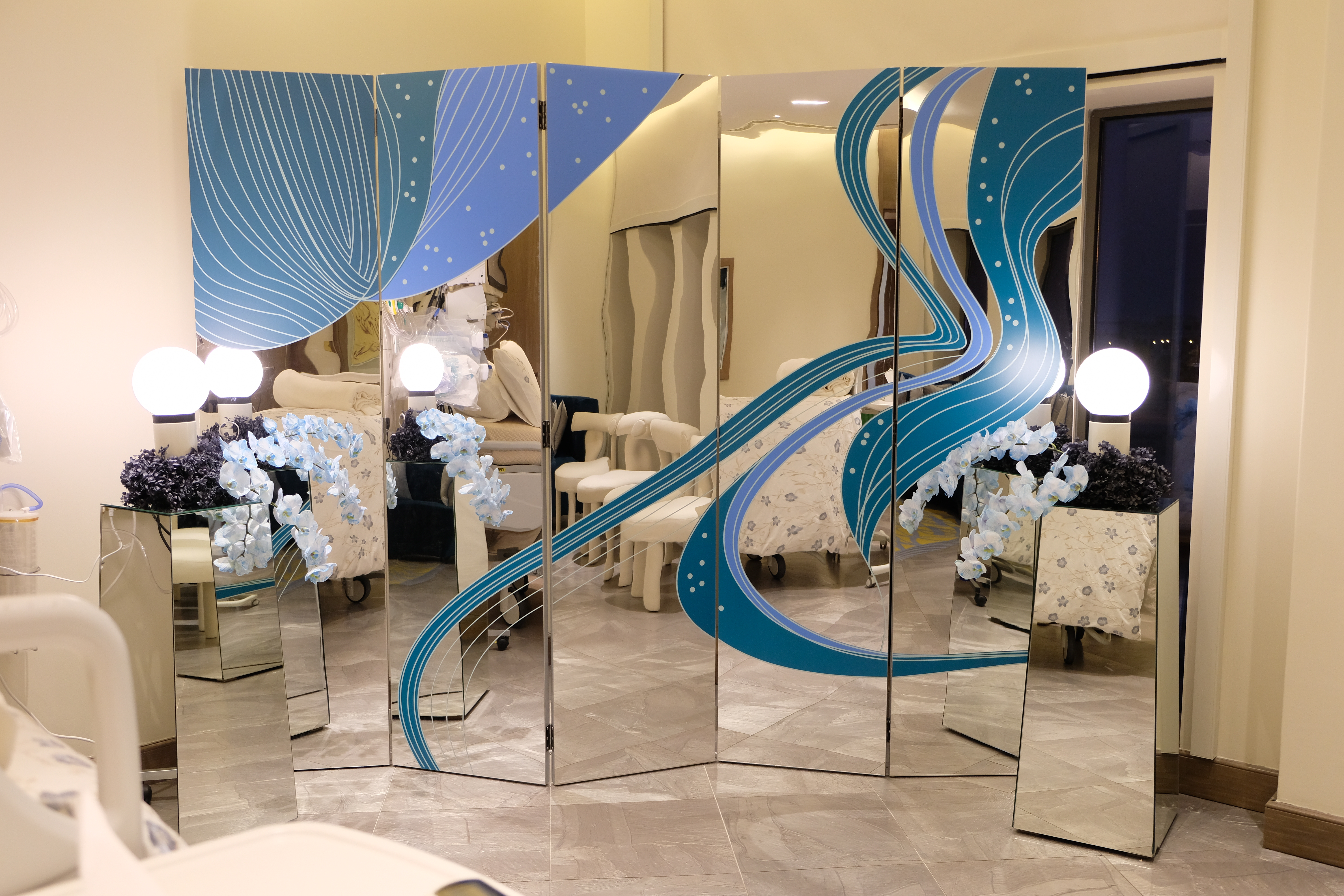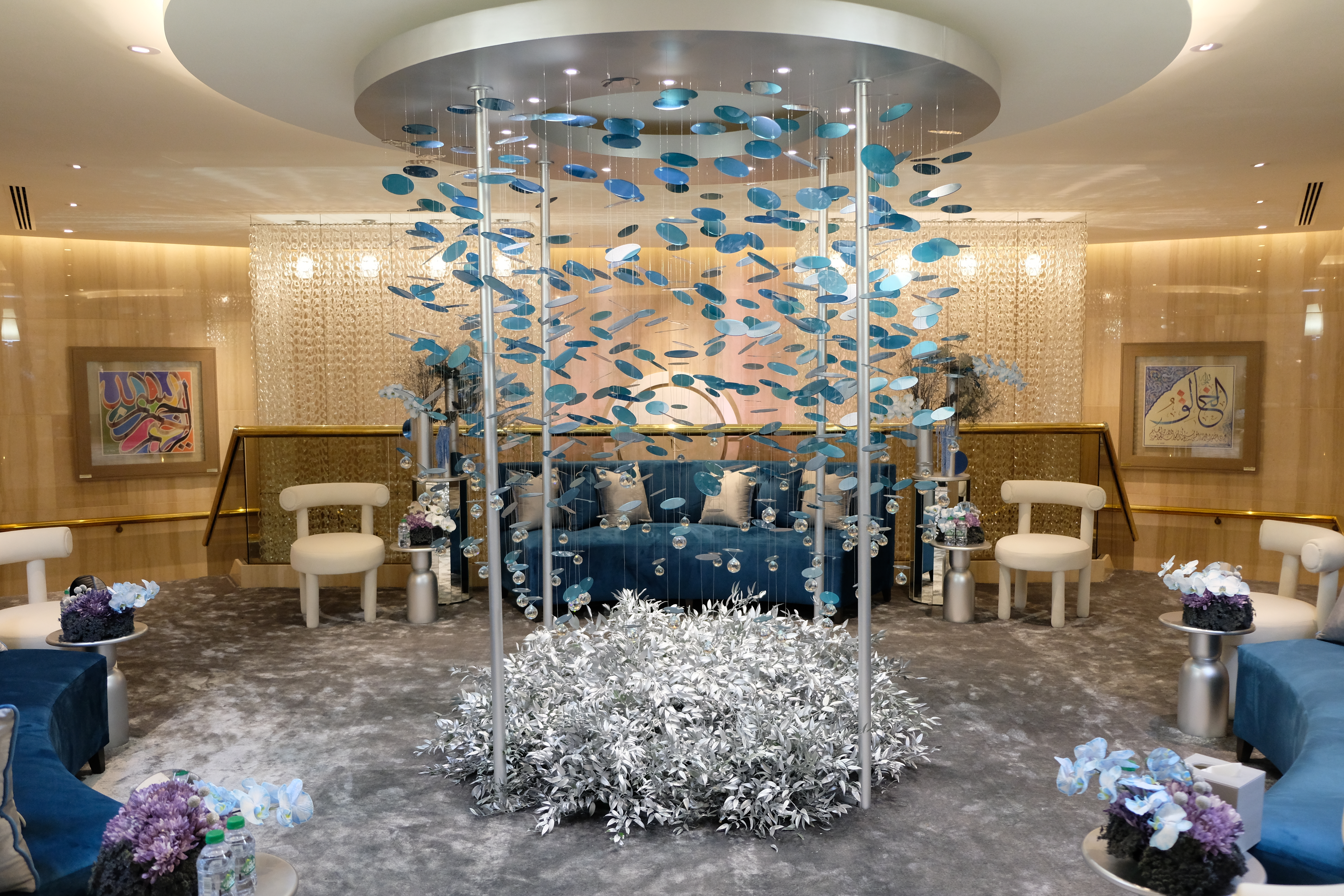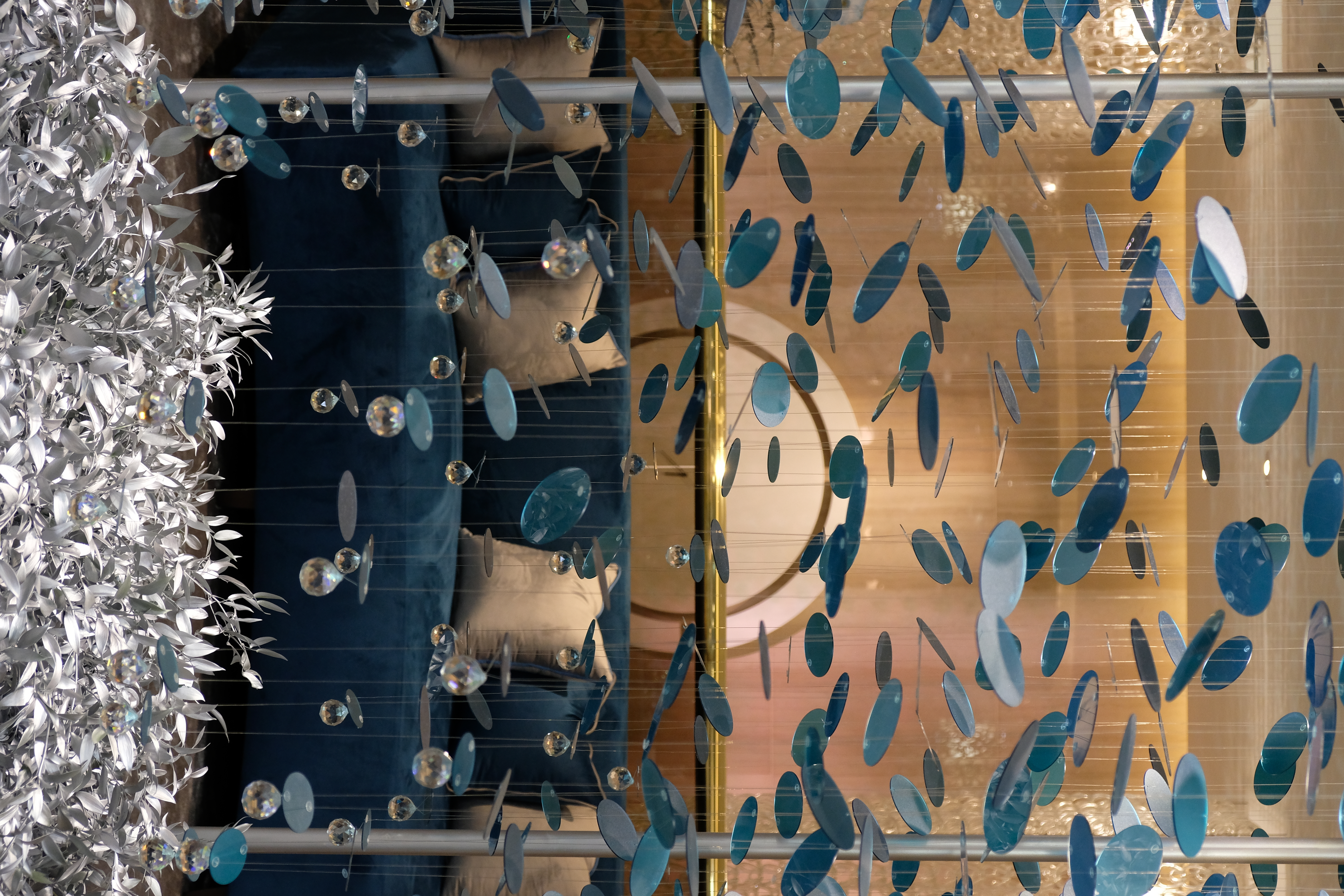 Light is an integral player in this composition. Spherical lamps glow like distant moons, casting luminescent reflections onto metallic panels, amplifying the drama. The space shimmers, shifts, and transforms—a living installation where reflections shape the experience.