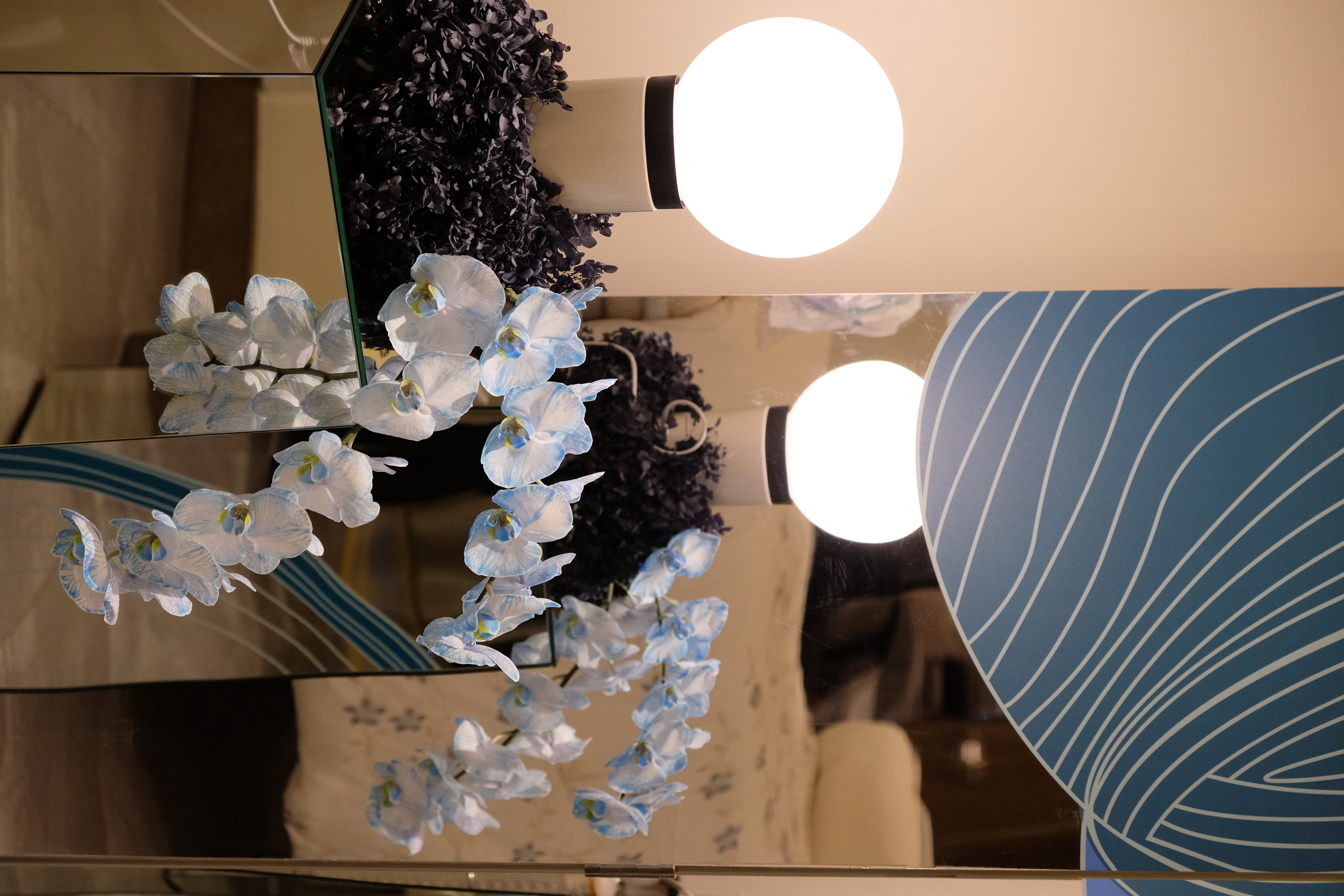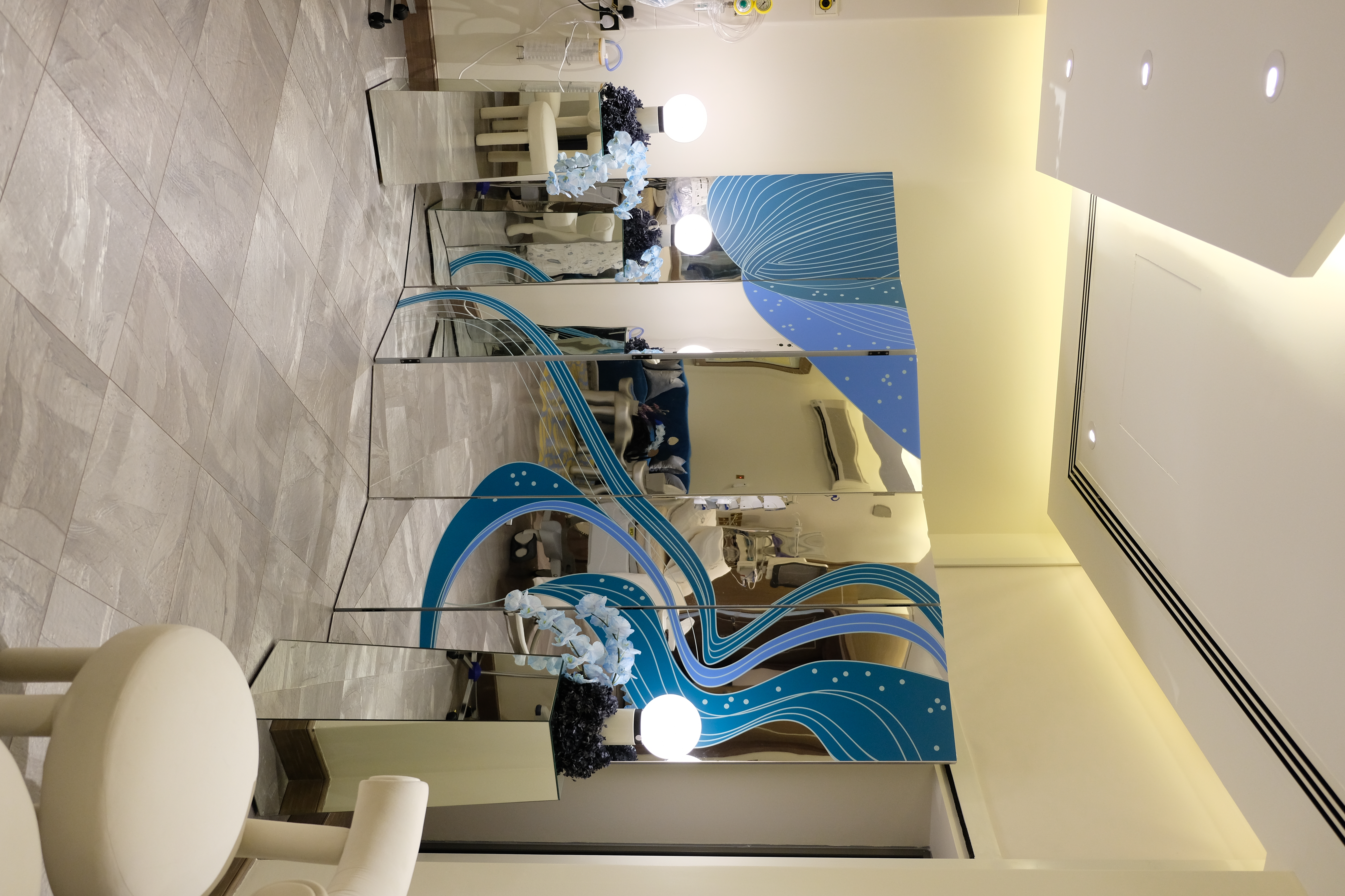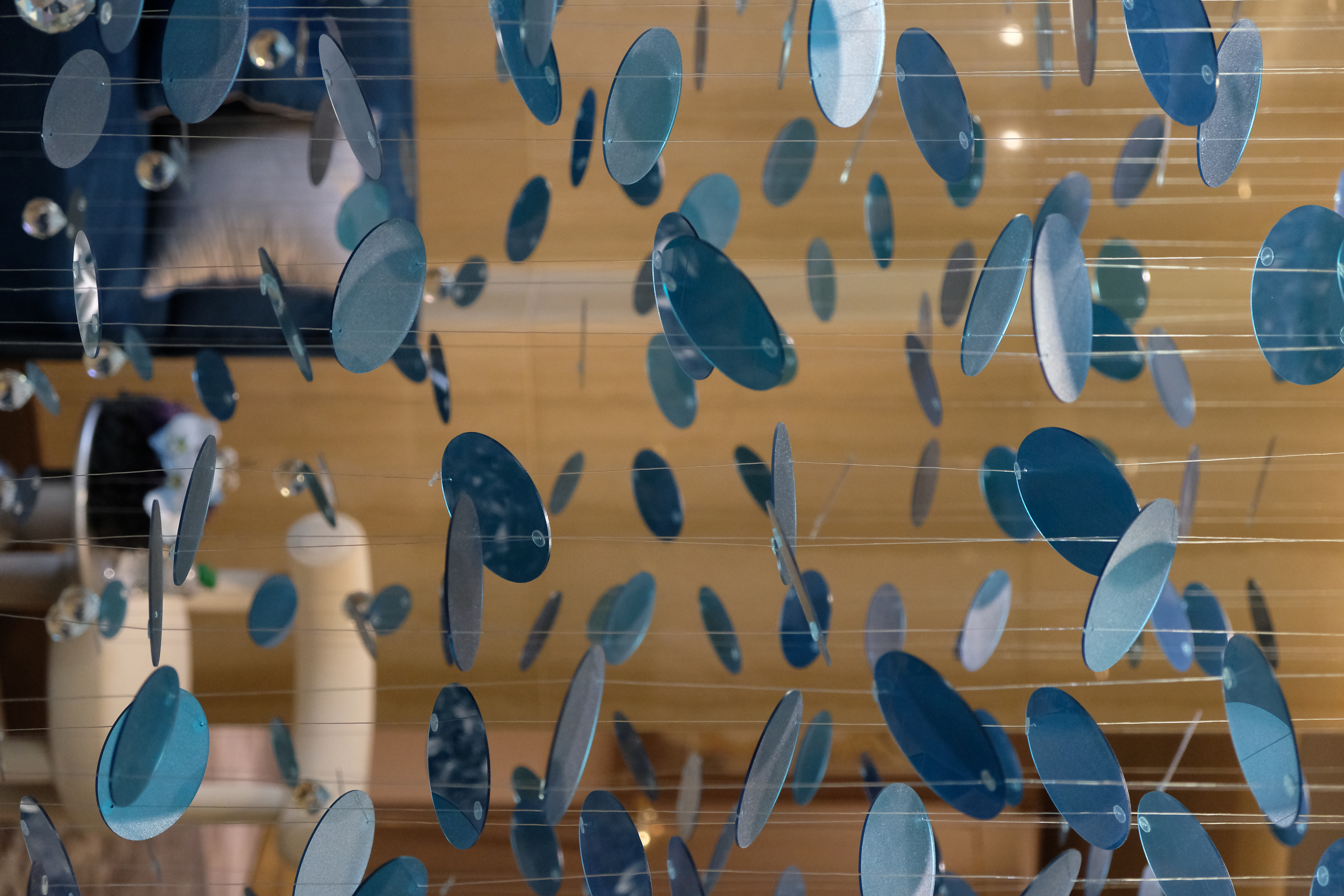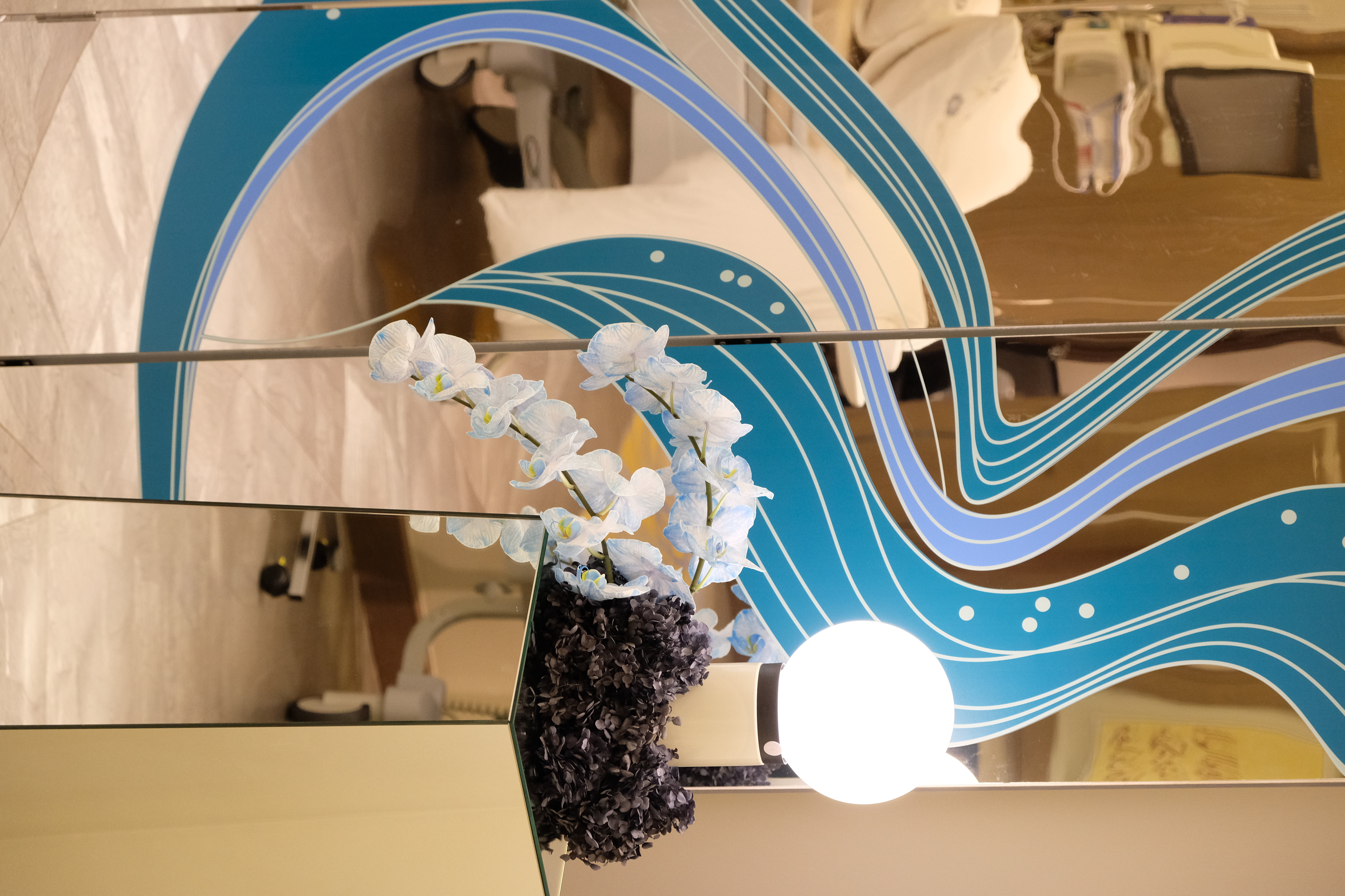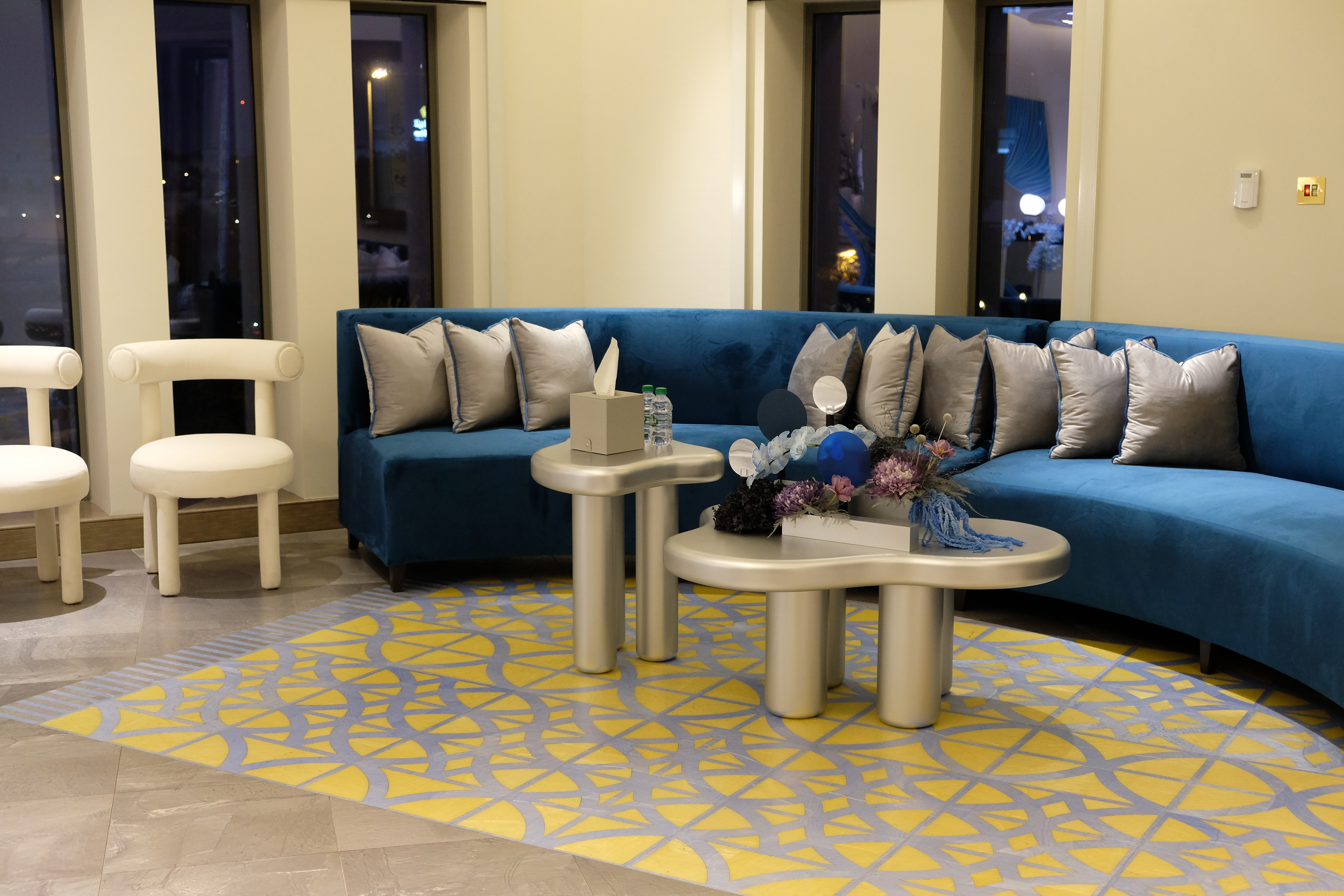 Light is an integral player in this composition. Spherical lamps glow like distant moons, casting luminescent reflections onto metallic panels, amplifying the drama. The space shimmers, shifts, and transforms—a living installation where reflections shape the experience.