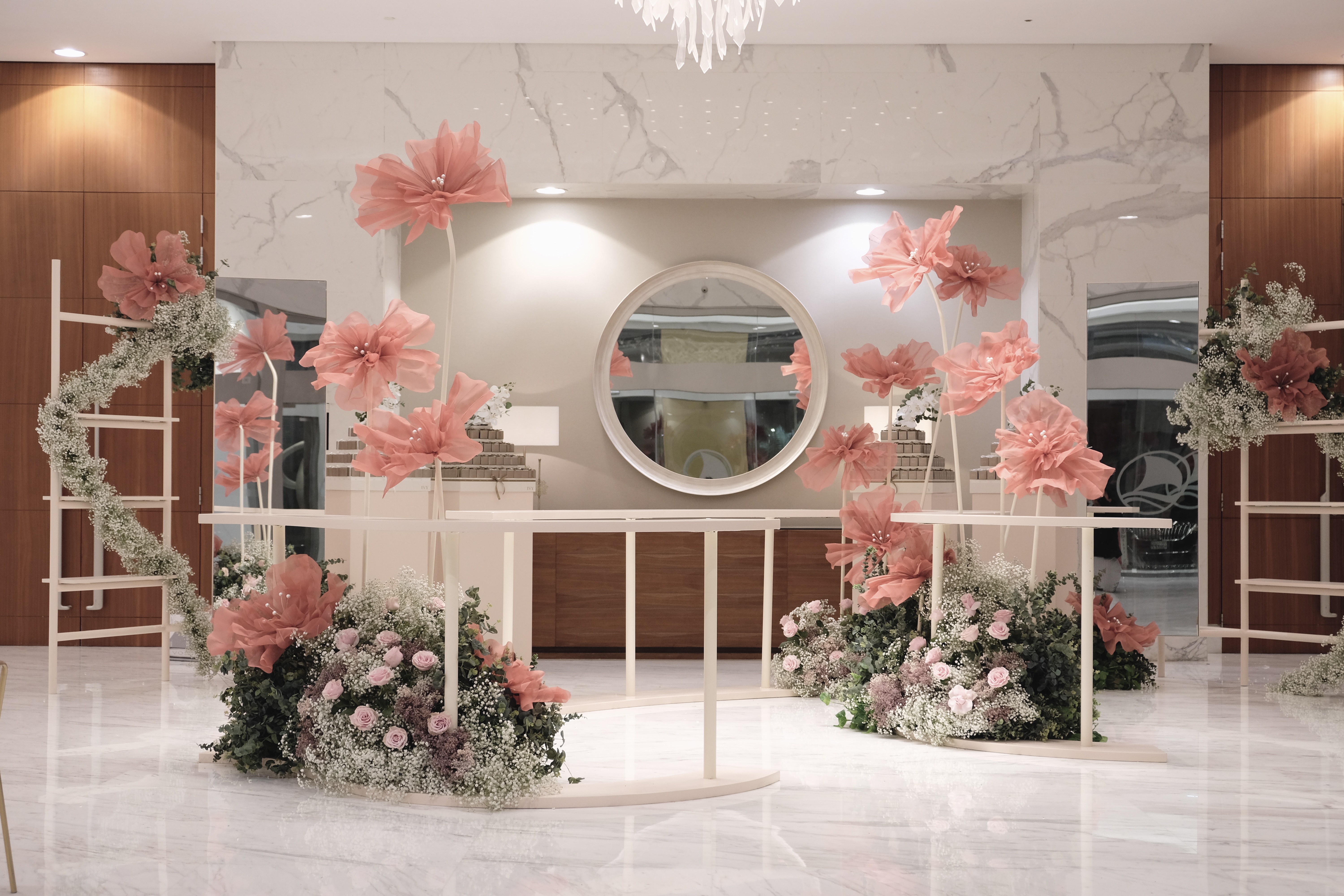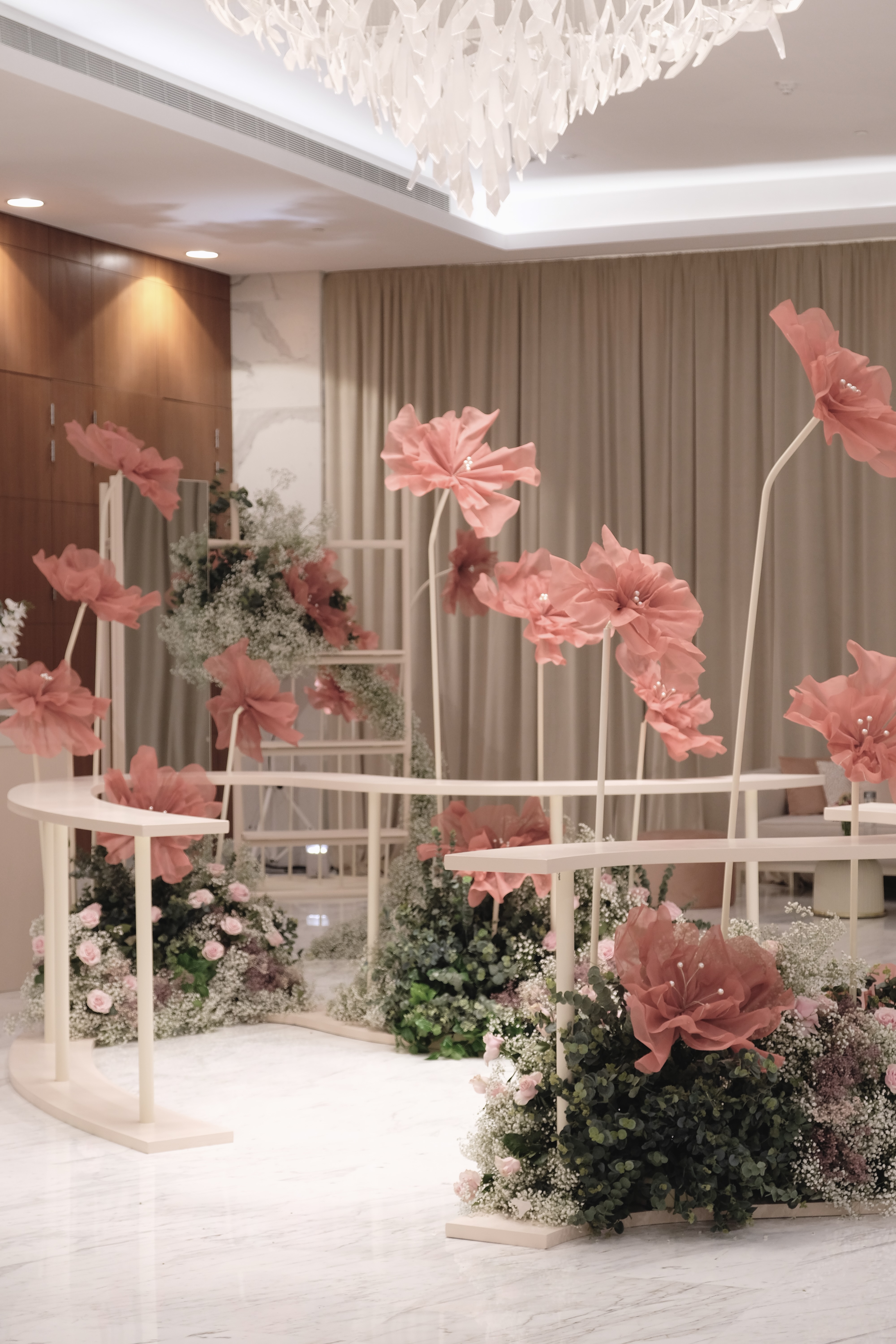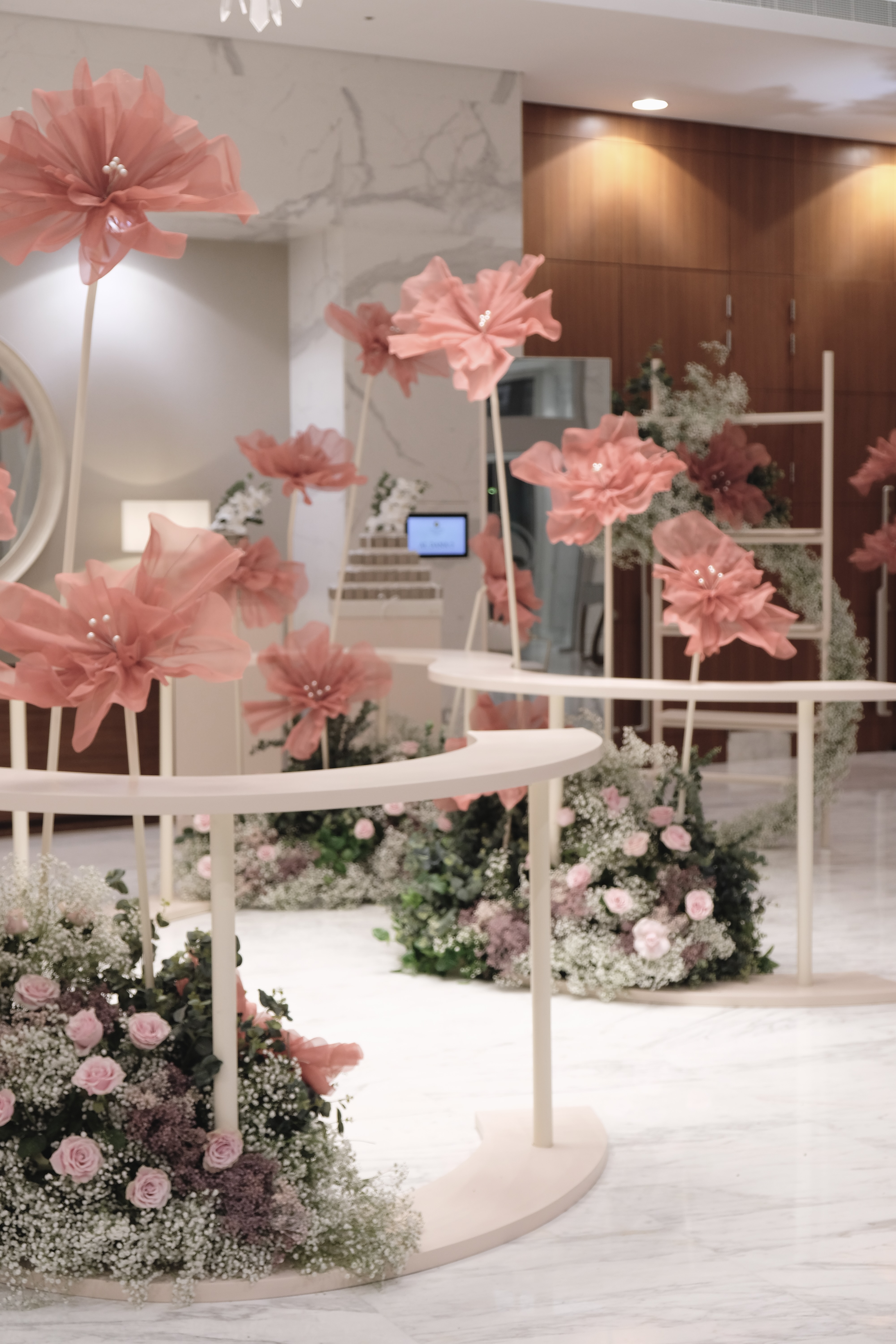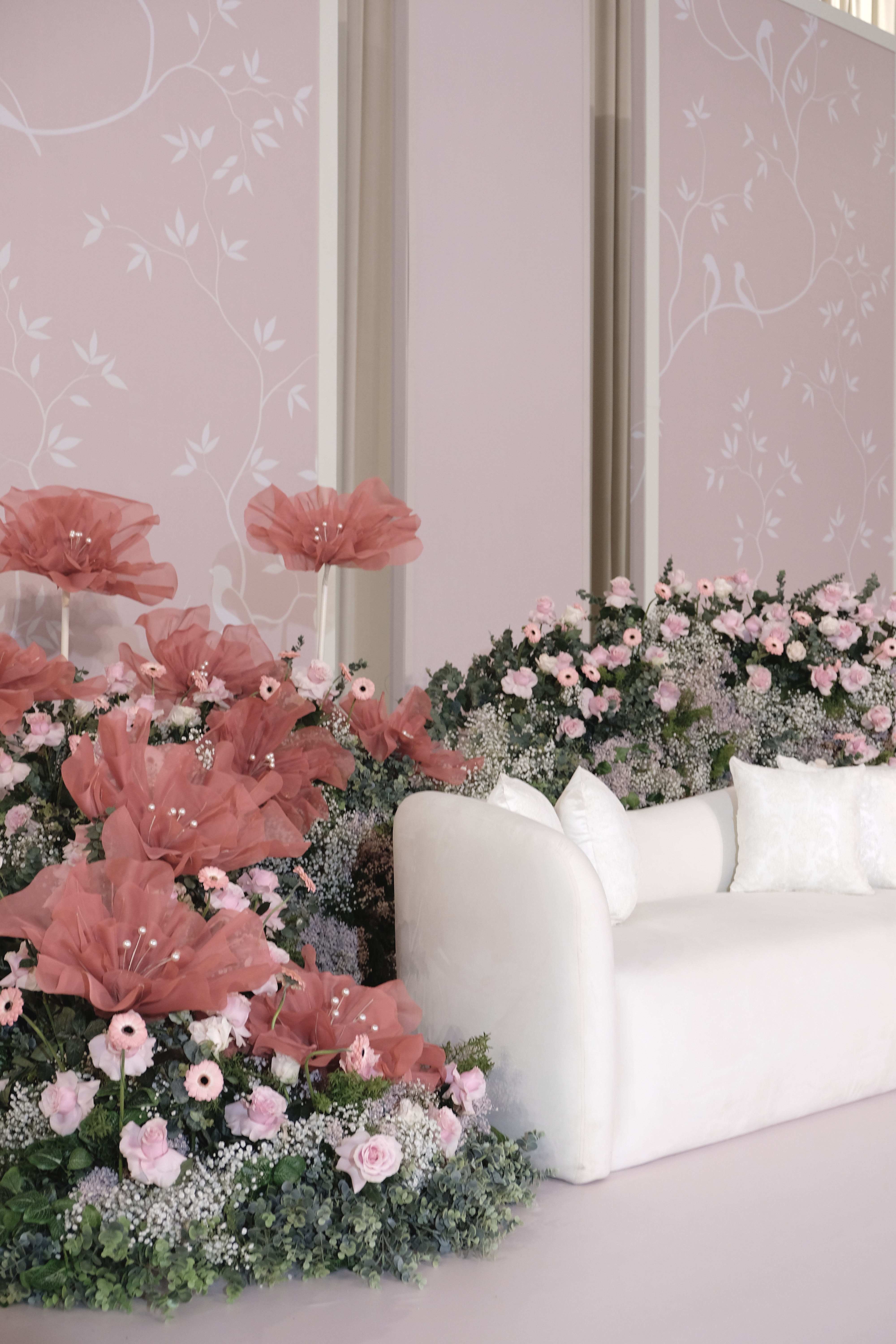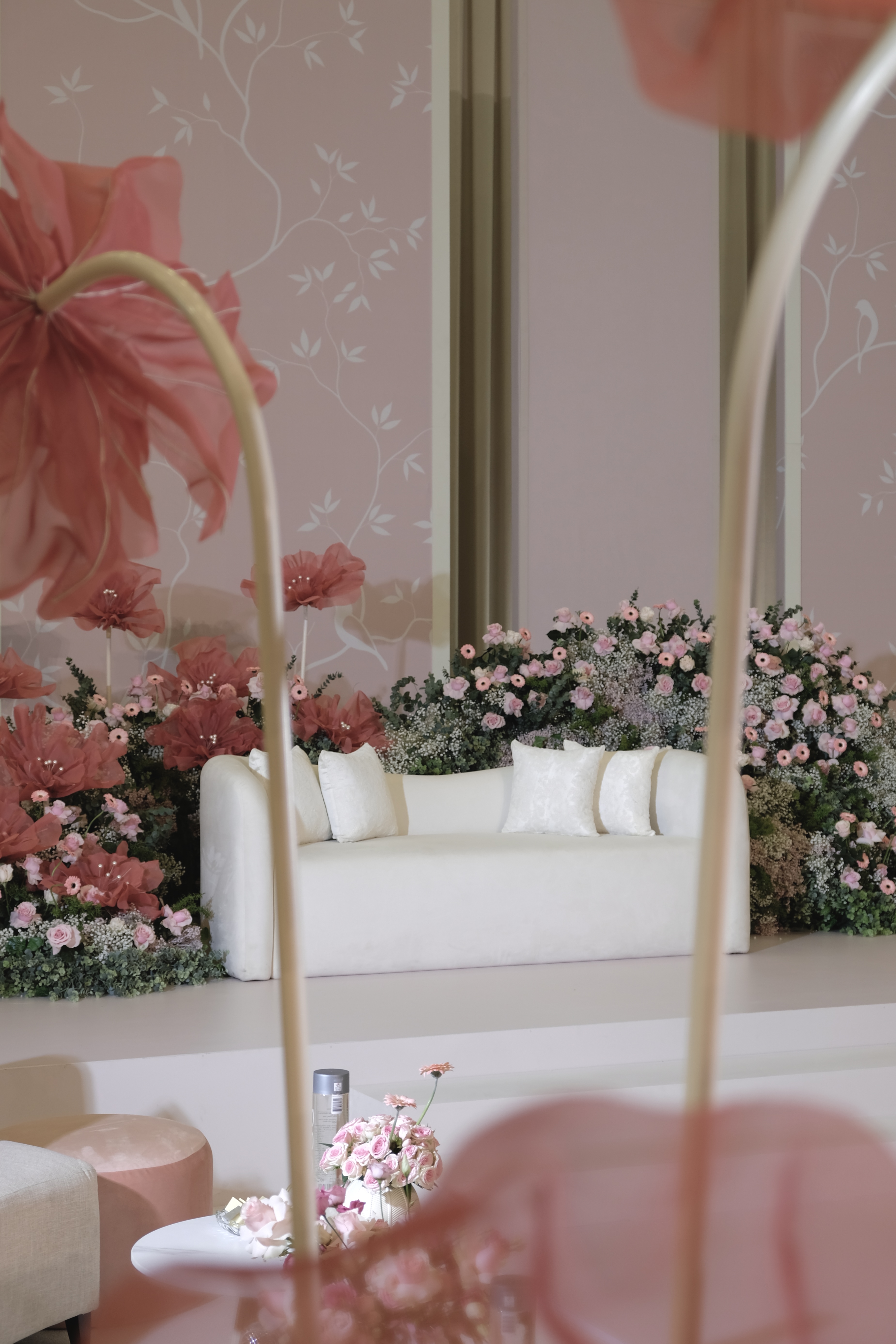 This design speaks in soft coral hues and fluid motion, where every curve and bloom carries an unspoken emotion. A space where lightness meets depth, creating an atmosphere that feels both tender and powerful.