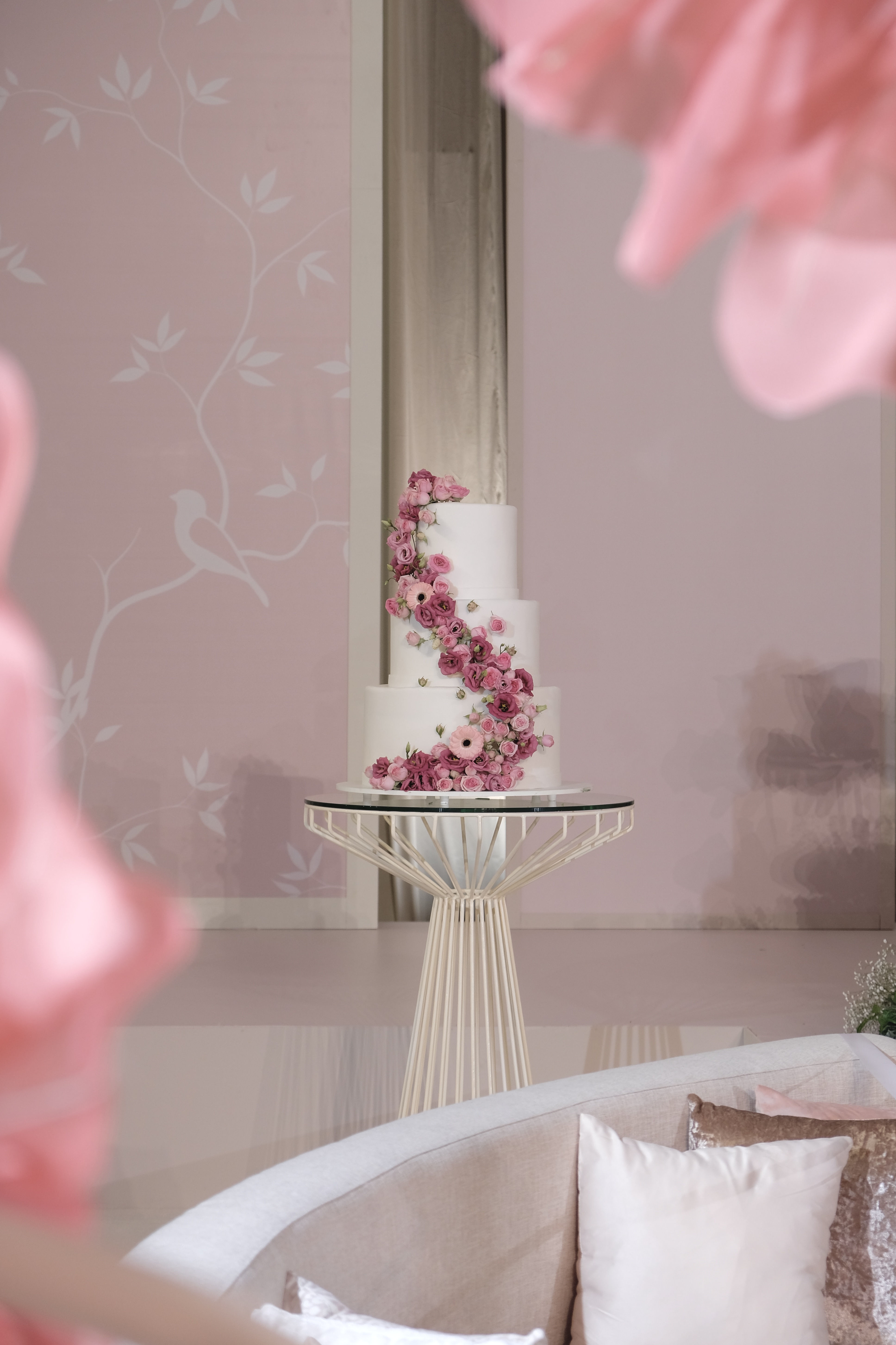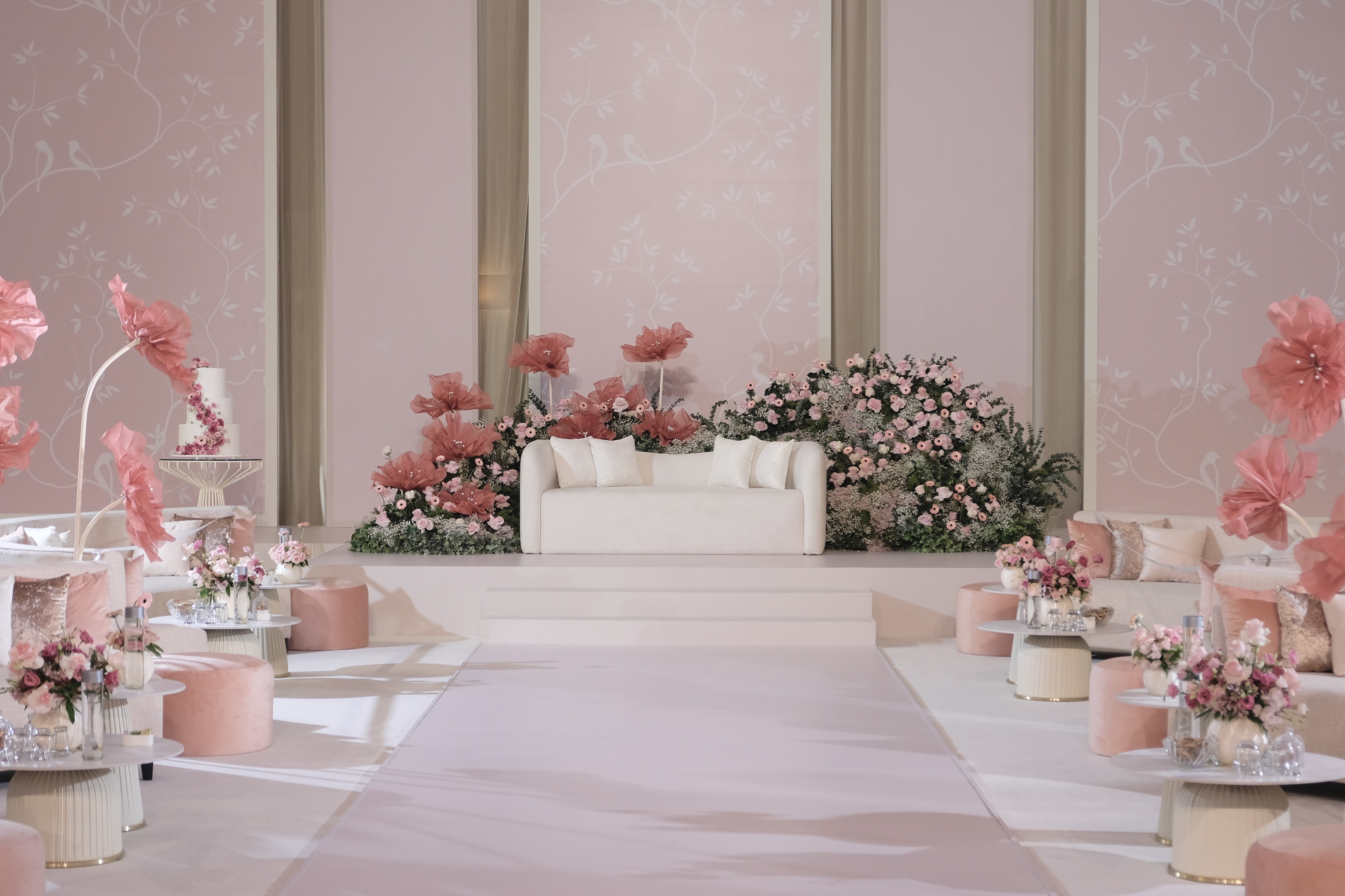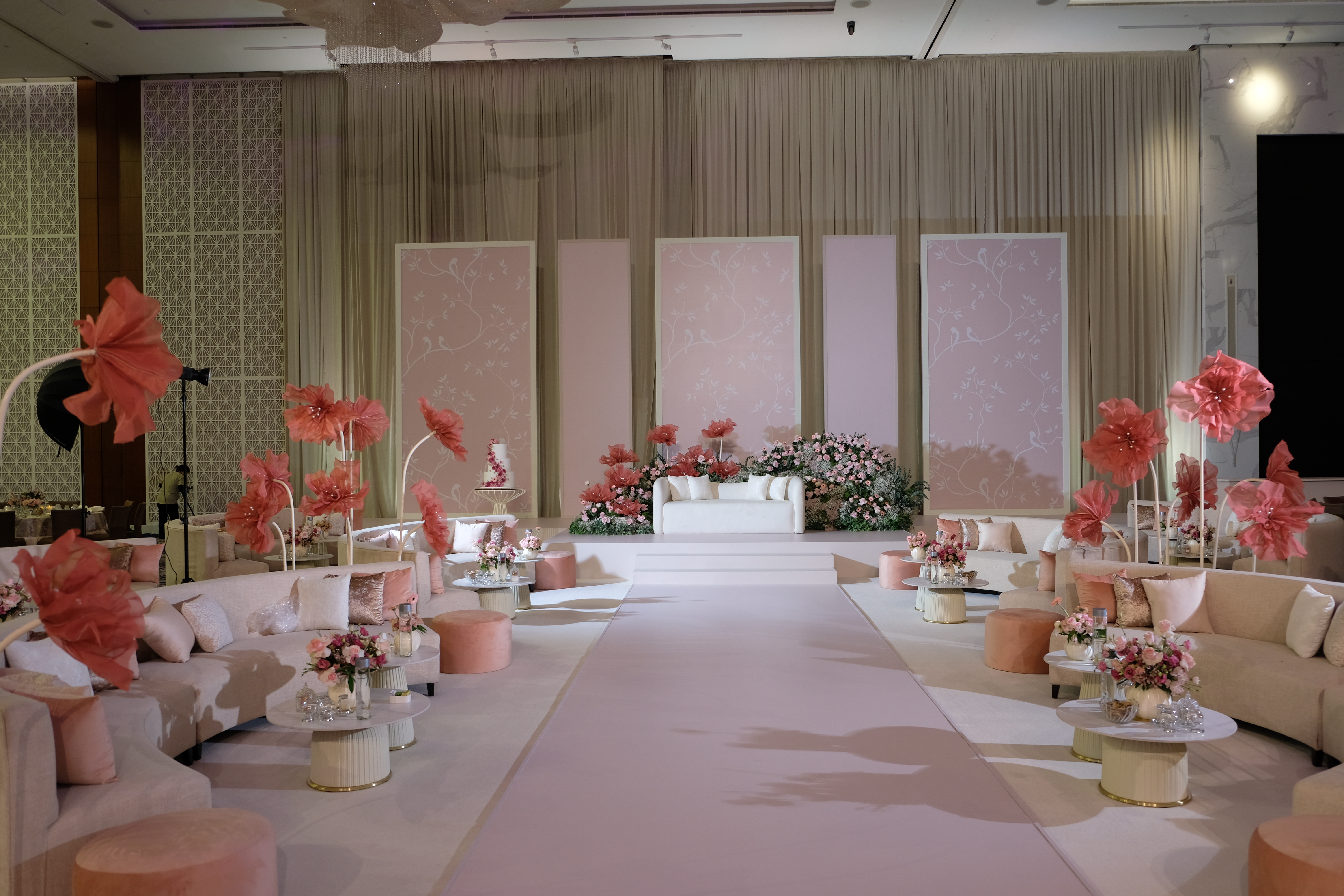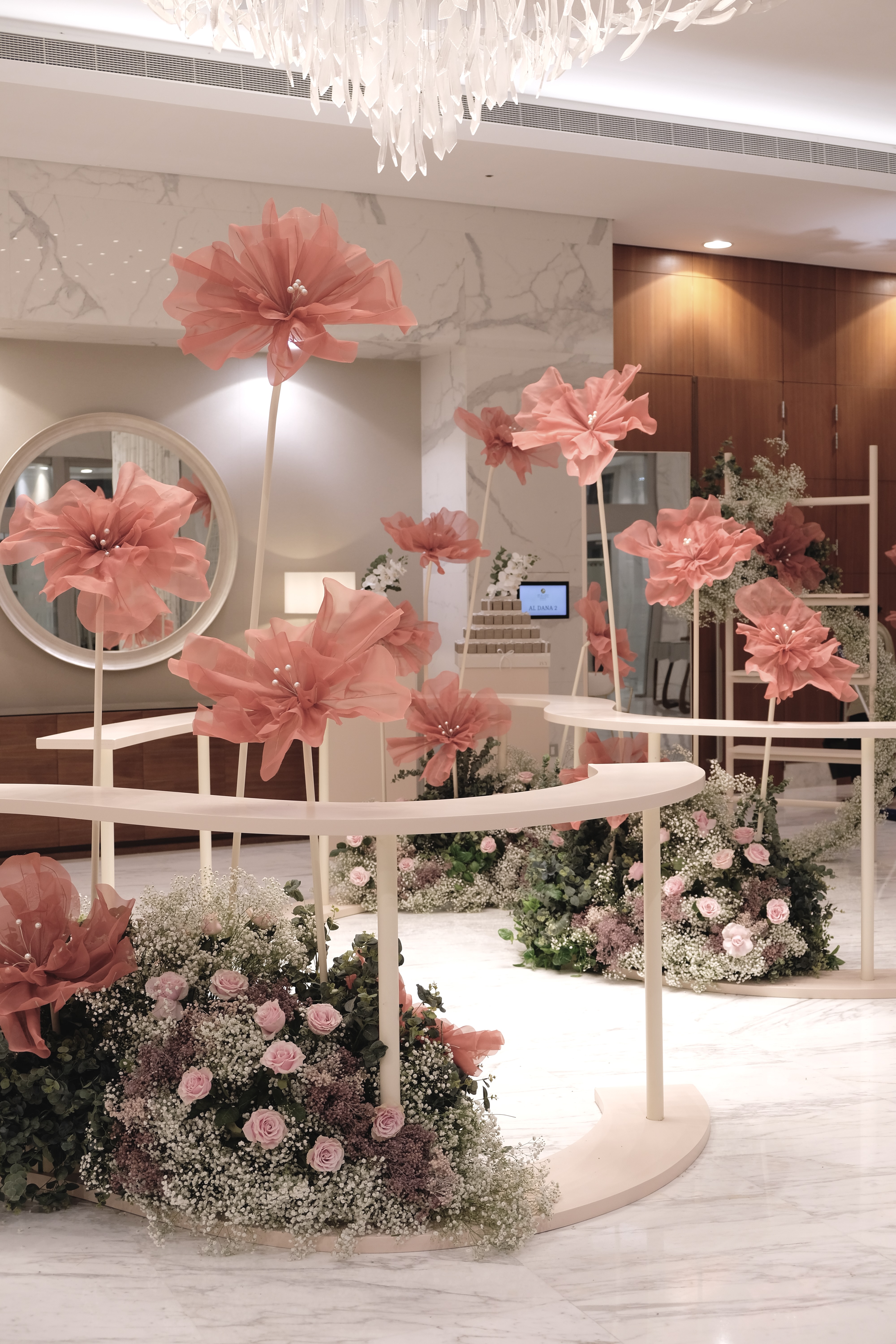 A poetic celebration of Chinoiserie elegance and airy romance, where swirling coral-hued florals, delicate textures, and fluid architectural elements create a sense of movement and lightness. Every detail is designed to feel soft, graceful, and immersive, blending organic floral compositions with structured curves to craft a setting that is both timeless and ethereal. The interplay of peachy tones, layered blooms, and whimsical accents evokes a dreamlike ambiance, transforming the space into a delicate balance of artistry and nature.