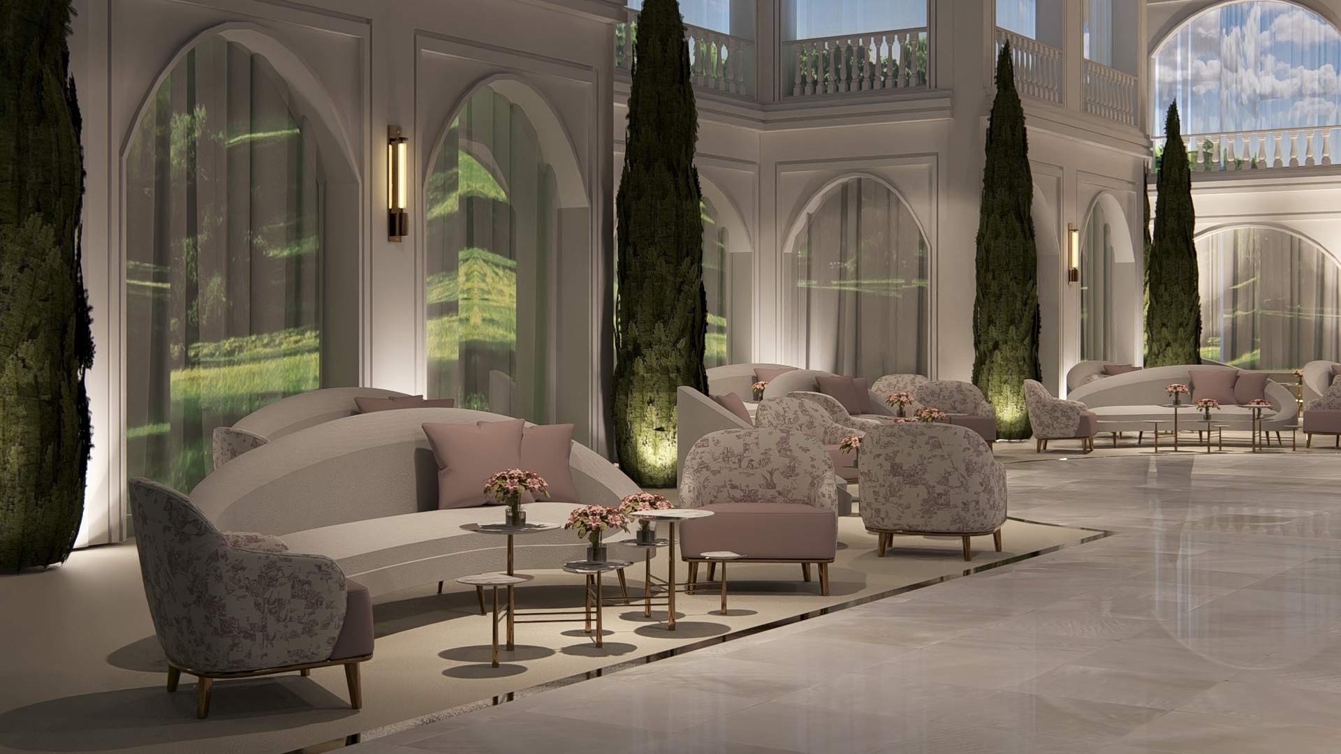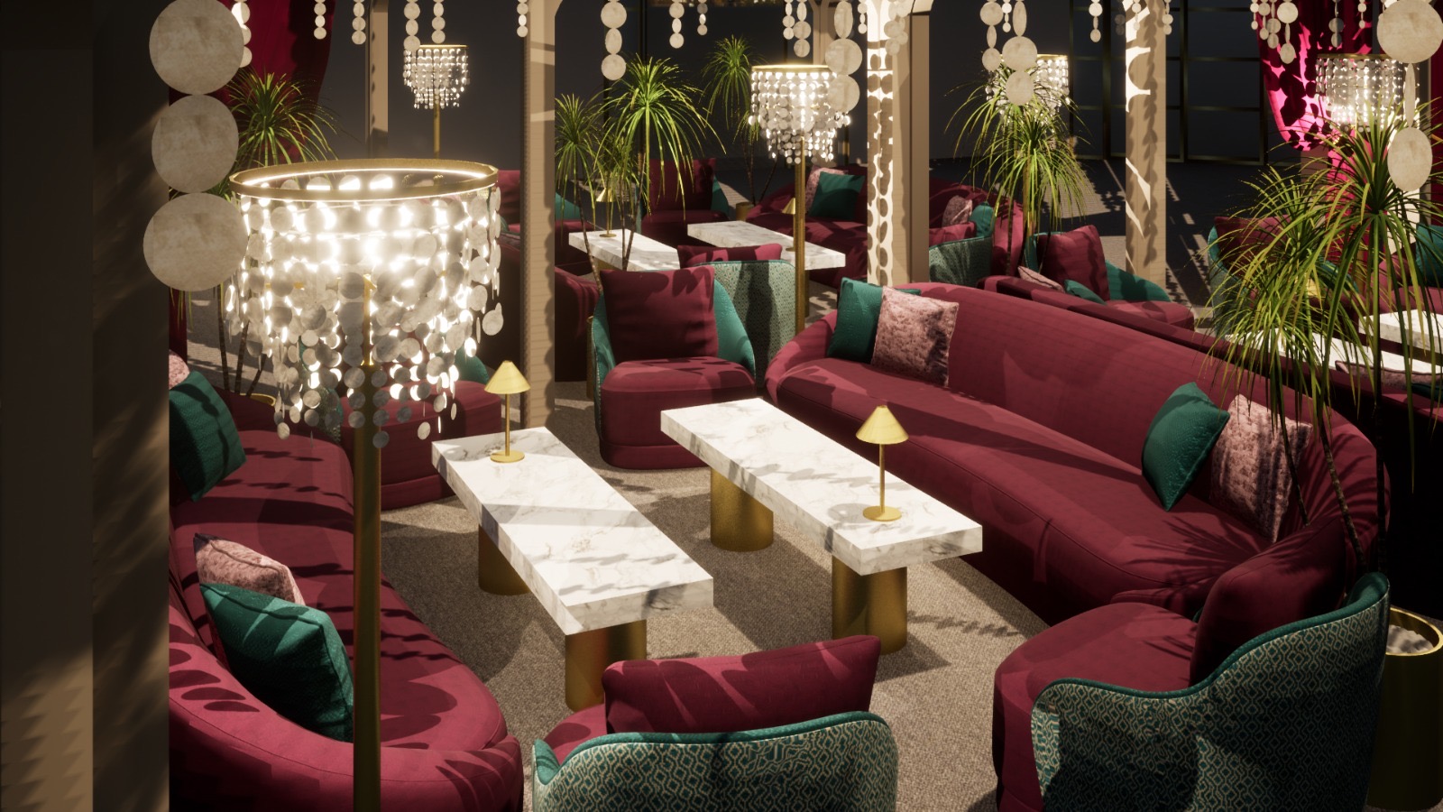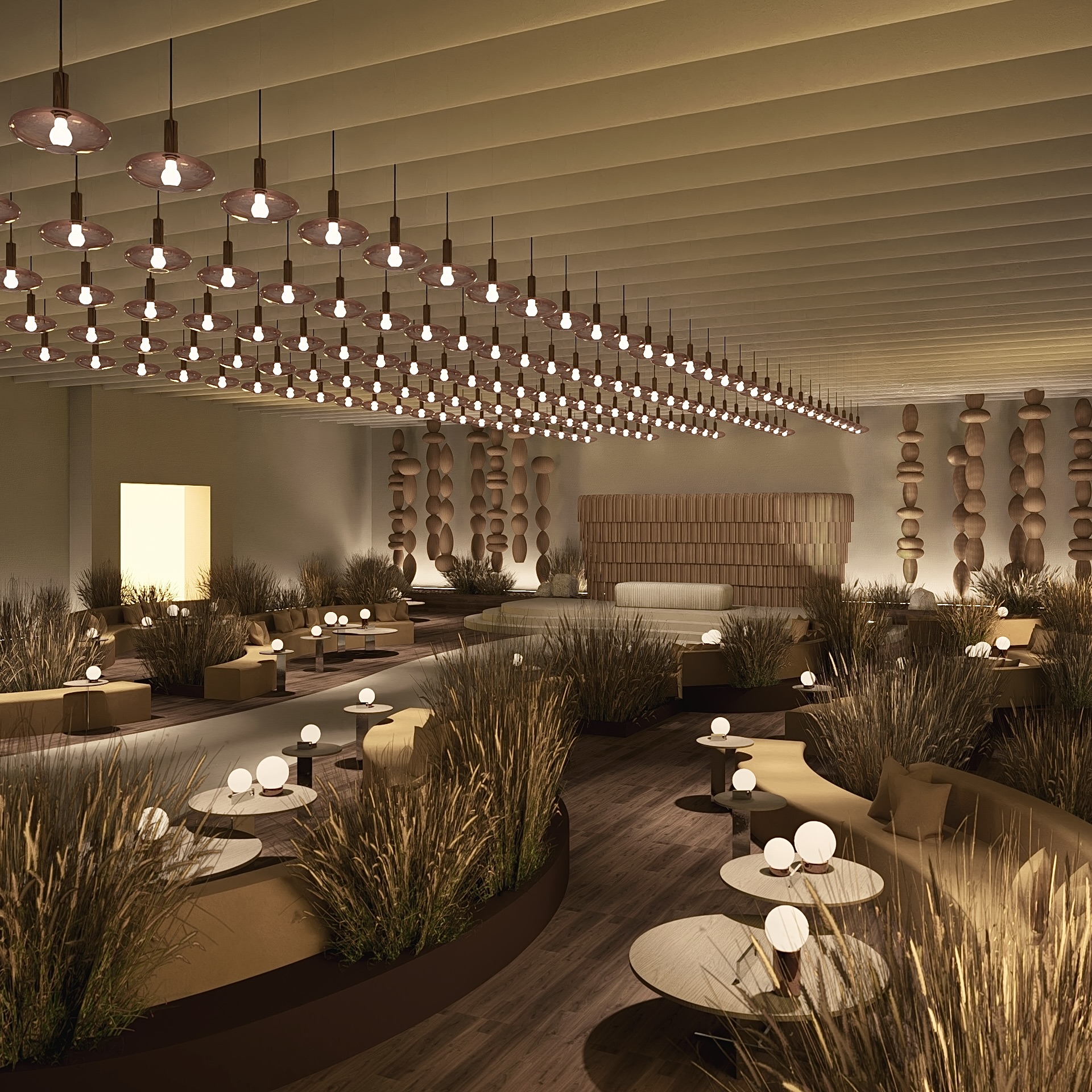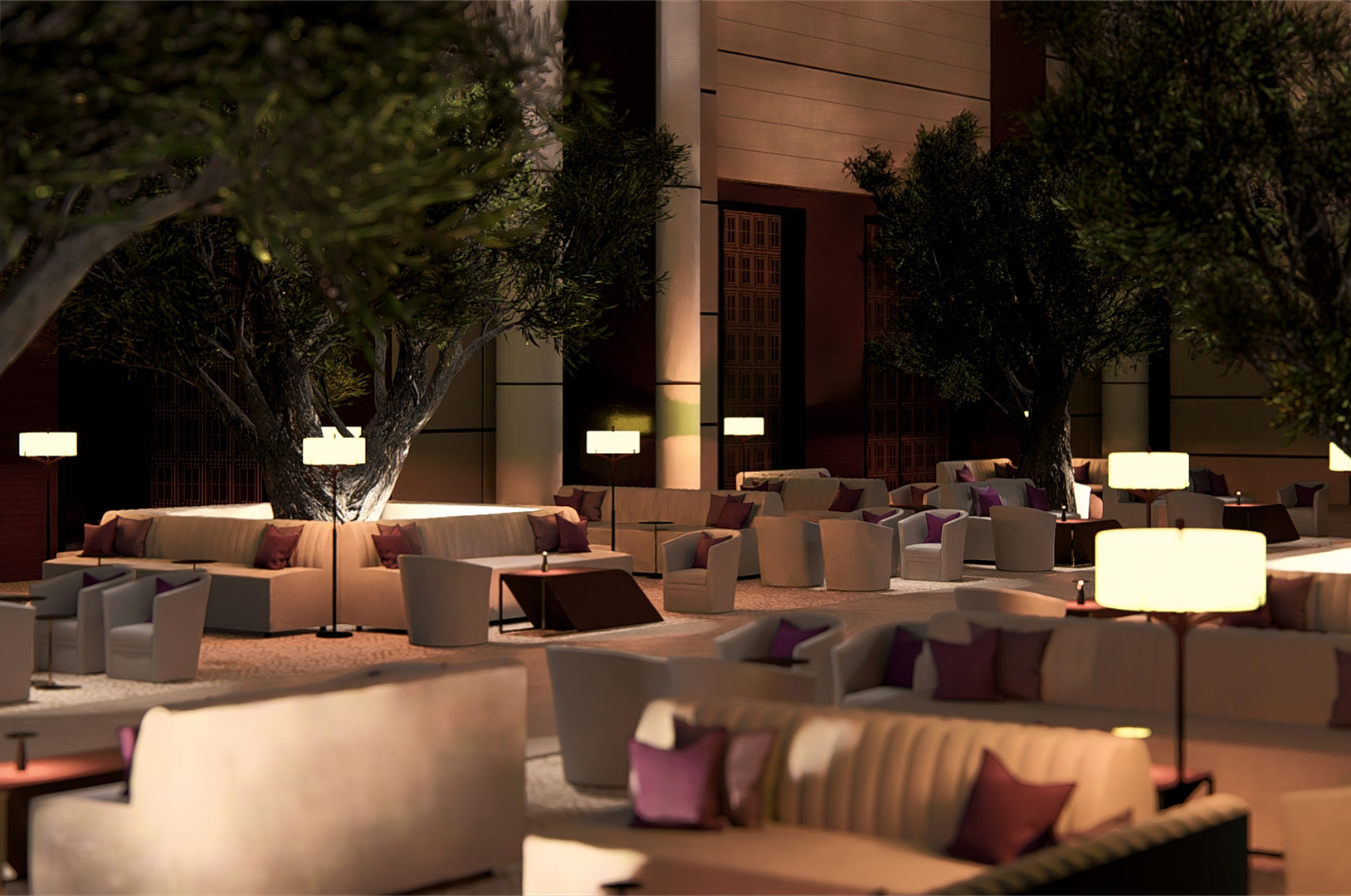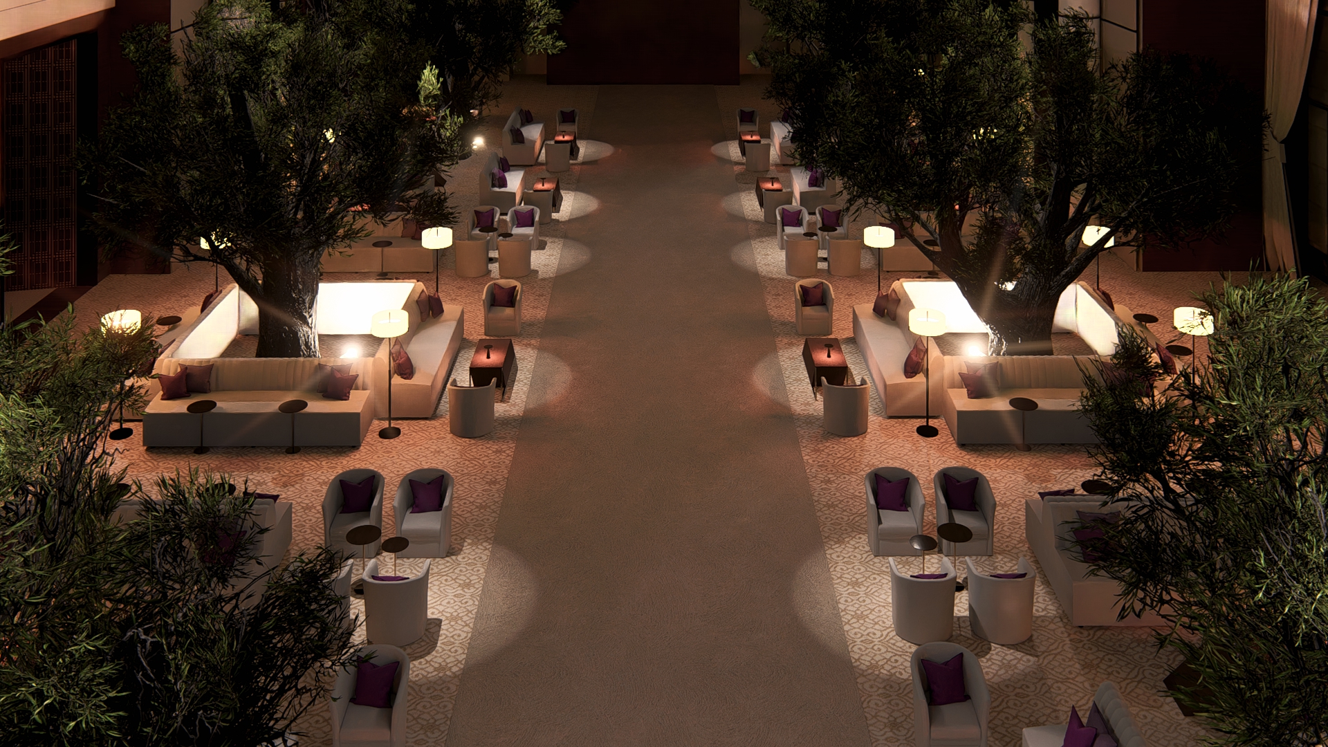 The Pearl Island, Bahrain. The Bahrain Pearl is one of the most prominent prides of the island and will now serve as the feature for the elegance. A capiz installation will serve as a representation of the pearlescent appearance of the Bahrain pride. This interior is composed of a special color palette that creates a luxurious atmosphere, combining teal and magenta.