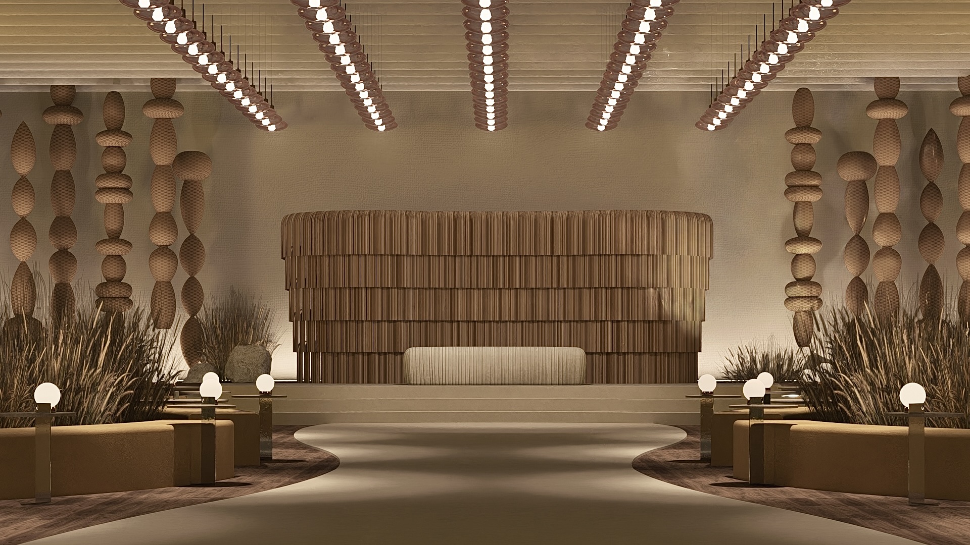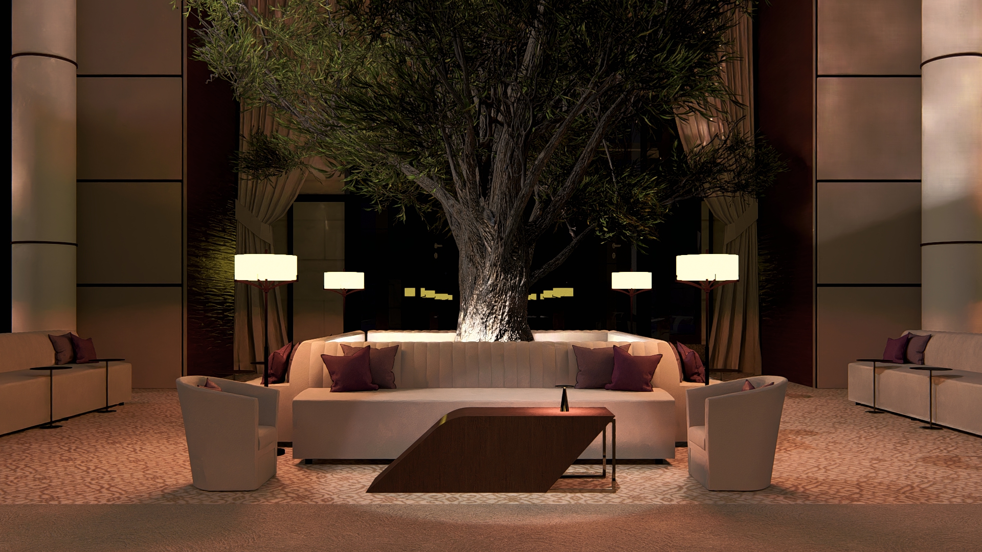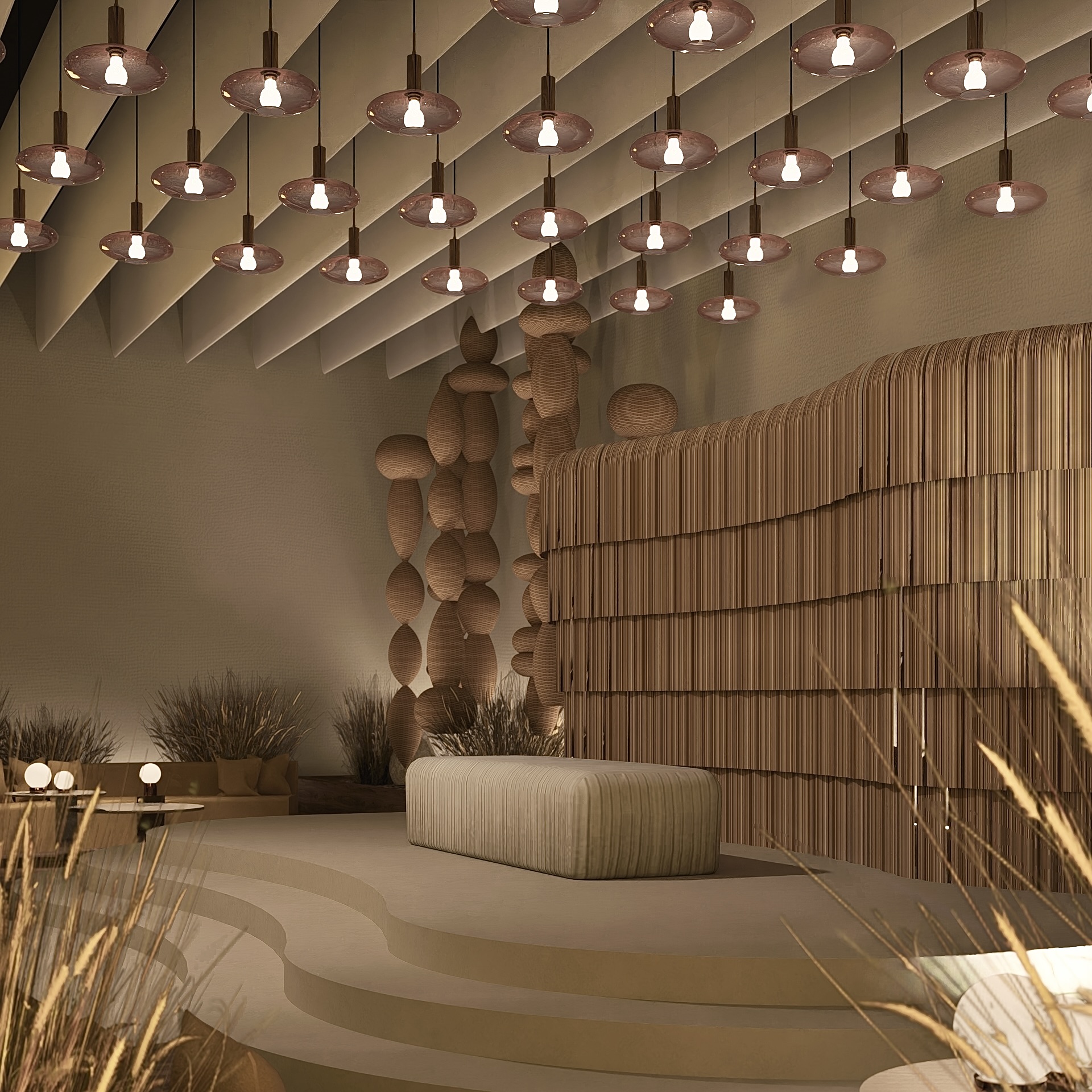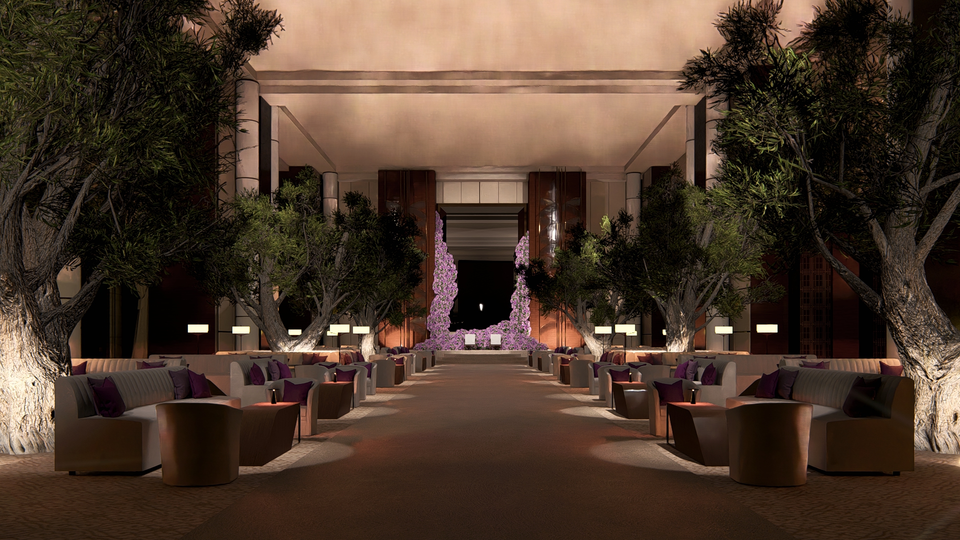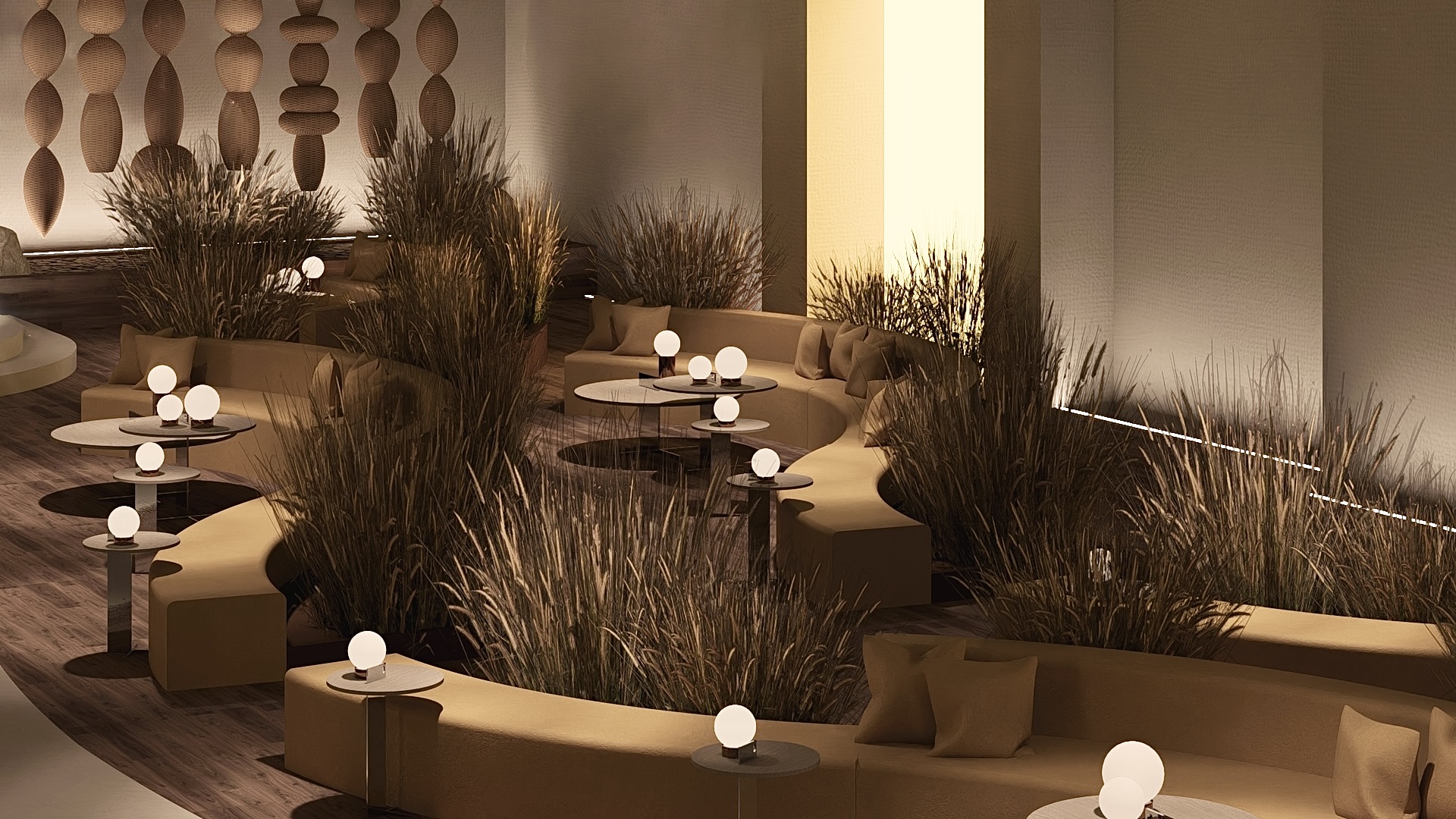 The Pearl Island, Bahrain. The Bahrain Pearl is one of the most prominent prides of the island and will now serve as the feature for the elegance. A capiz installation will serve as a representation of the pearlescent appearance of the Bahrain pride. This interior is composed of a special color palette that creates a luxurious atmosphere, combining teal and magenta.
