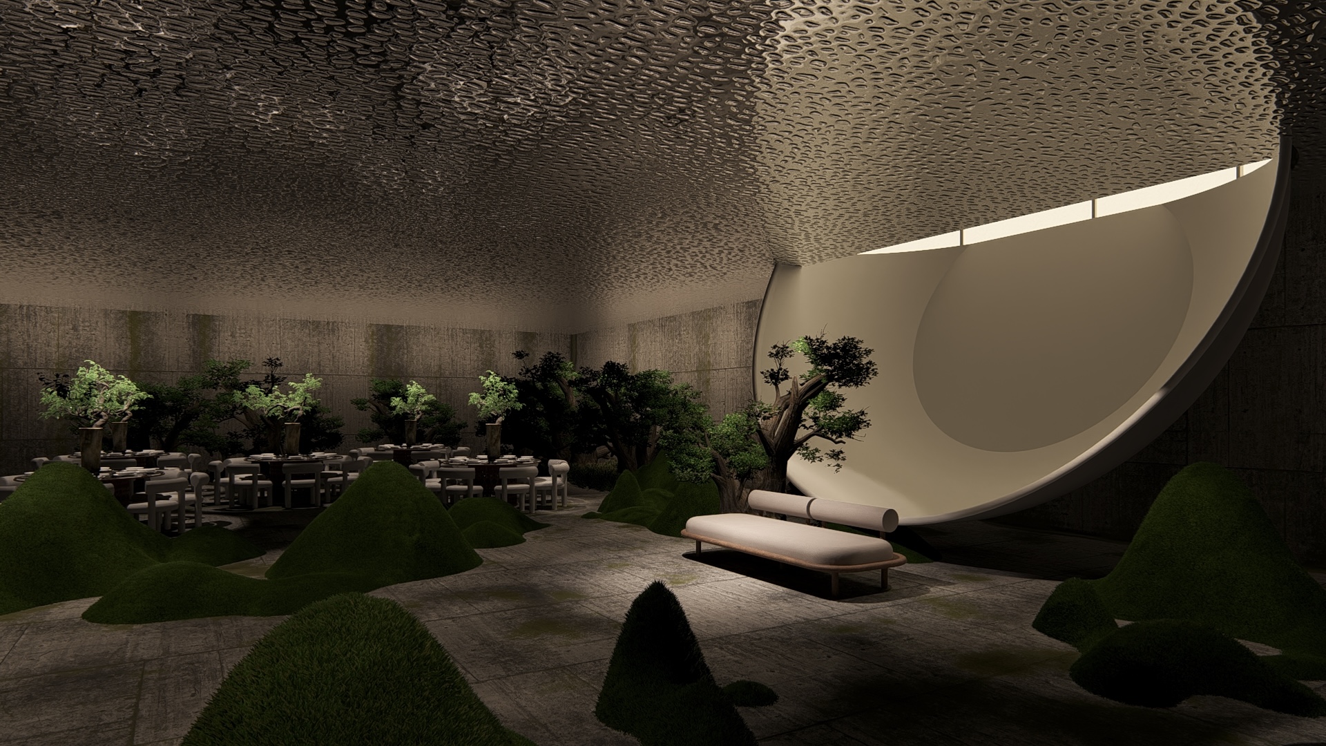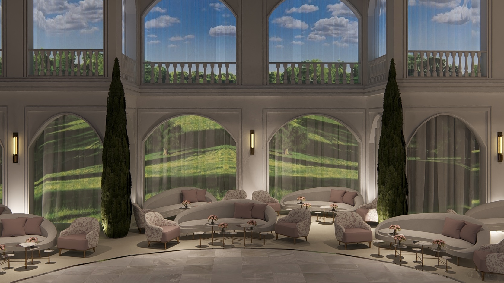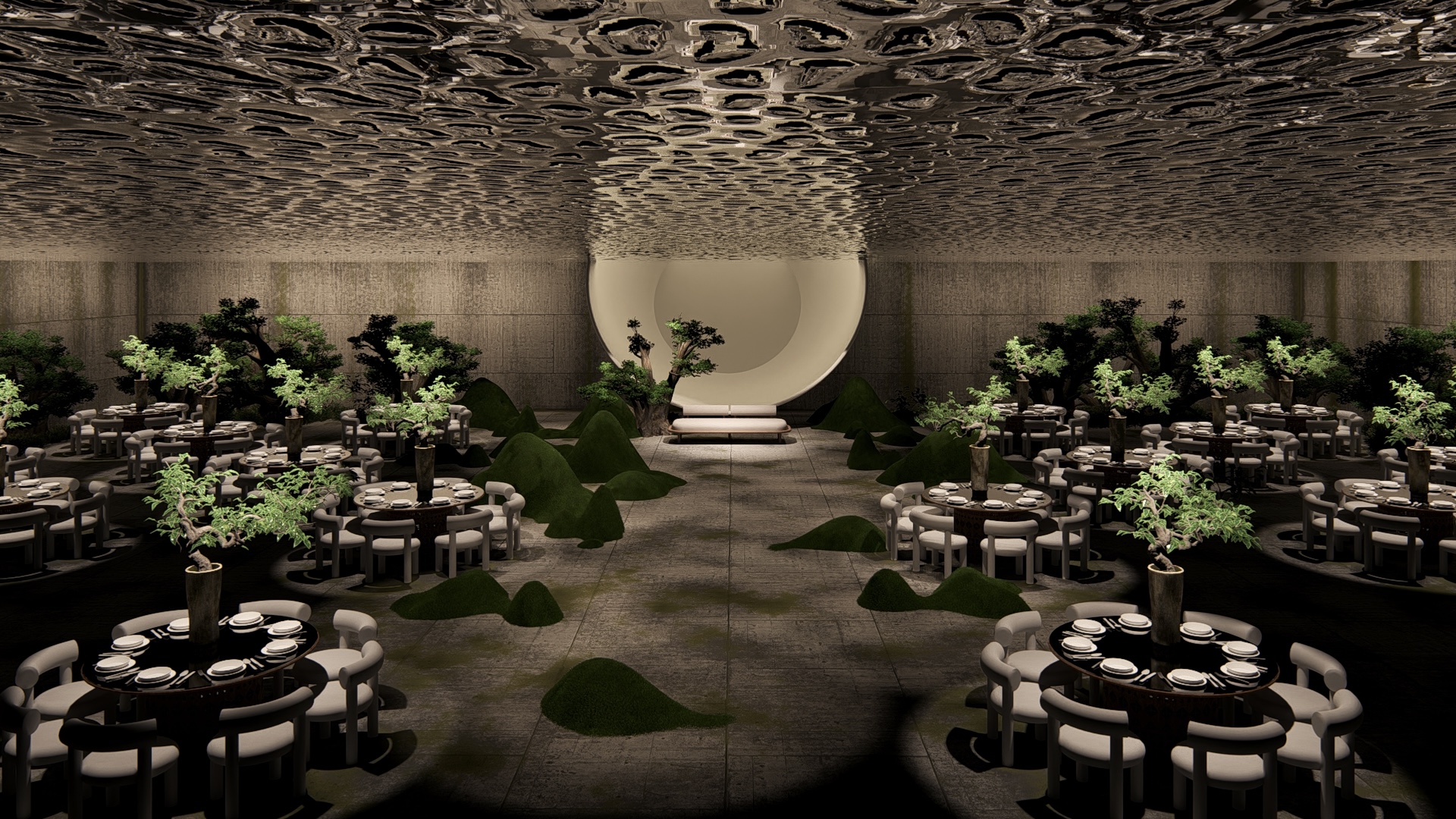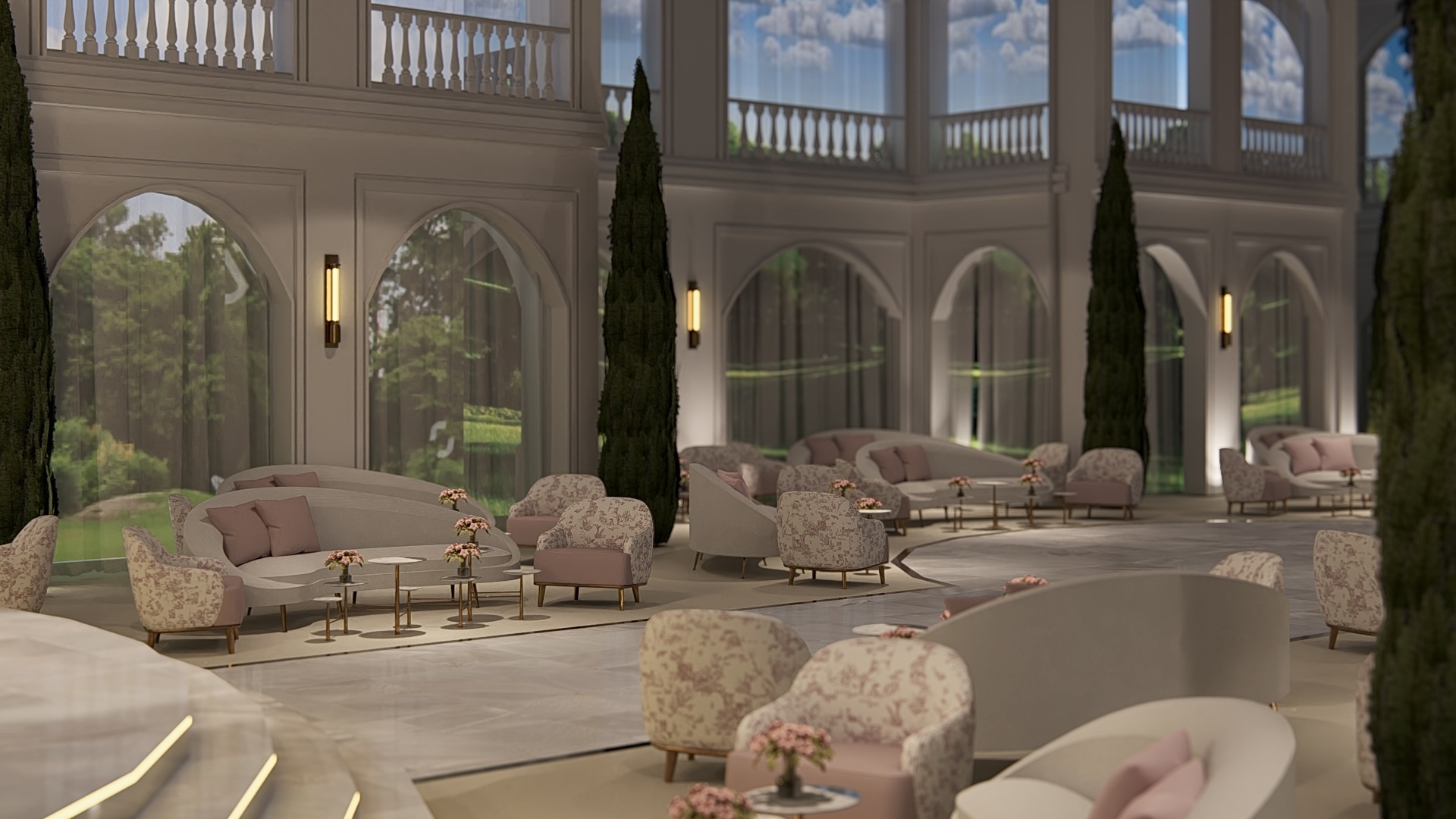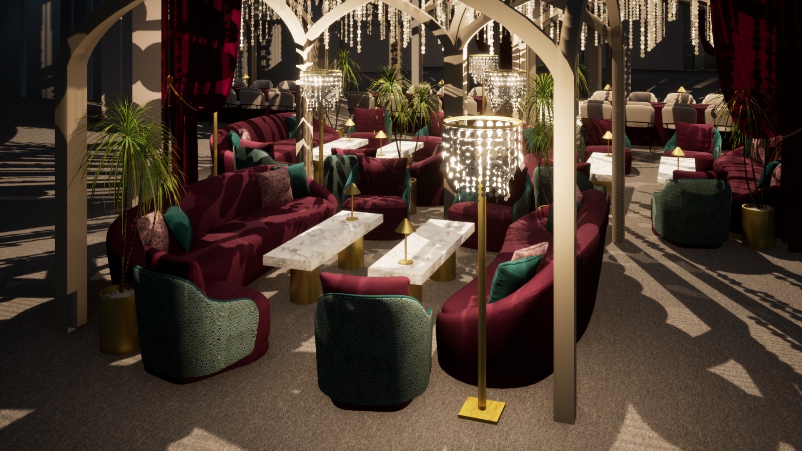 The Pearl Island, Bahrain. The Bahrain Pearl is one of the most prominent prides of the island and will now serve as the feature for the elegance. A capiz installation will serve as a representation of the pearlescent appearance of the Bahrain pride. This interior is composed of a special color palette that creates a luxurious atmosphere, combining teal and magenta.
