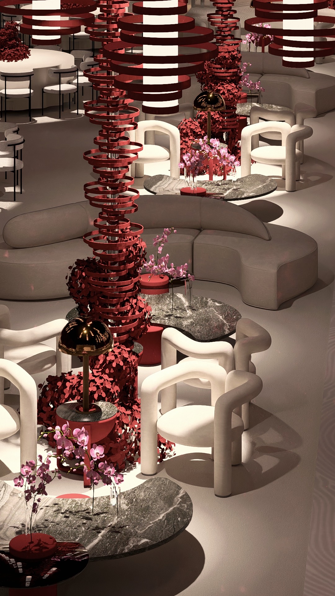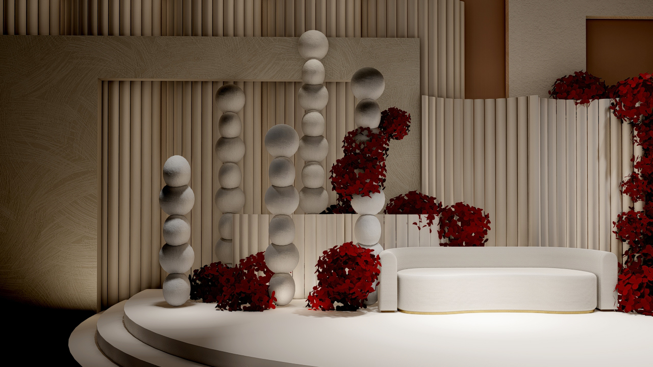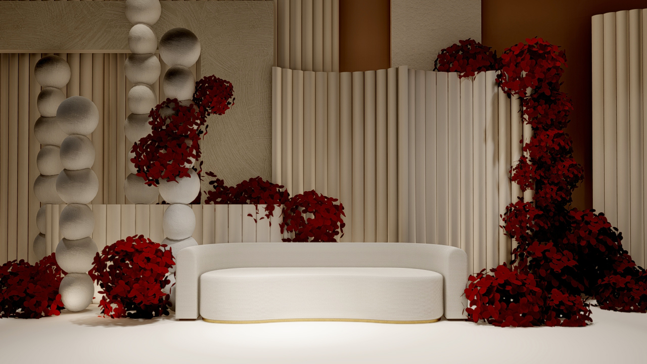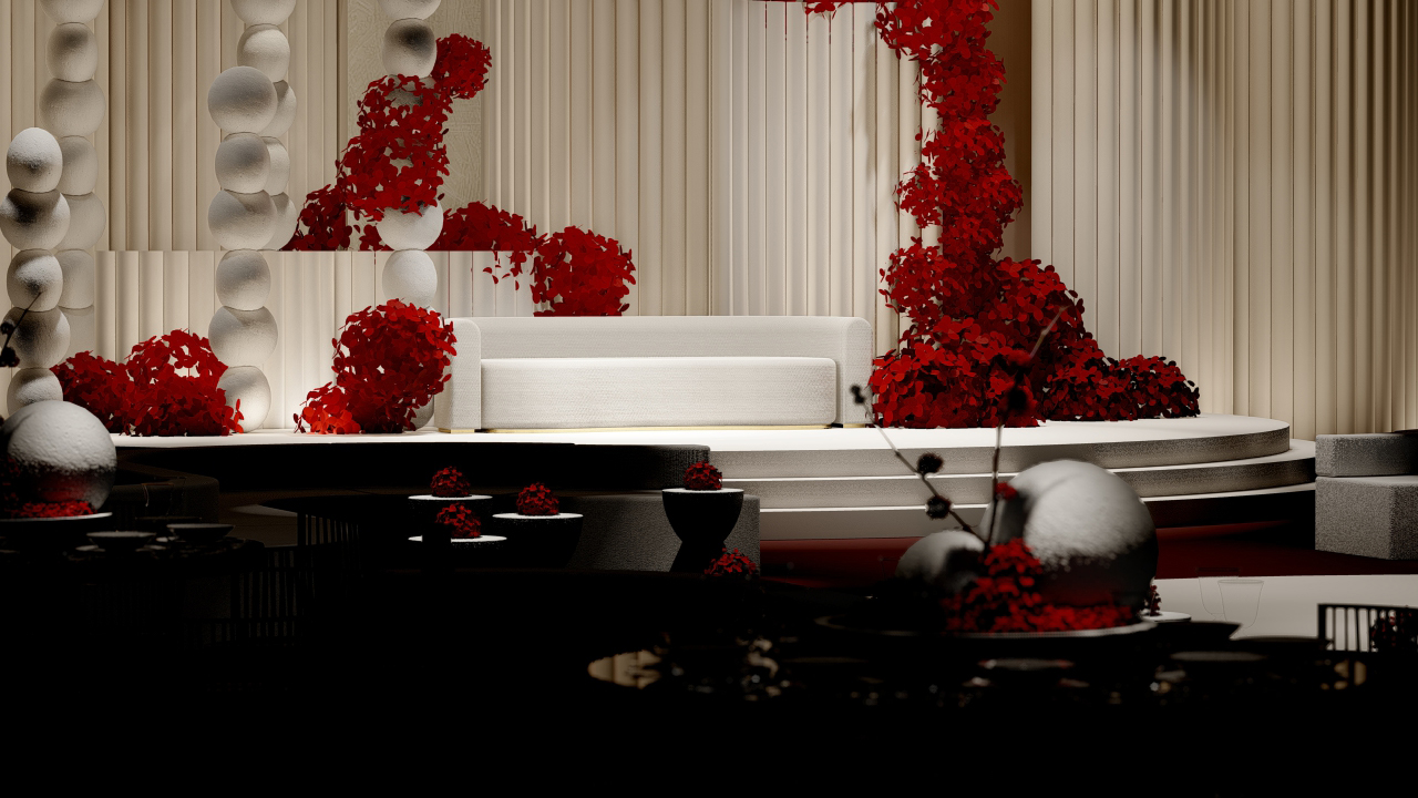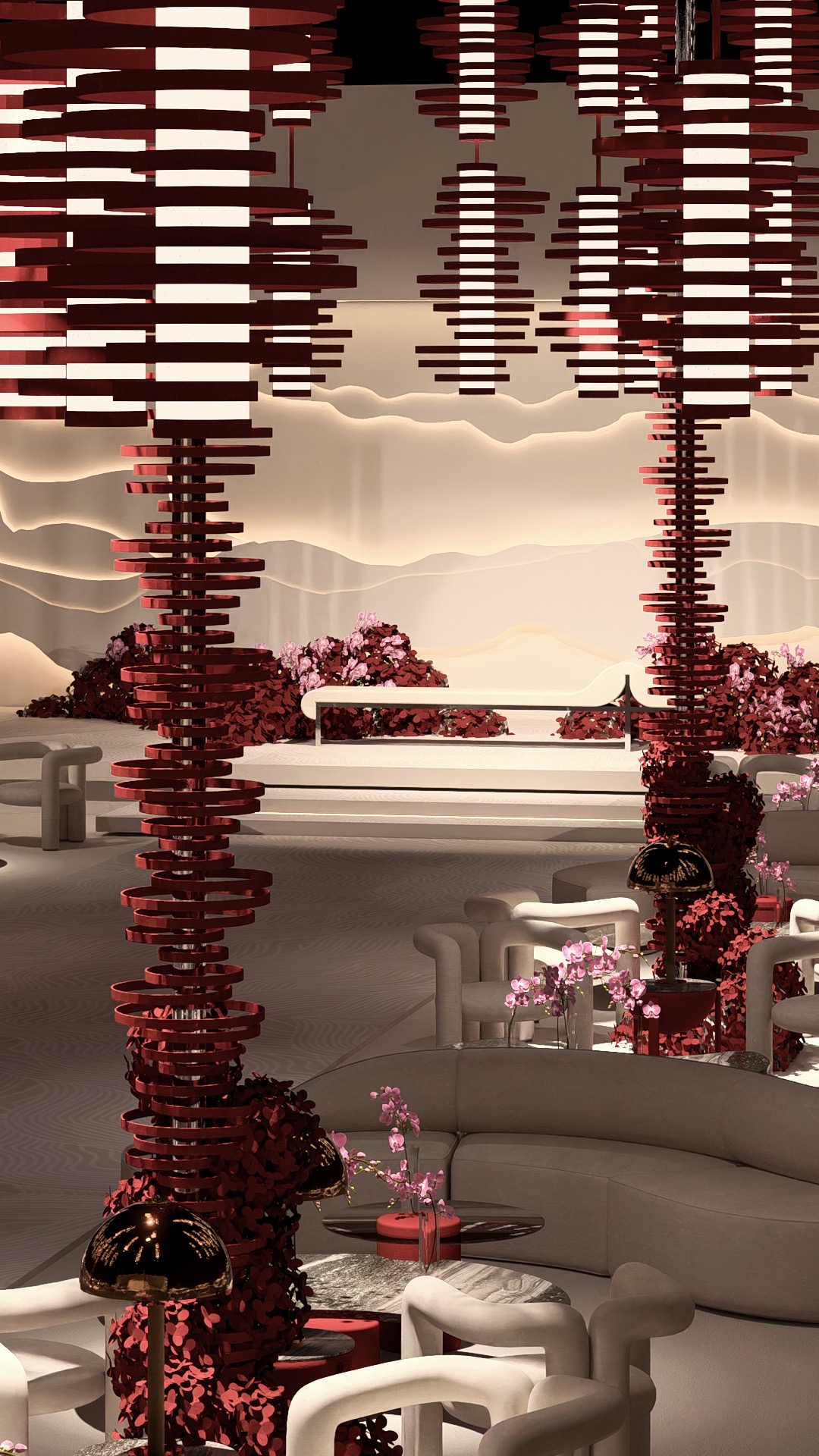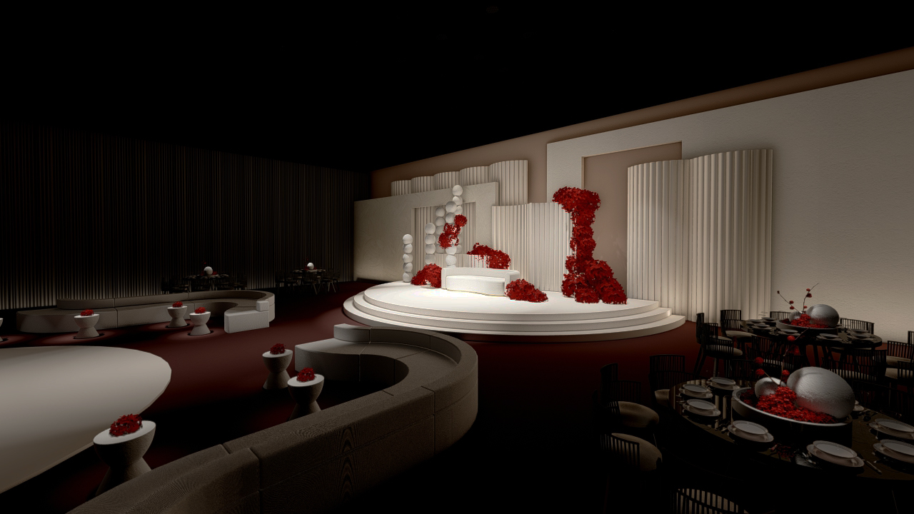 A Valentine’s-inspired luxury wedding reception, where deep reds, sculptural forms, and modern intimacy redefine romance. Rich velvet hues contrast with sleek stone surfaces, while moody lighting and statement decor create an atmosphere of passion and refinement. Designed to ignite attraction and evoke emotion, this concept transforms tradition into a bold, immersive celebration of love.