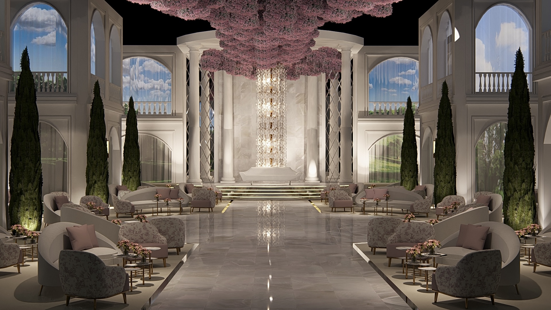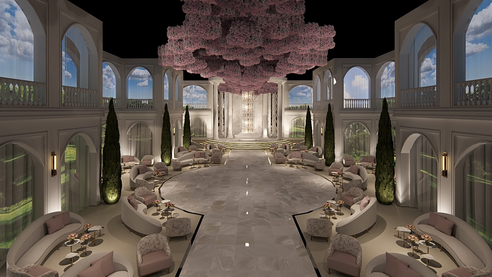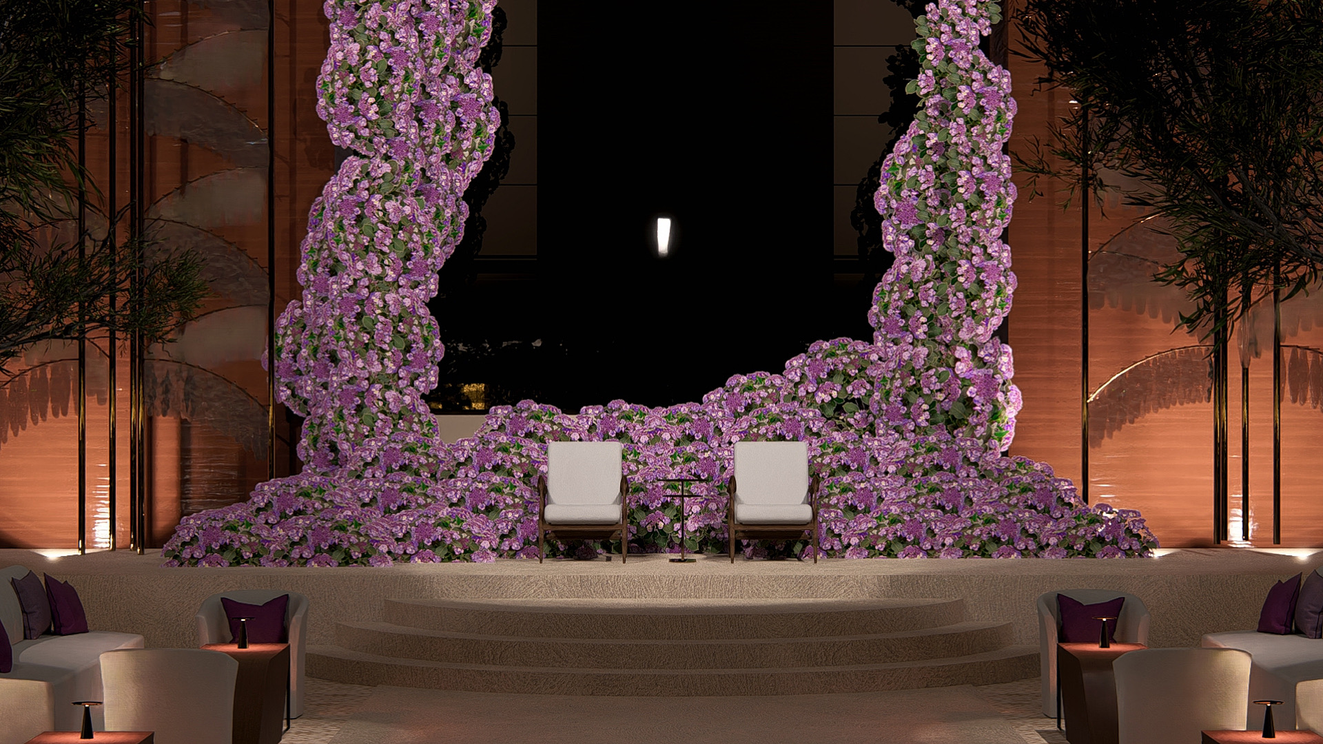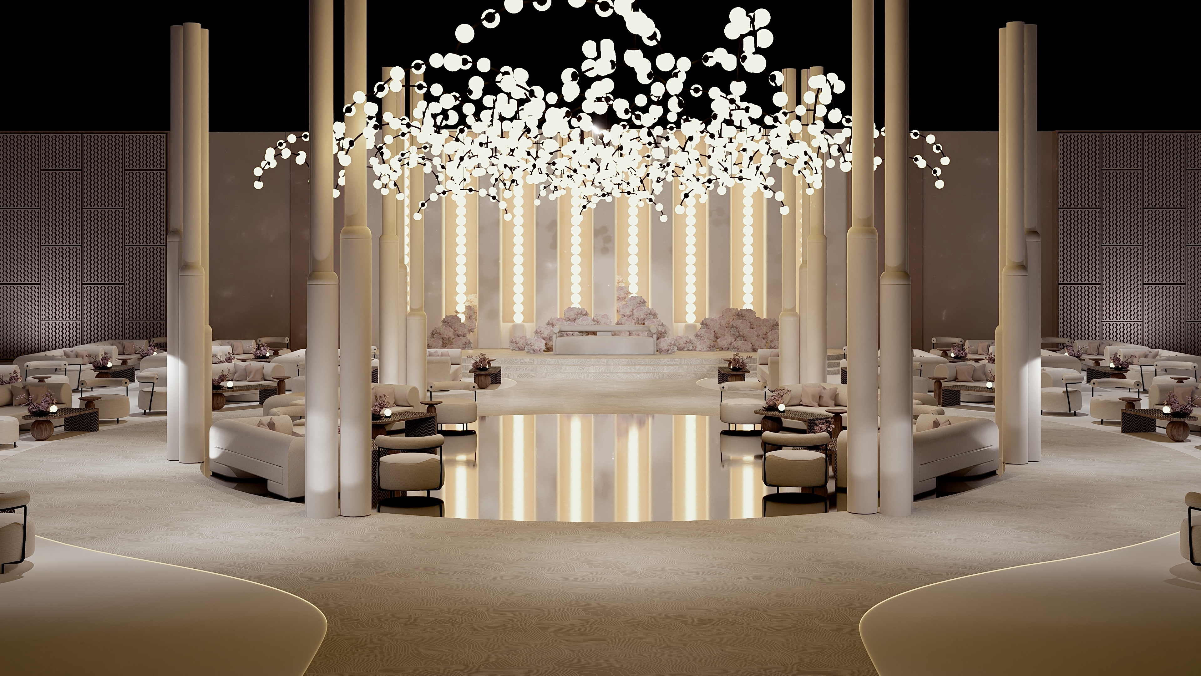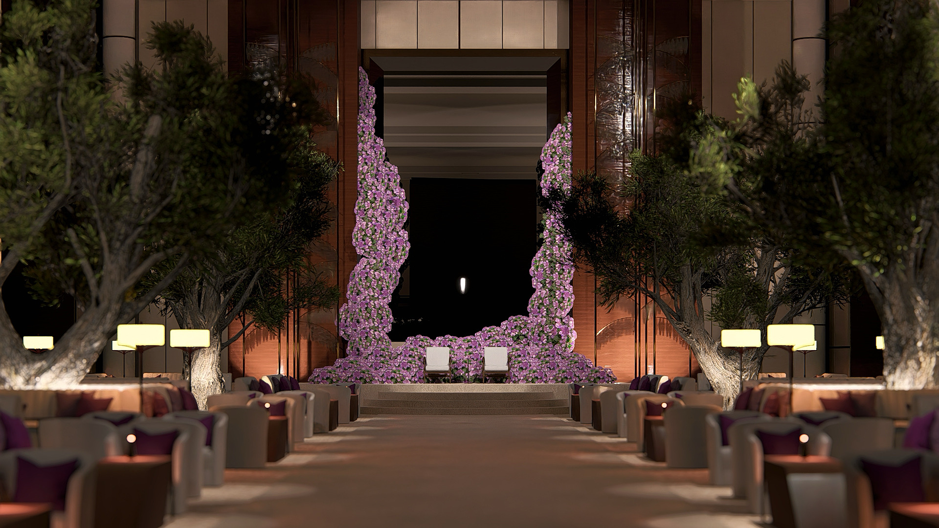Rigid yet soft, dark and light, straight yet curved, textured yet controlled—these are but glimpses into the soul of our conceptual creation, The Orb. This ethereal project suspends and elevates 3,000 luminous orbs, each one embraced by clouds of florals in hues of pink and cream. These floral clouds, delicate and tender, float amidst the rugged walls, creating a harmonious blend of contrasts.
