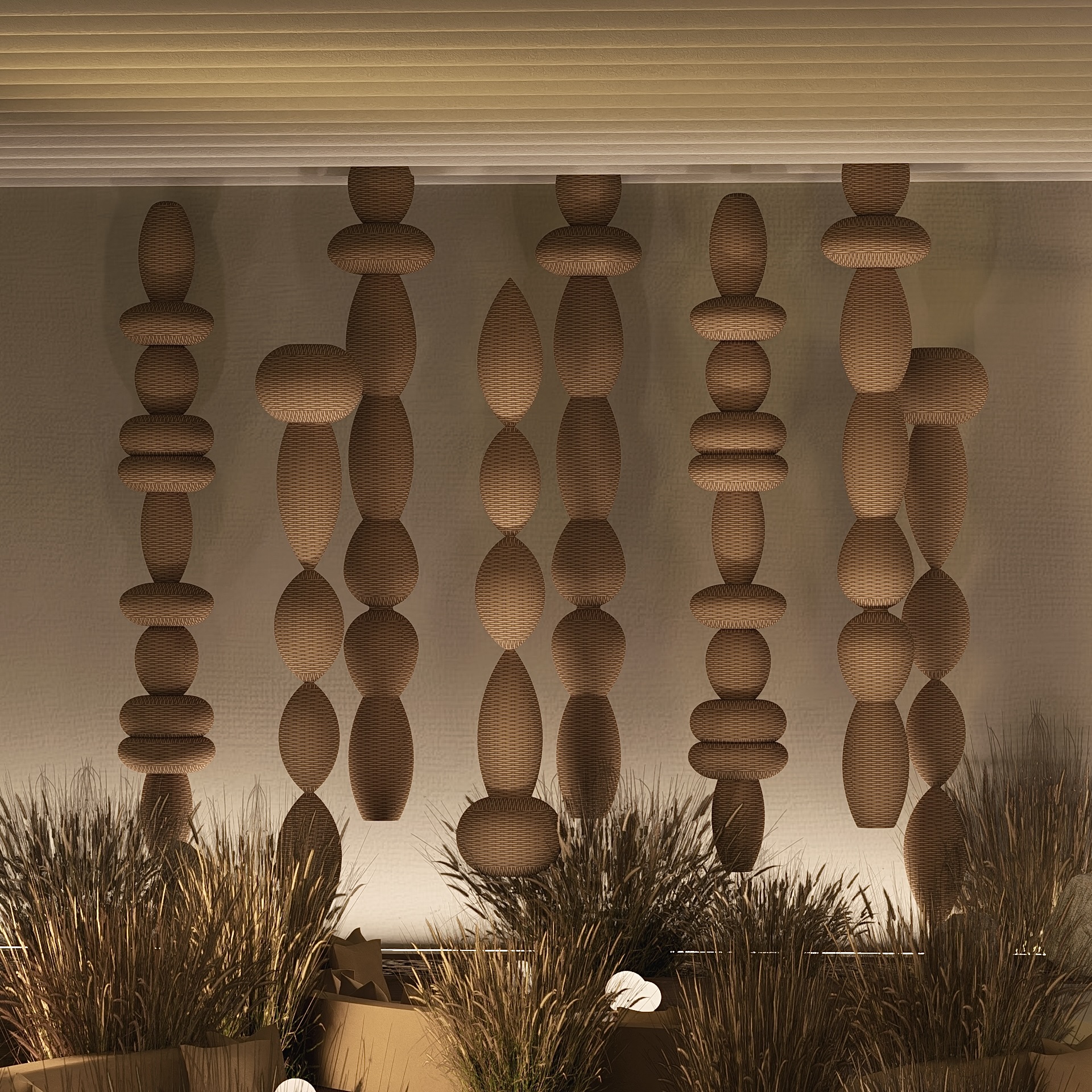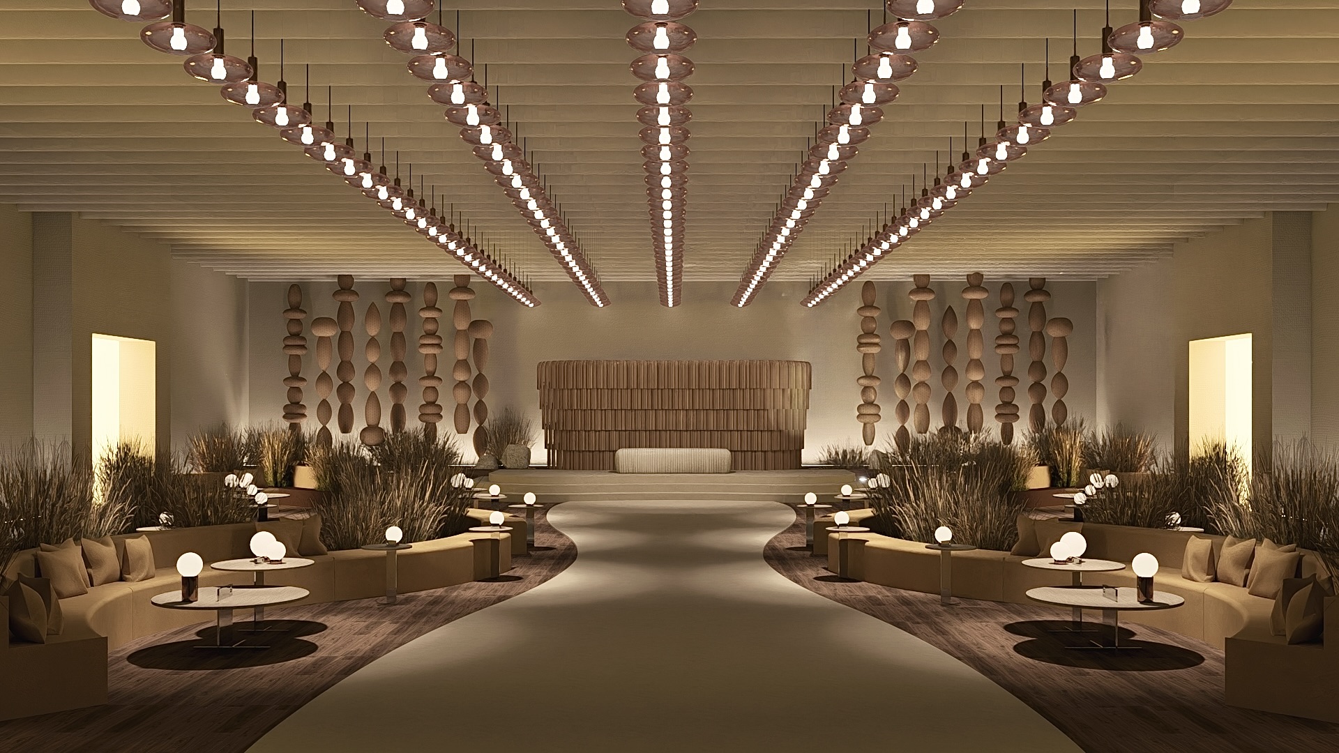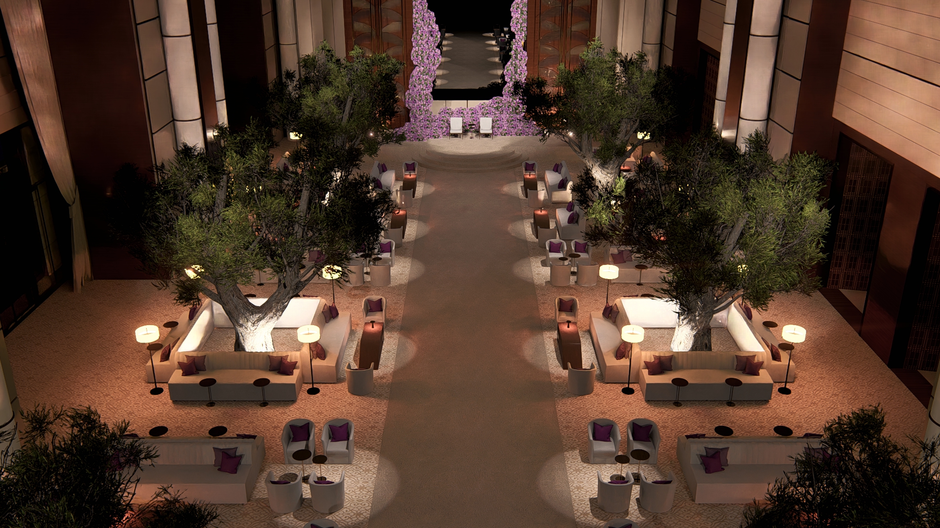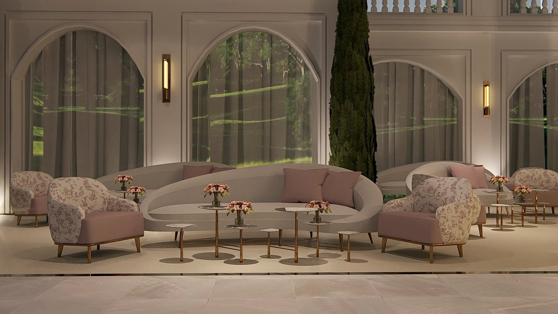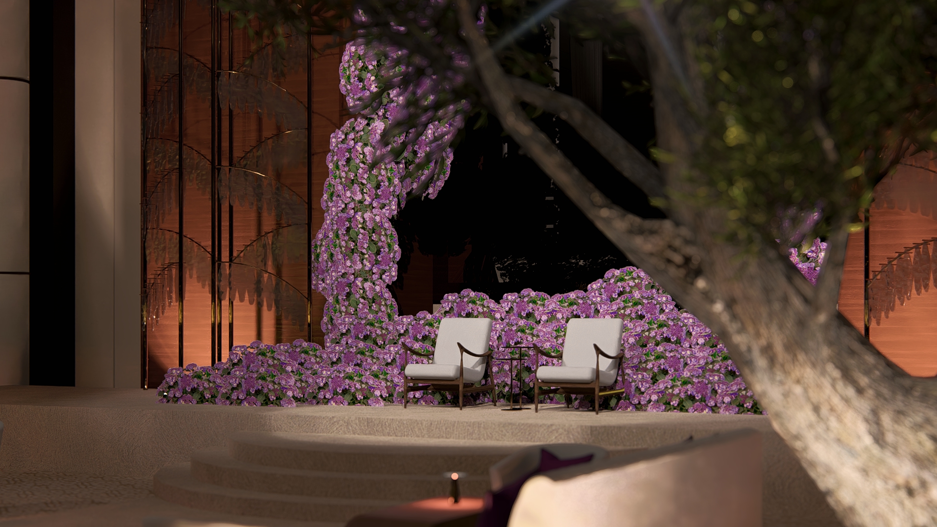 Rigid yet soft, dark and light, straight yet curved, textured yet controlled—these are but glimpses into the soul of our conceptual creation, The Orb. This ethereal project suspends and elevates 3,000 luminous orbs, each one embraced by clouds of florals in hues of pink and cream. These floral clouds, delicate and tender, float amidst the rugged walls, creating a harmonious blend of contrasts.