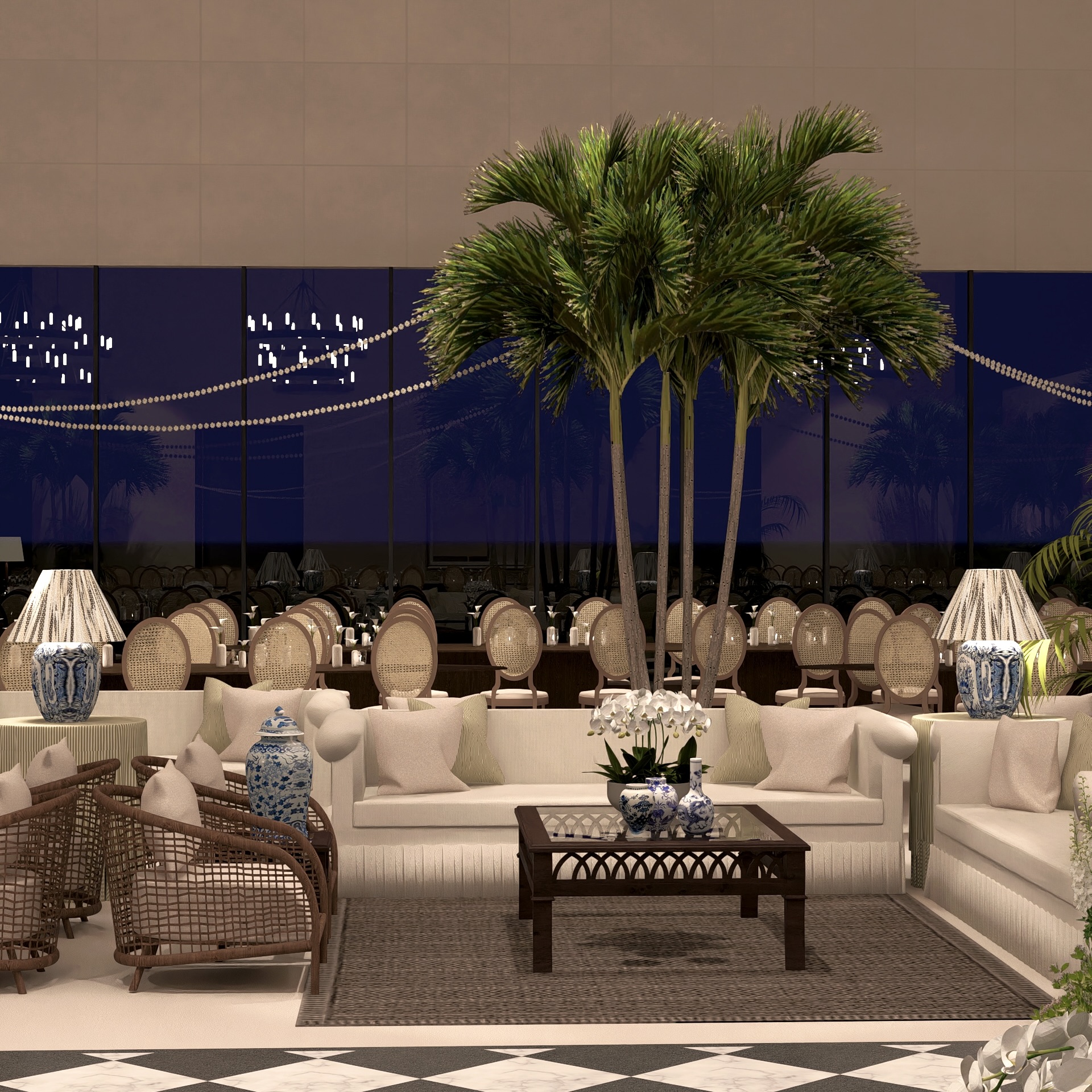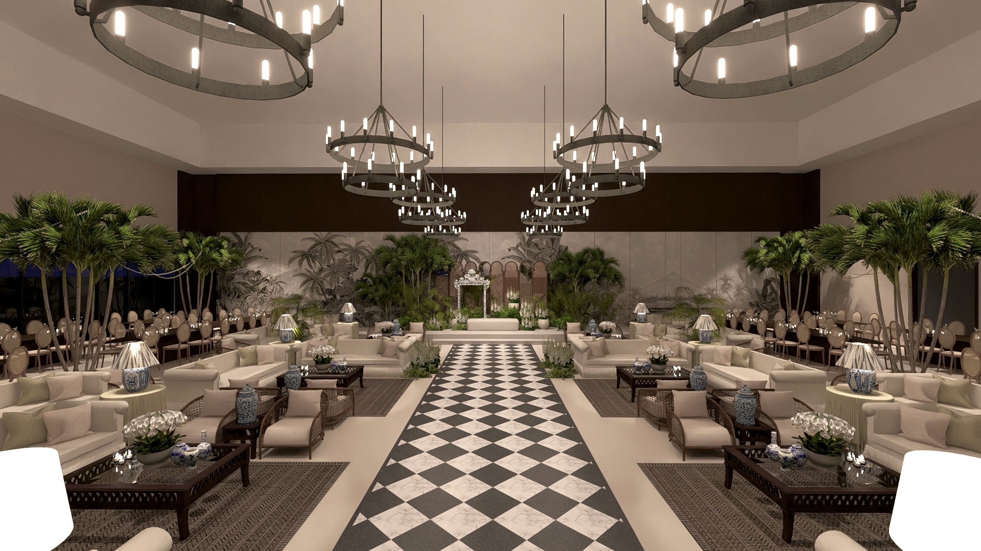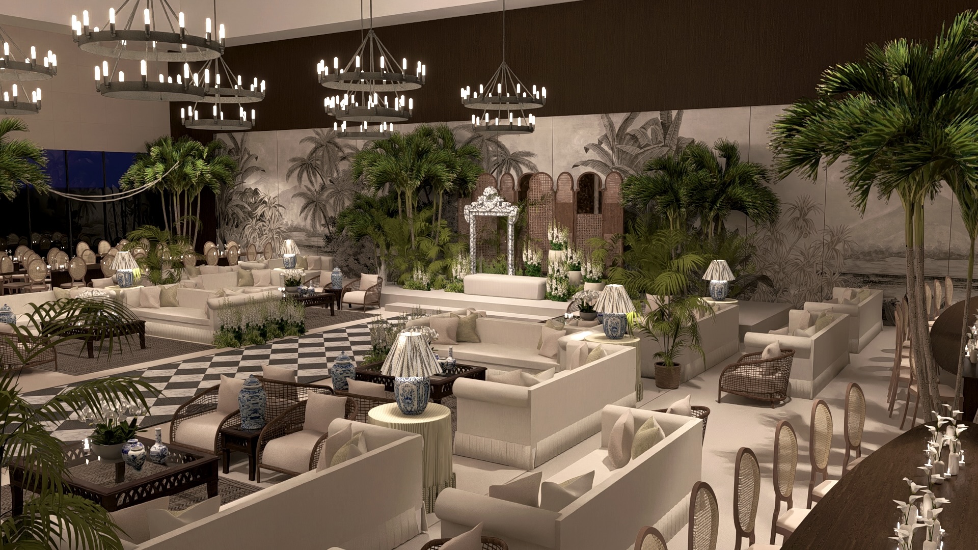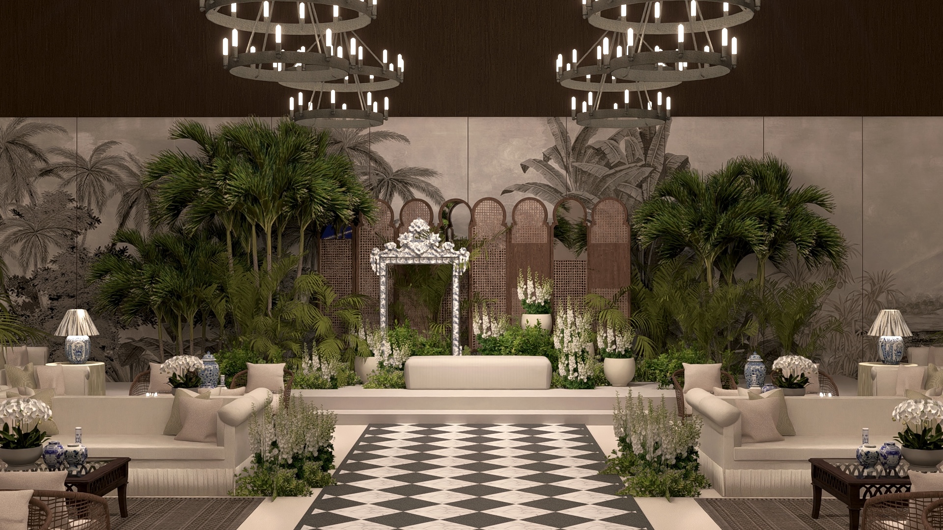 This wedding project, aptly named "Project Juliet," draws heavy inspiration from French Mediterranean spaces. The design features romantic balconies on the second floor, adding a touch of elegance to the overall aesthetic. The large roman arched doors and windows not only provide stunning views of the classical landscape, but also allow for ample natural light to fill the space. The color palette chosen for Project Juliet is dusty pink, a soft and delicate hue that adds to the romantic atmosphere. To add texture to the space, the design incorporates the use of a toile pattern. And finally, the focal point of the kosha is a massive capiz installation with integrated lighting, truly making it a sight to behold.