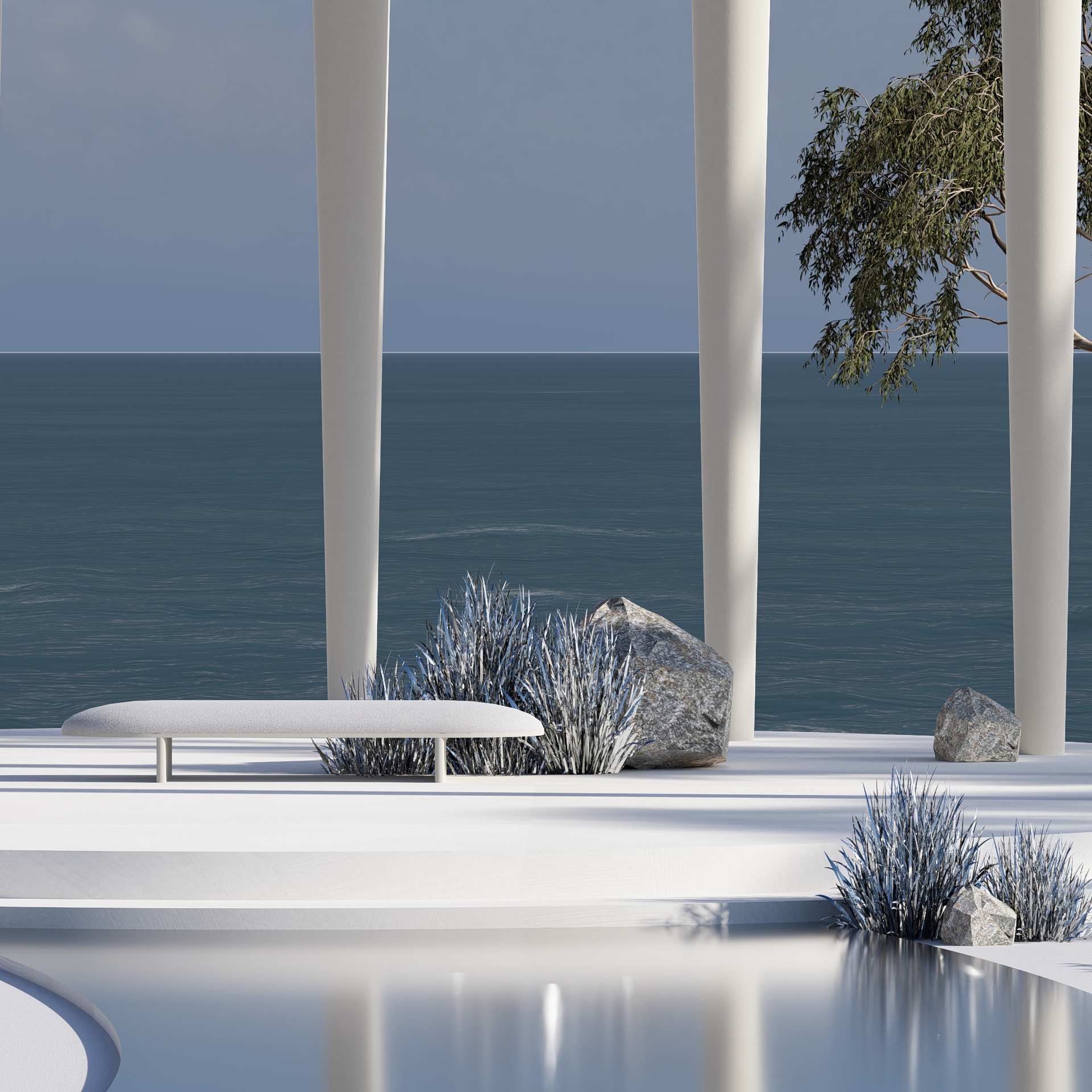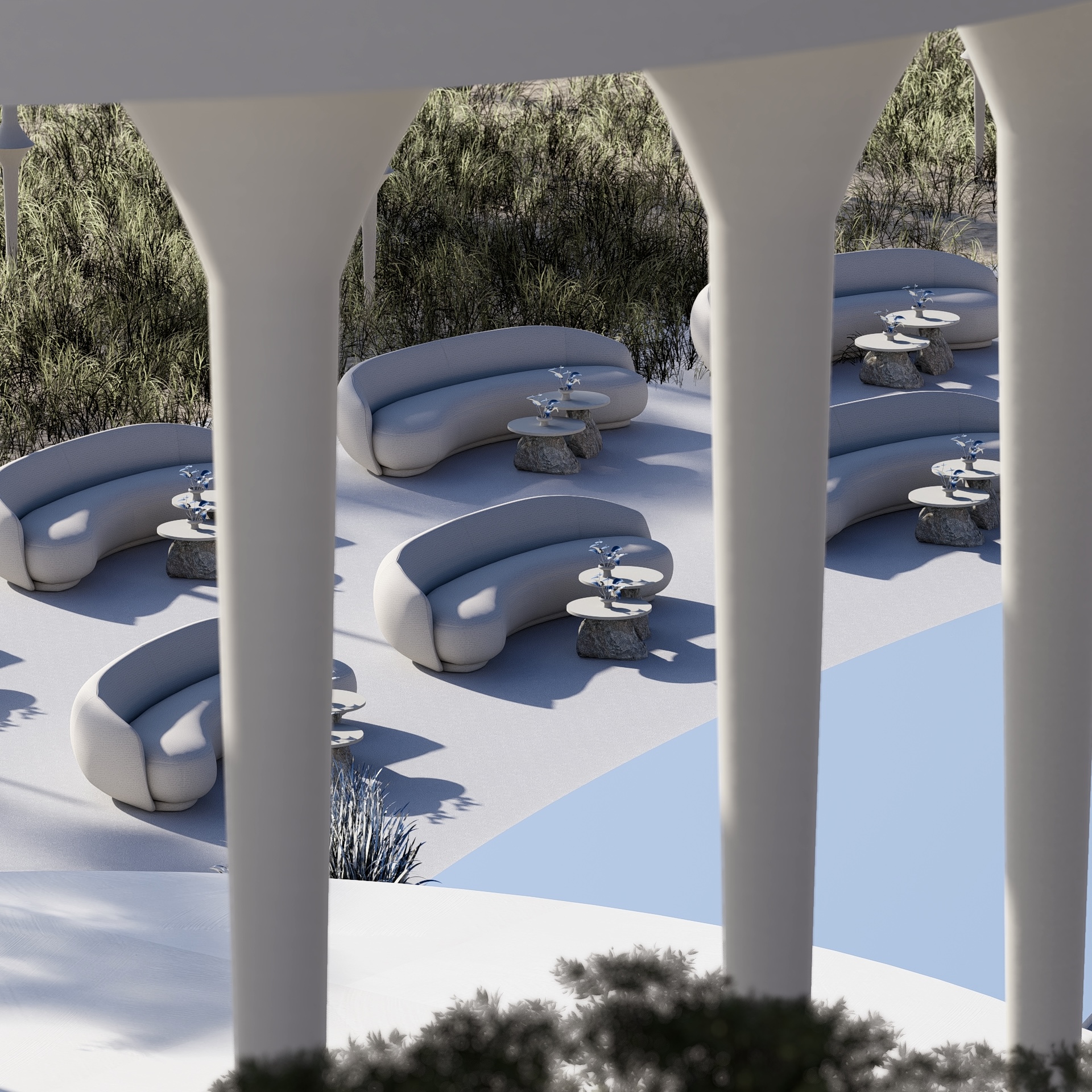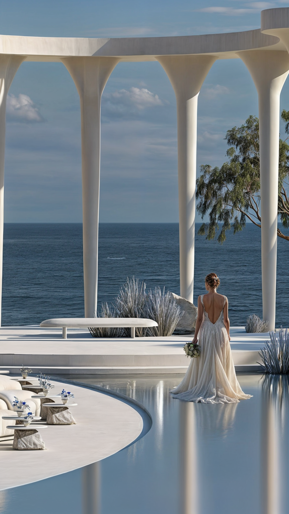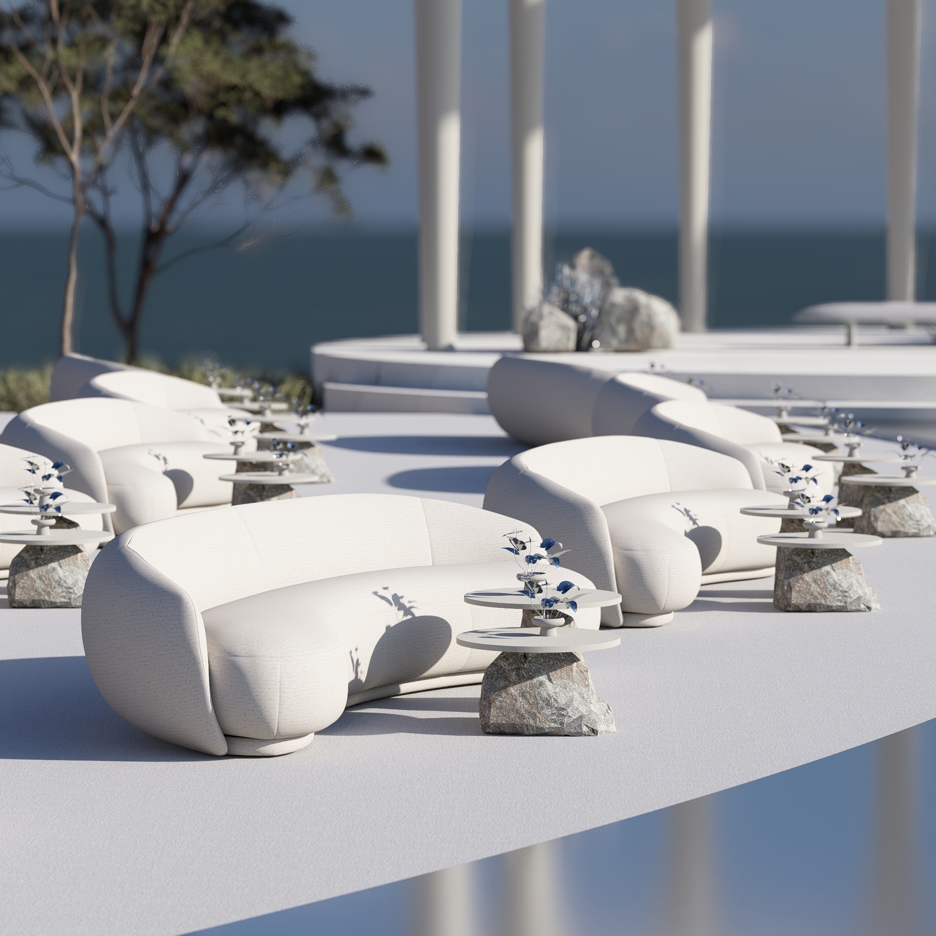 On a serene stretch of beach, a wedding unfolds in elegant simplicity, where beige tones blend seamlessly with the natural landscape. Stone coffee tables anchor the scene, their surfaces cool and earthy, while futuristic floral centerpieces rise like sculptures, catching the moon’s gentle light. Every detail speaks of a quiet harmony, capturing bliss, pureness, and timeless elegance.
