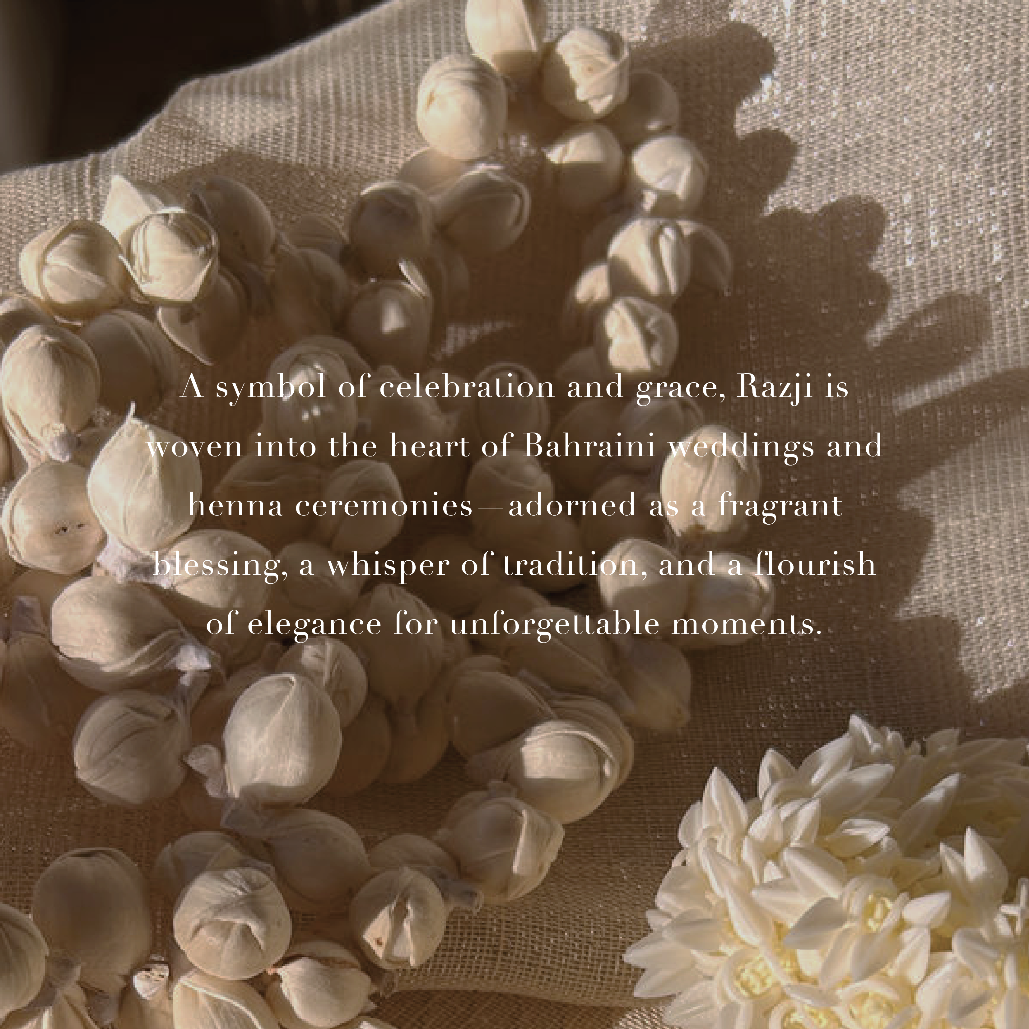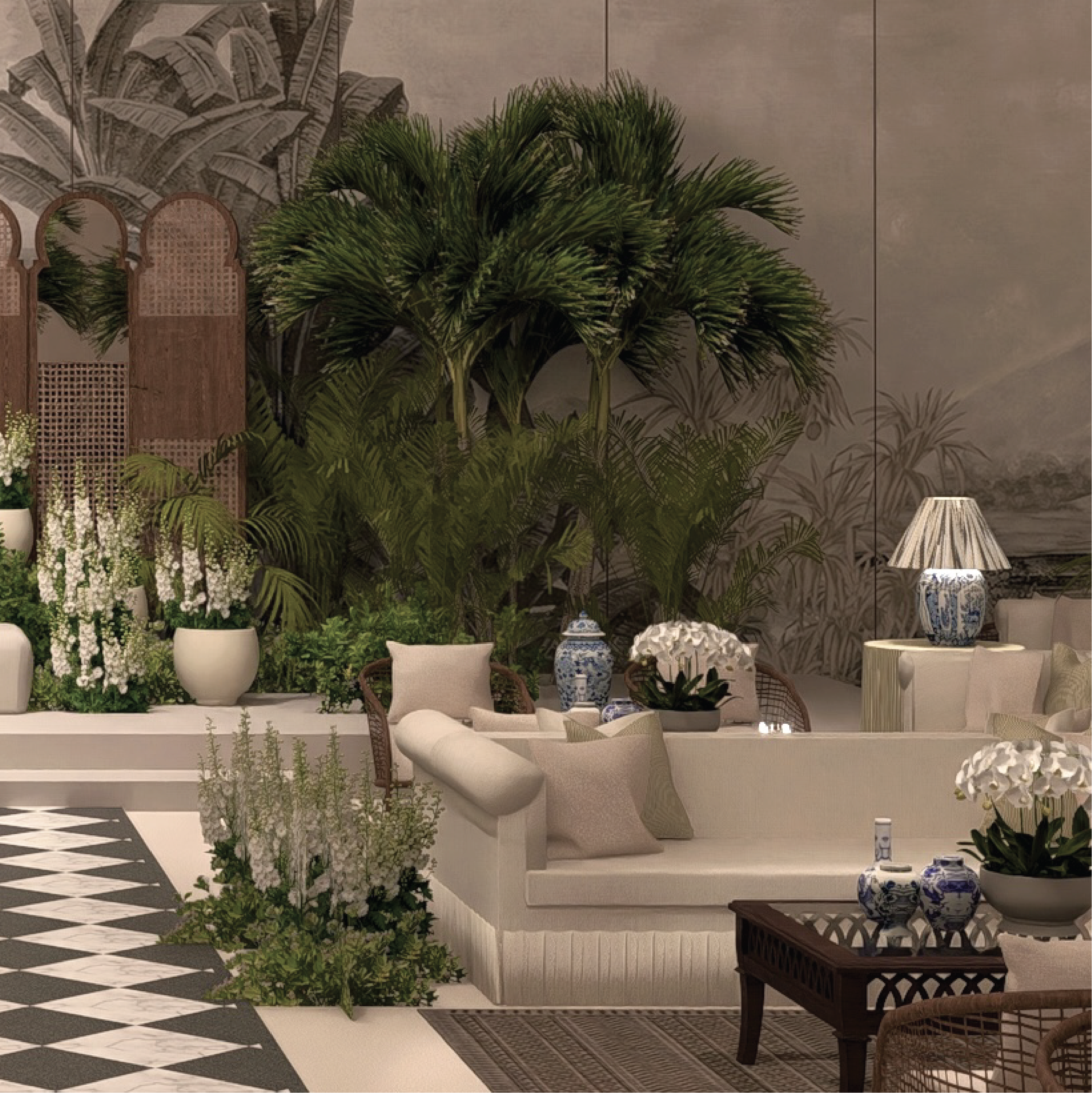 An intimate gathering styled by Events by Leaves, where British colonial charm meets Bahraini warmth. The atmosphere was rich with lush greens and cascading Razji blooms adorning every palm, creating a fragrant embrace. A checkered black-and-white walkway highlighted the bride’s path, framed by intricate toile art in antique frames and cane-backed paneling that exuded the timeless beauty of rattan and wood.