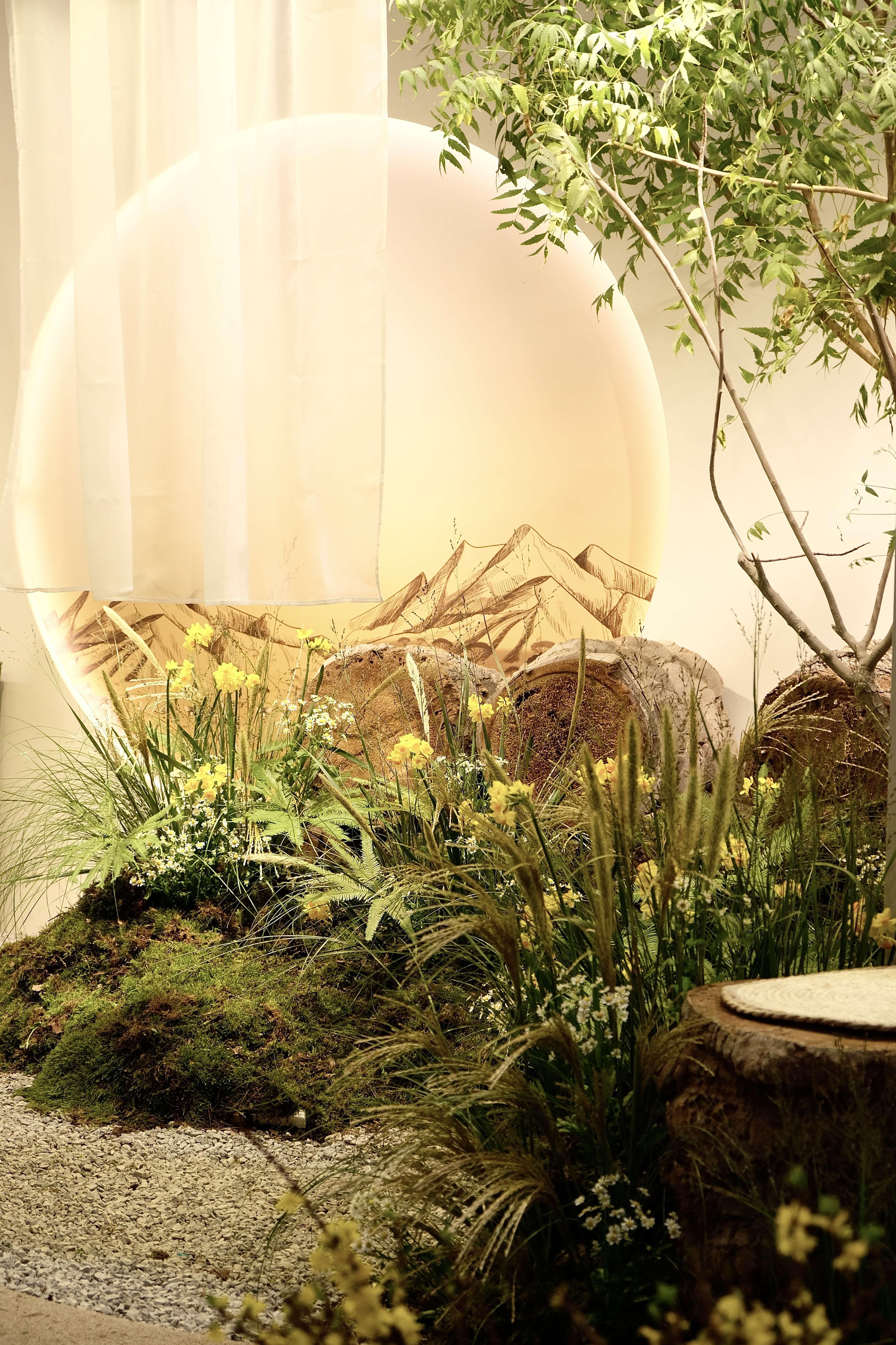 A minimalist Japandi-inspired booth, blending raw textures and organic forms into a refined spatial experience.
