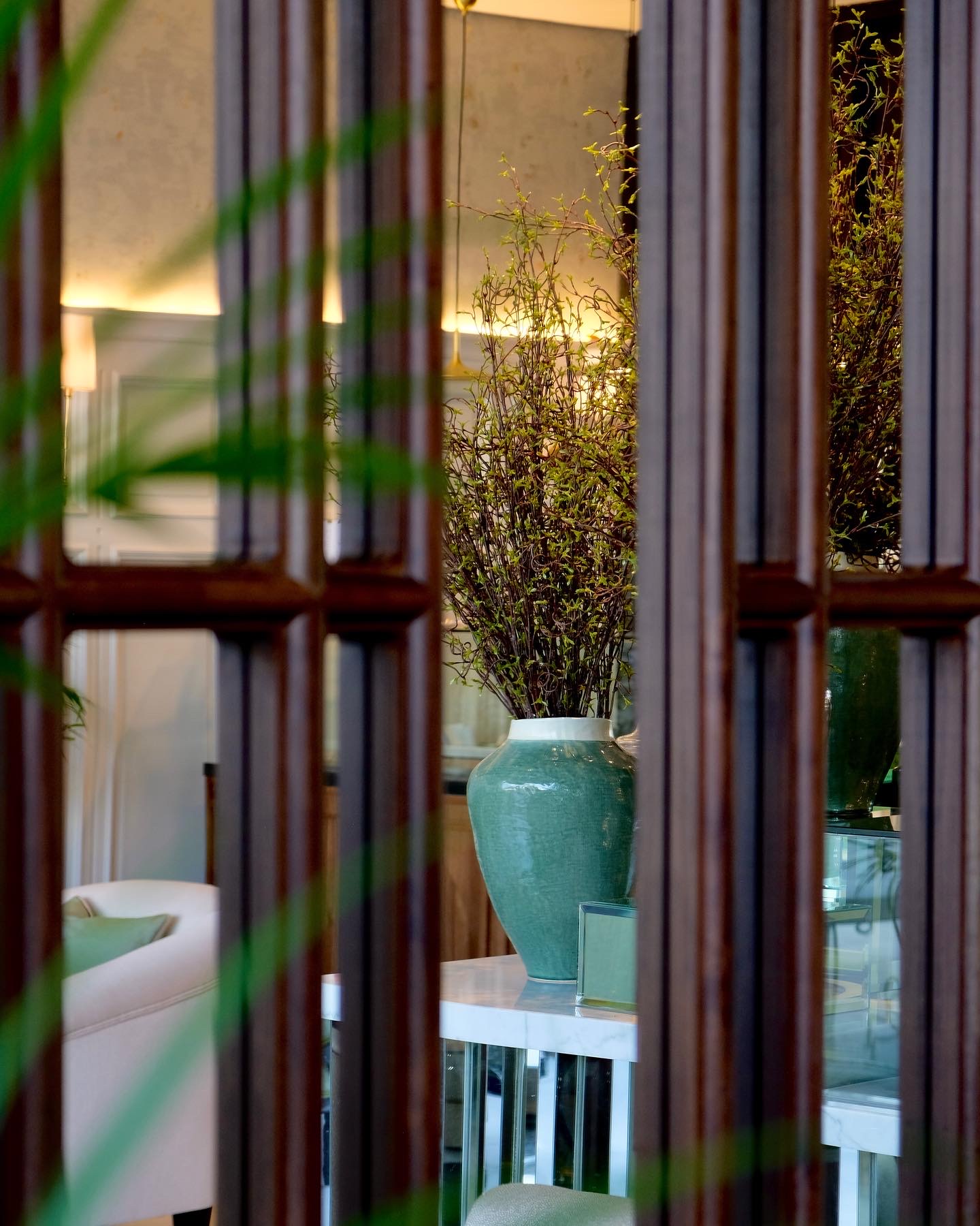 Leaves Café is a harmonious blend of British Colonial charm and contemporary elegance, designed to create an inviting yet refined atmosphere. The space is anchored by deep oak wood paneling, suspended greenery, and classic French wall moldings, bringing warmth and character. A custom-crafted solid oak partition with embedded mirrors subtly divides the café and retail area, maintaining openness and flow. Carefully curated furniture, layered textures, and ambient lighting complete the design, evoking a sense of comfort, sophistication, and timeless beauty.